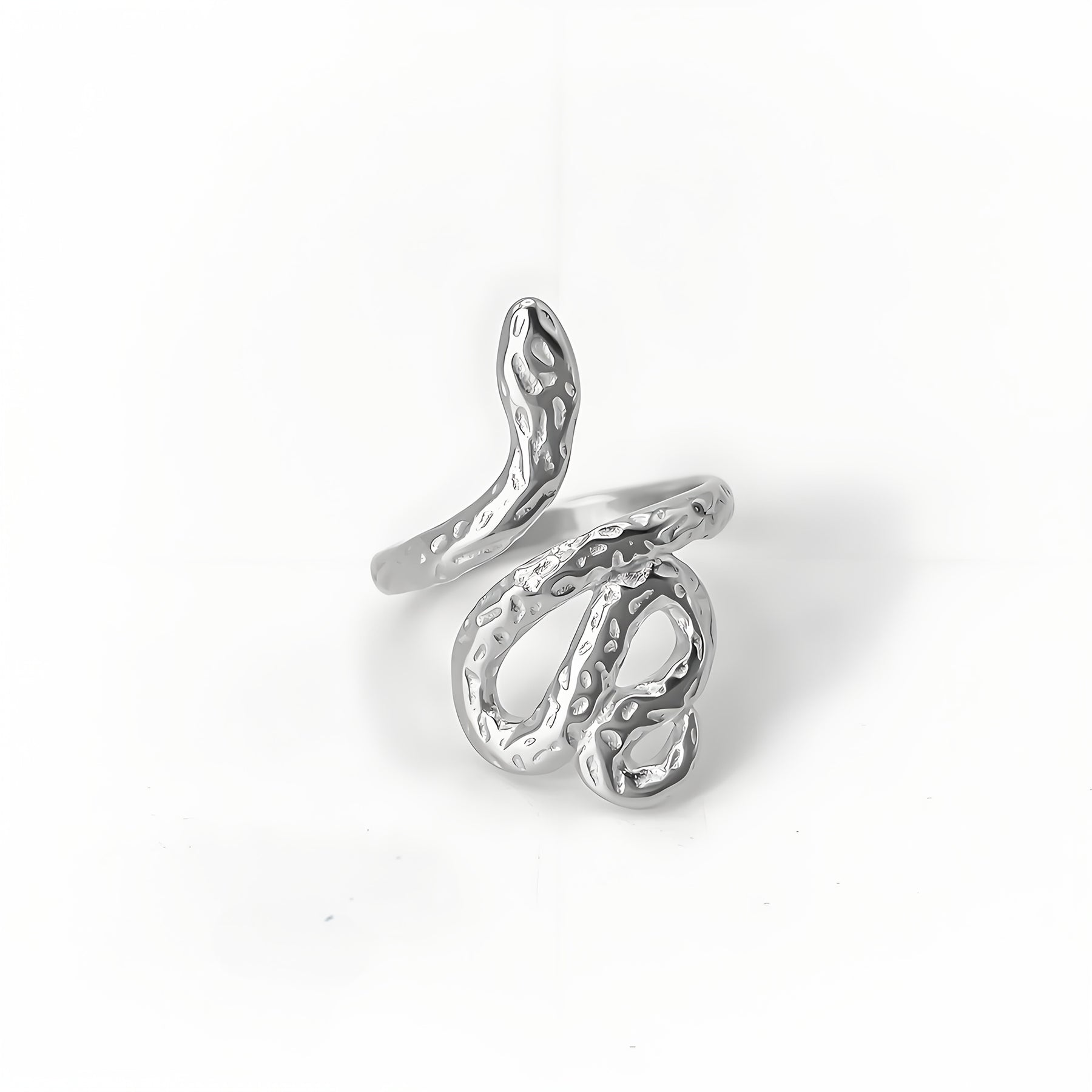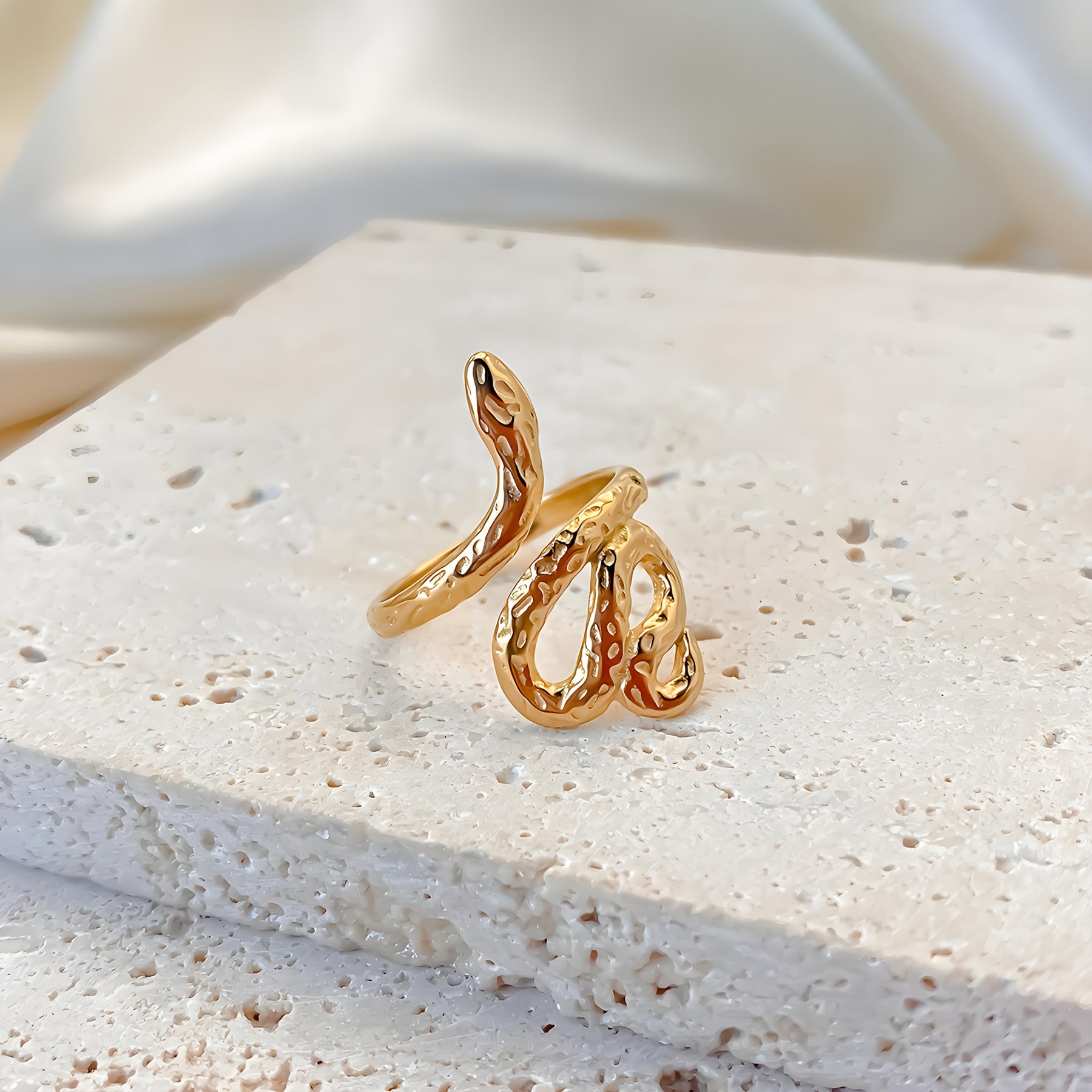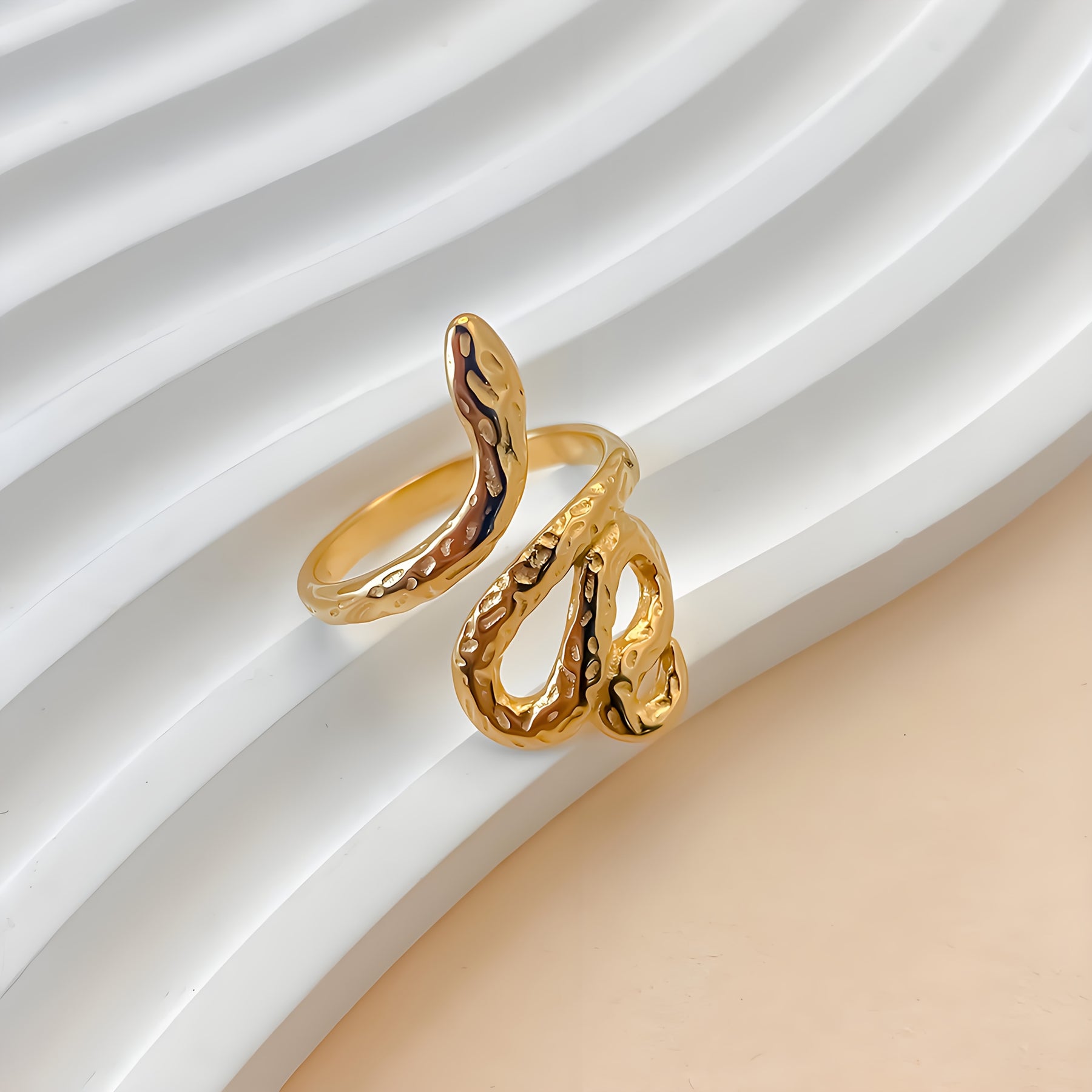Elevate your style with this stunning 18K gold plated snake ring, featuring a hammered texture design. This versatile piece is perfect for casual wear or special occasions.