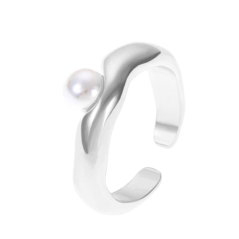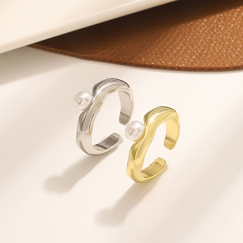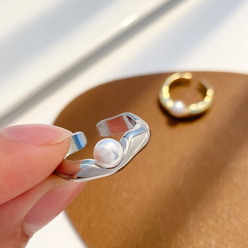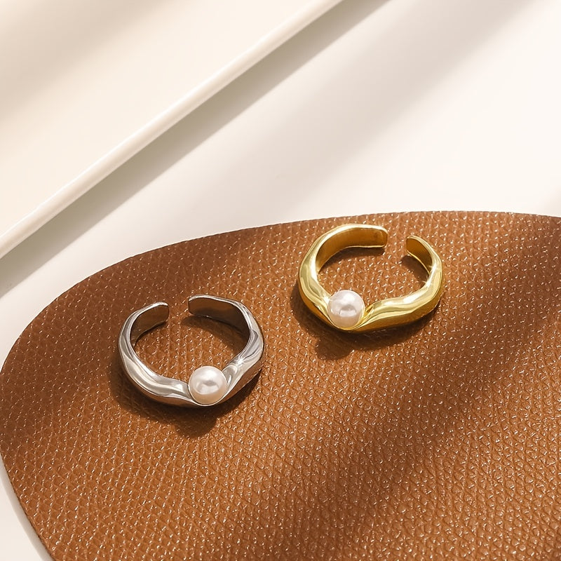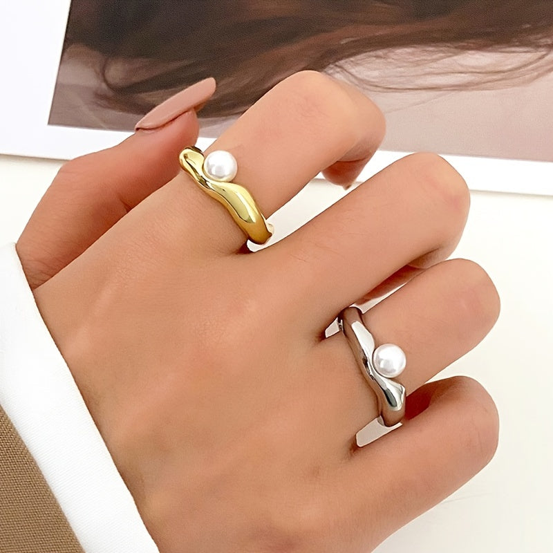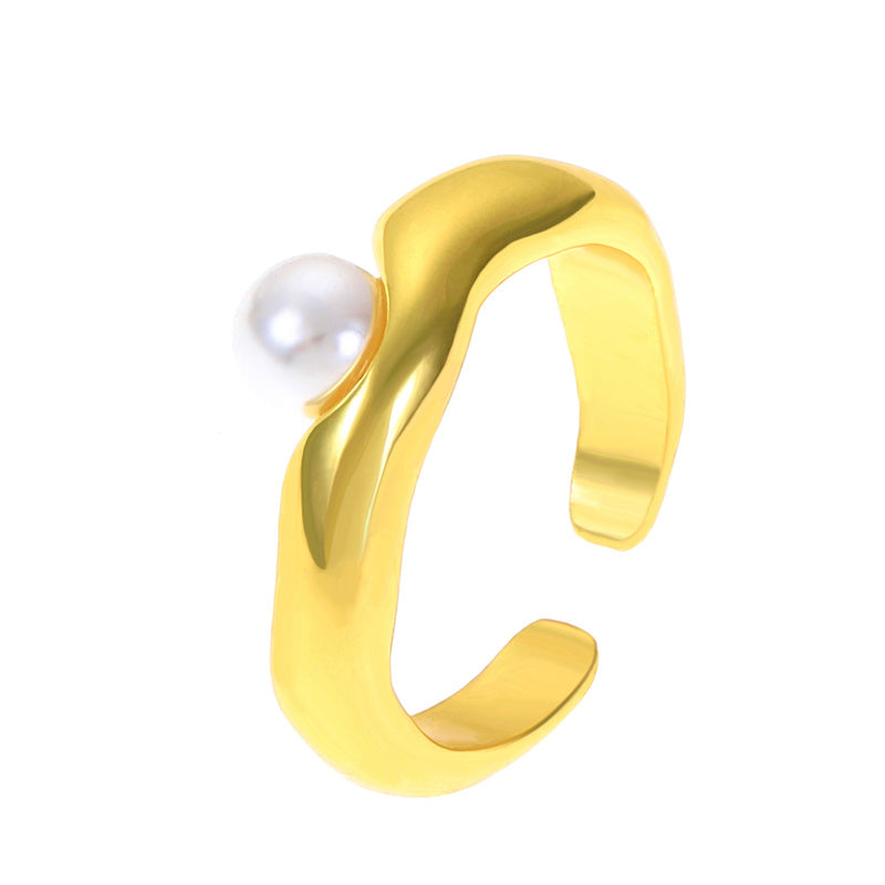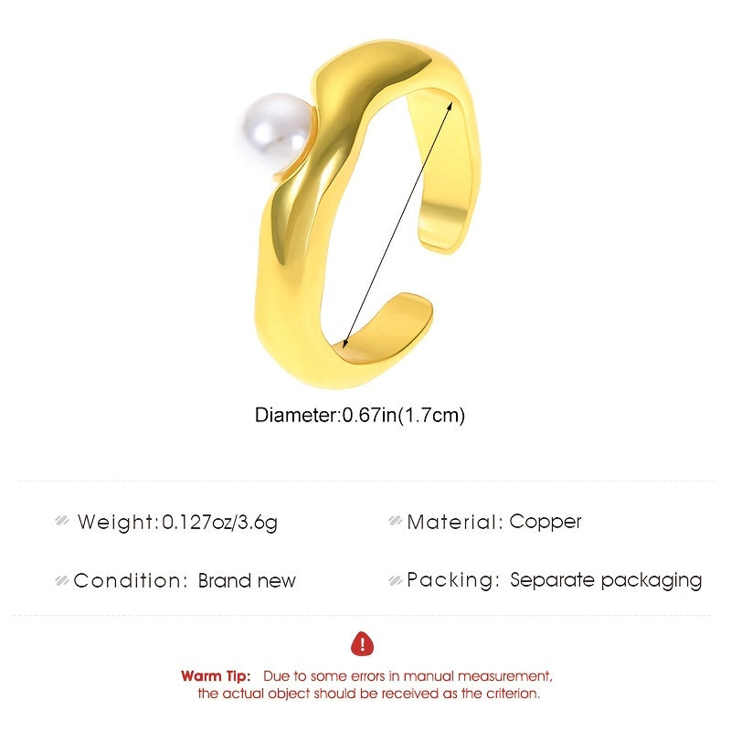 Add a touch of elegance to your outfit with this 18K plated copper band ring featuring inlaid faux pearls. Perfect for parties and events.