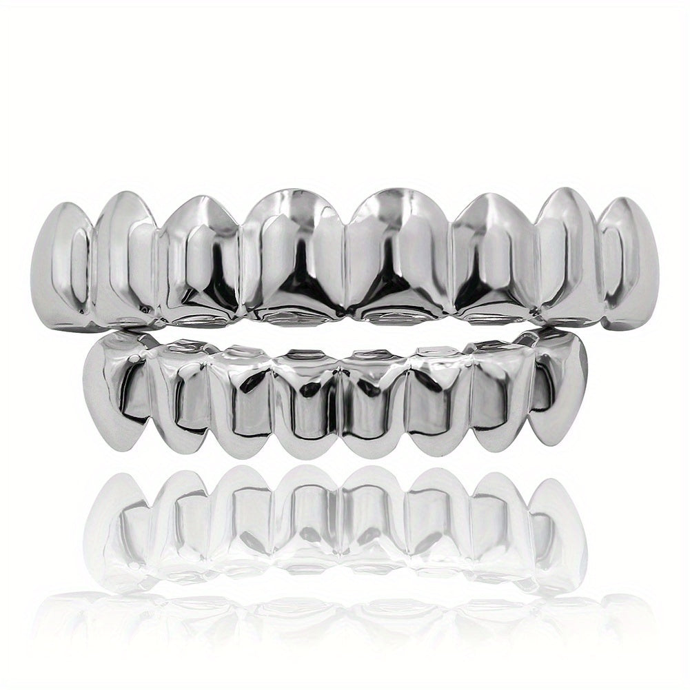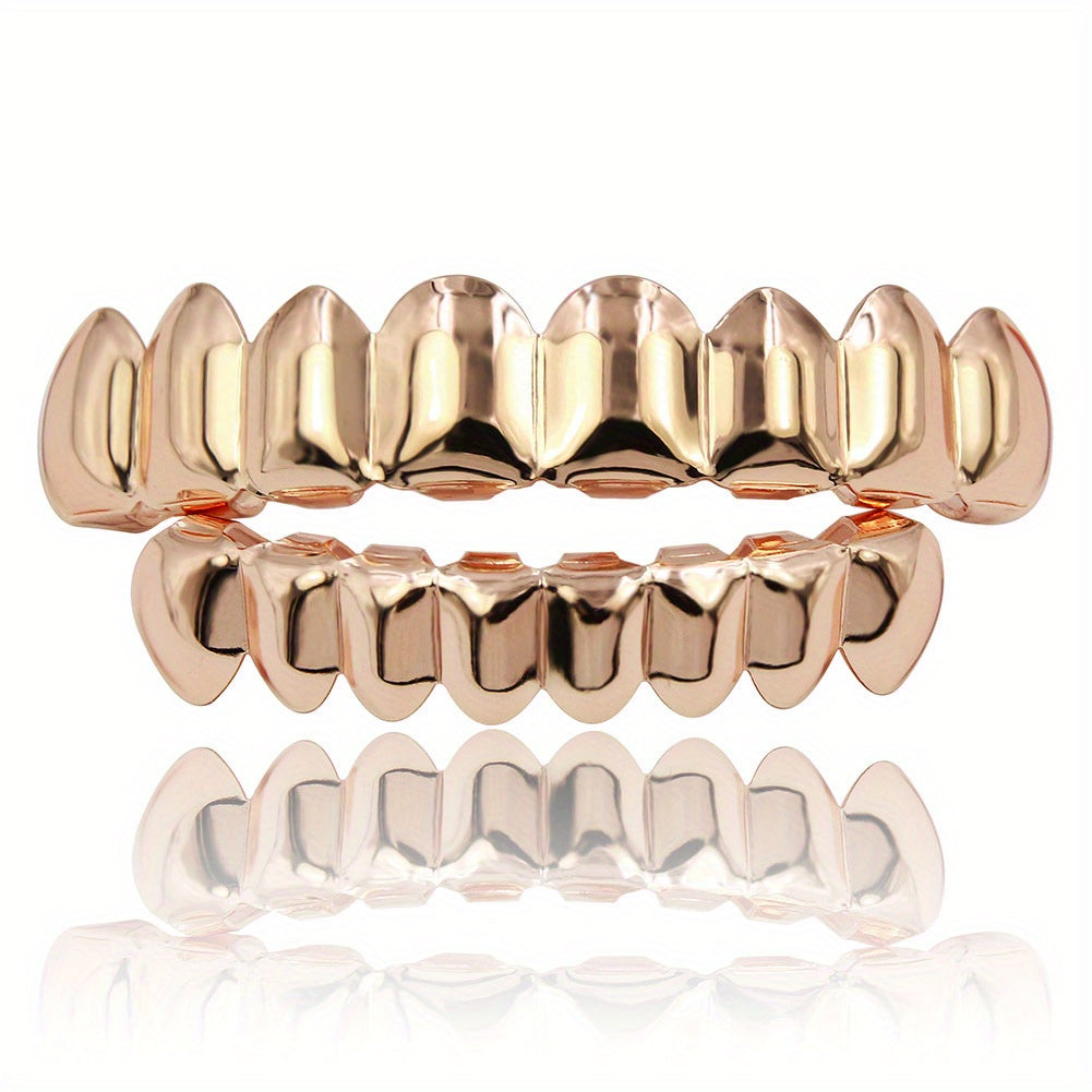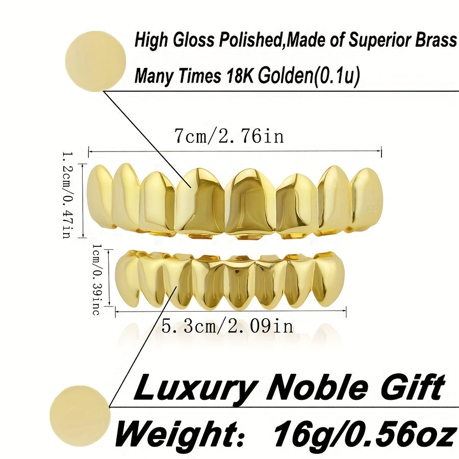 Add some bling to your smile with these hip hop grillz. Plated in 18K gold, this set includes top and bottom teeth caps for a stylish look.