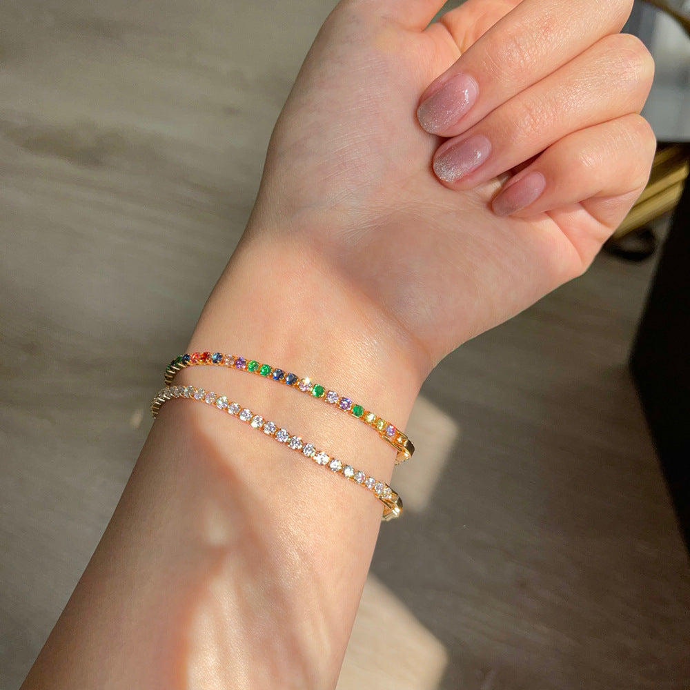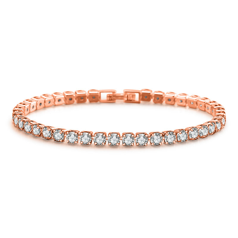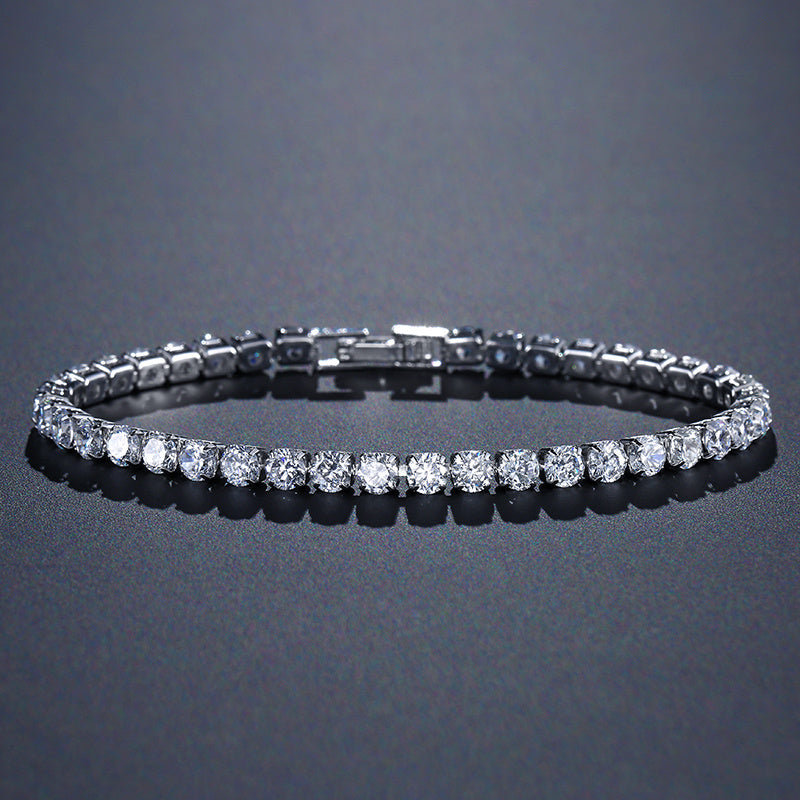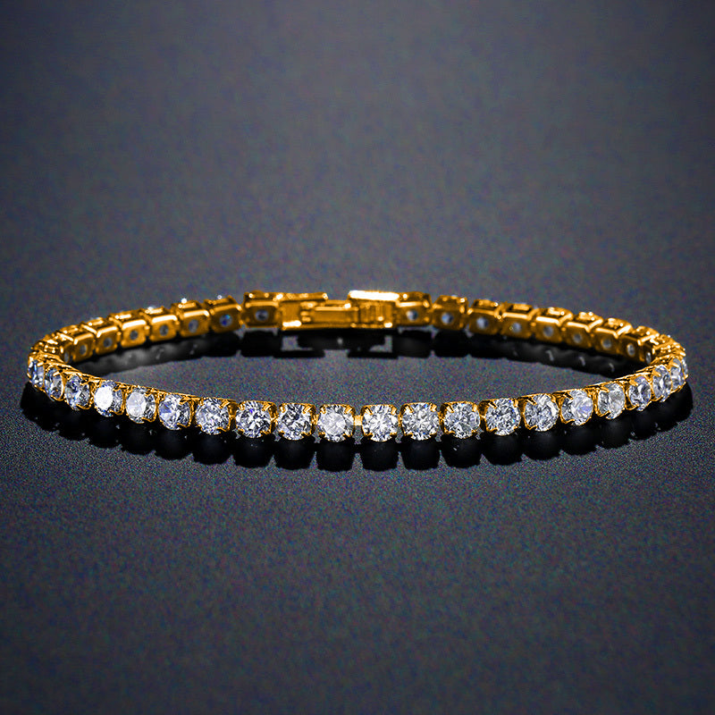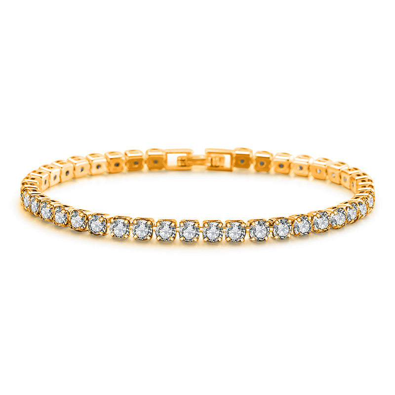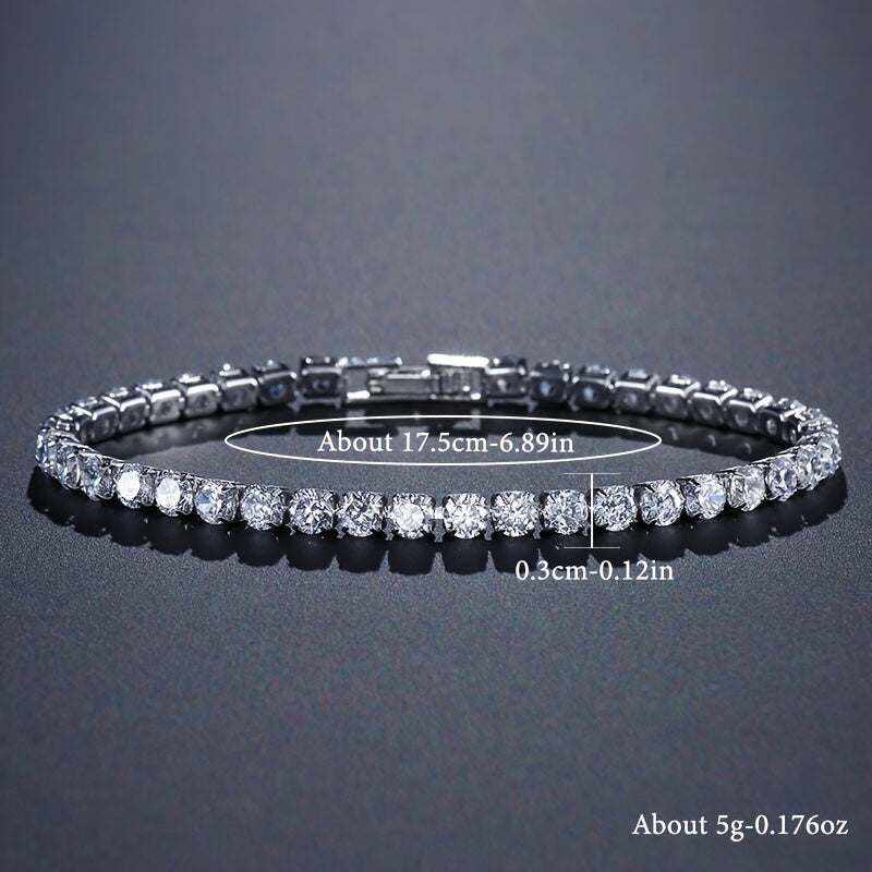 Elegant tennis bracelet featuring full round cut zircon stones. Made of copper with 18K gold plating. Perfect hand accessory for any occasion.