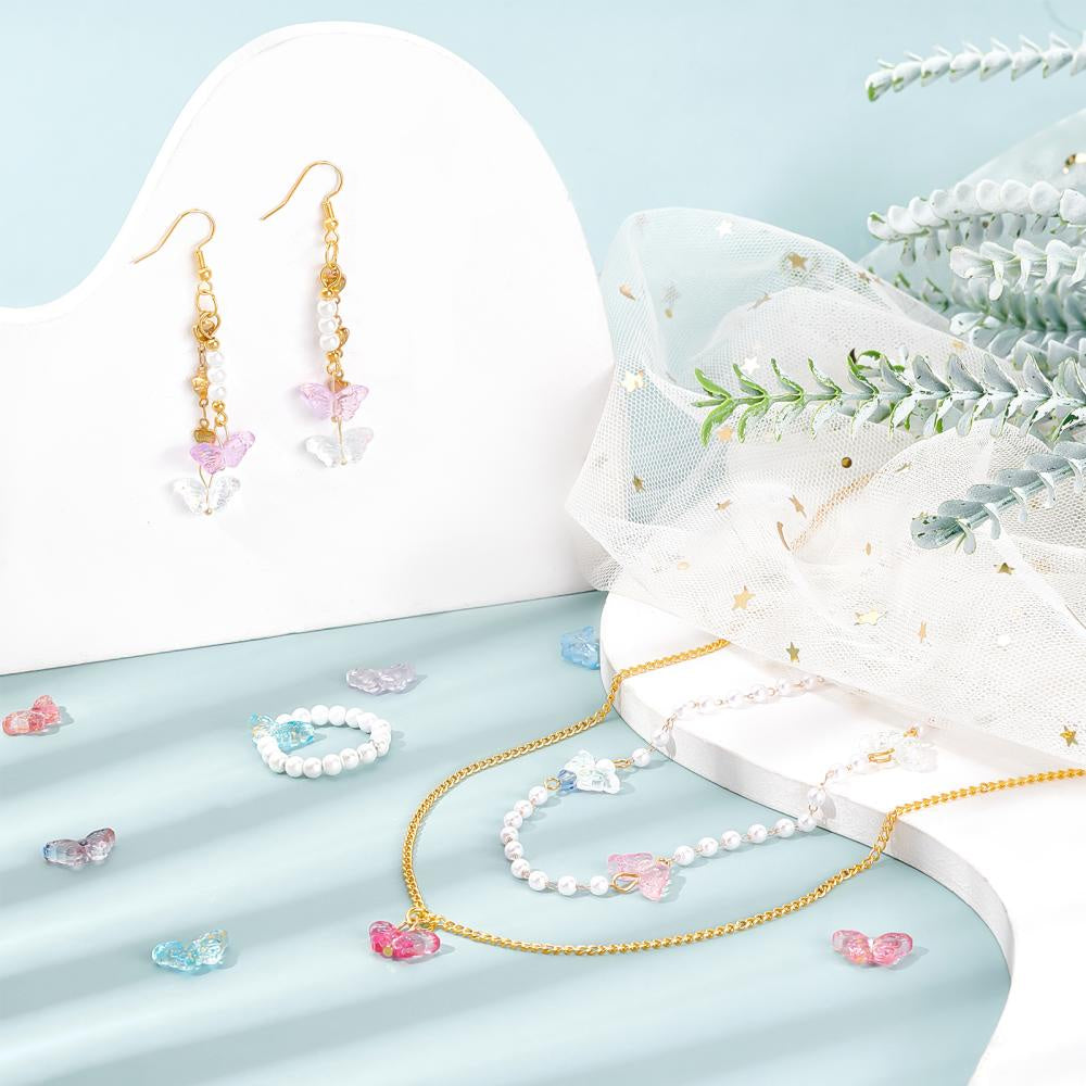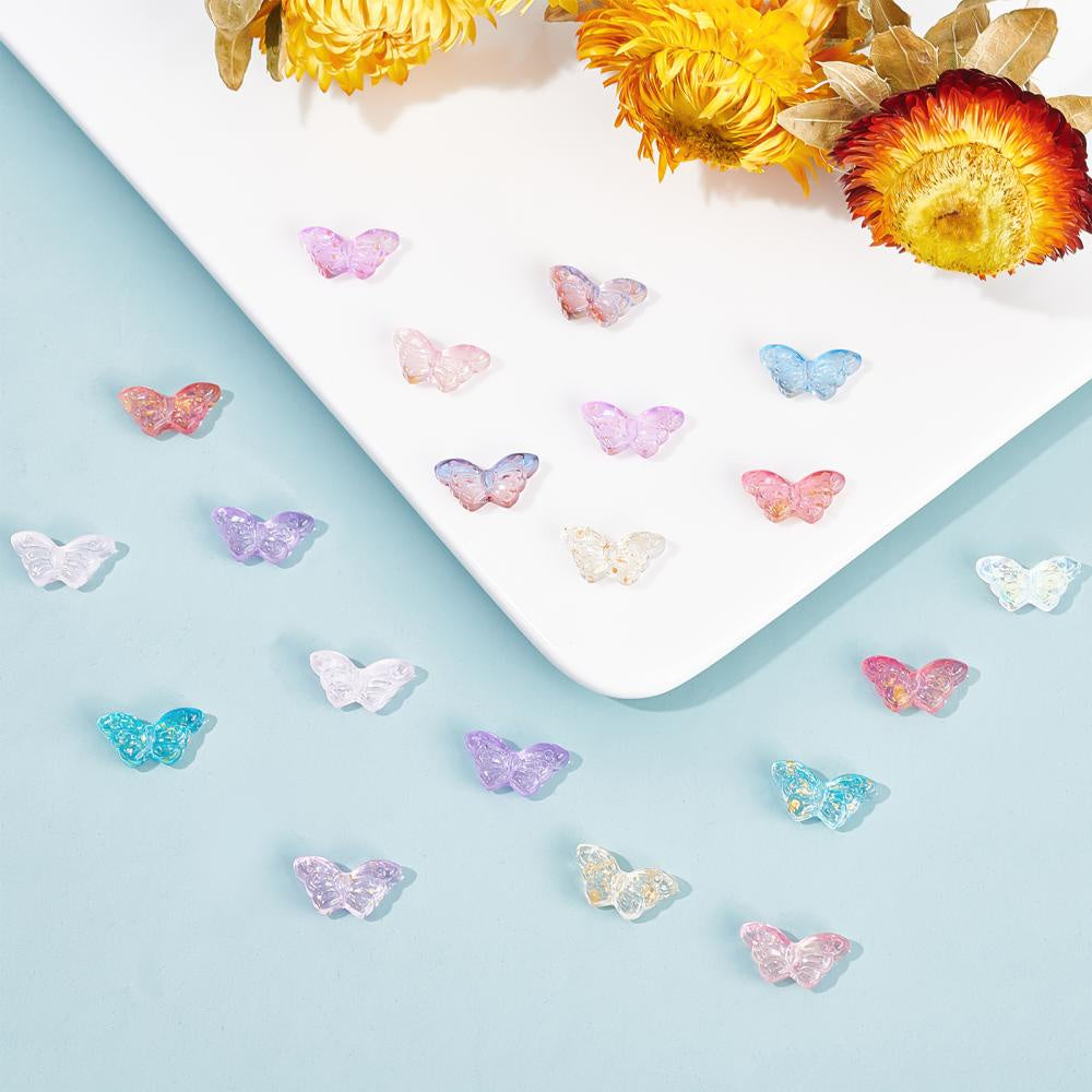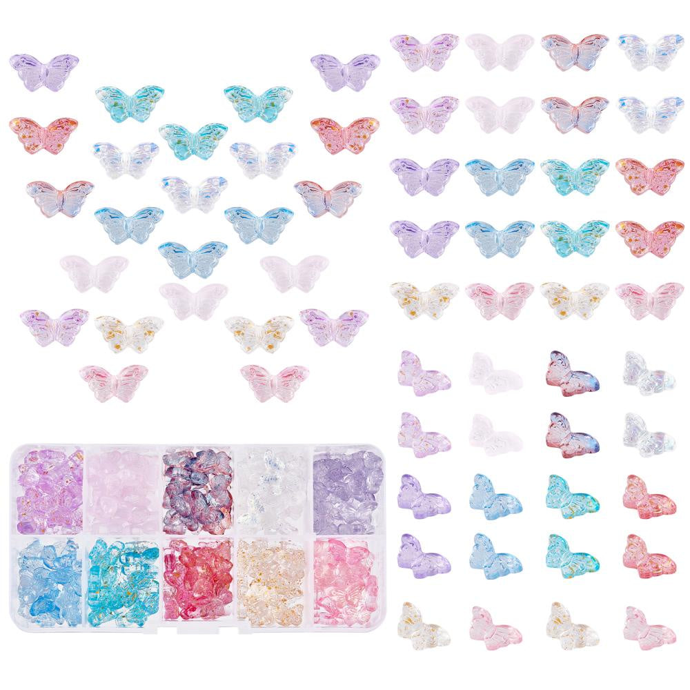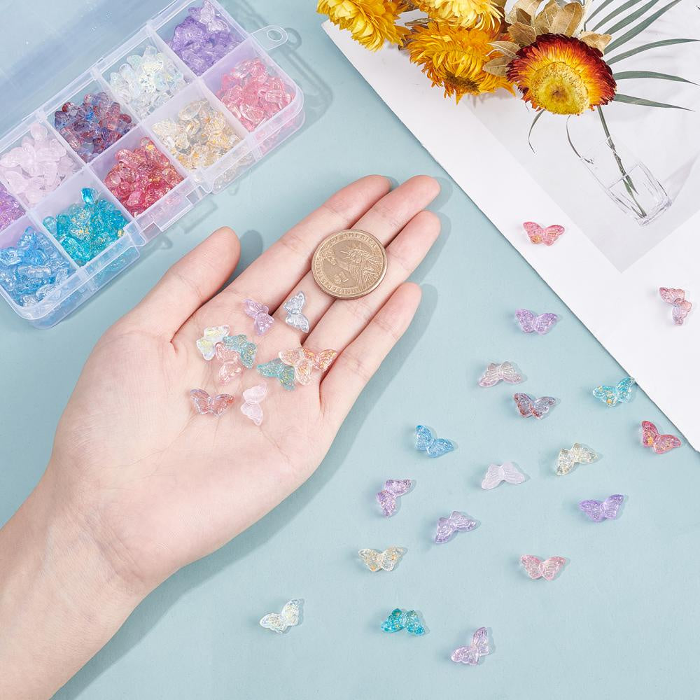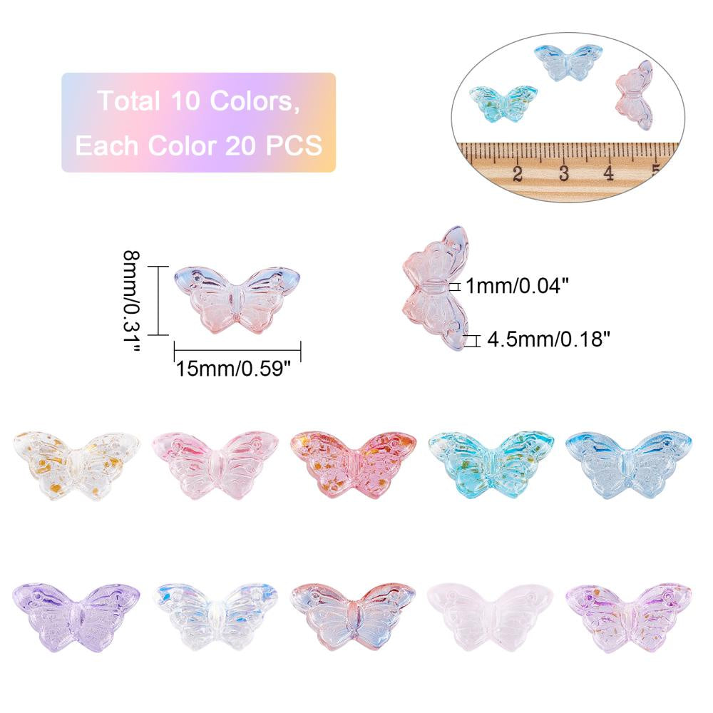 Enhance your jewelry making with this set of 200 butterfly glass beads. Each bead is spray painted with glitter powder in 10 different colors, measuring 8x15x4.5mm. Perfect for adding a touch of sparkle to your designs!