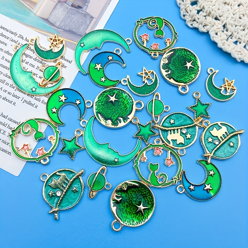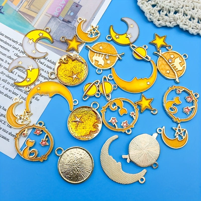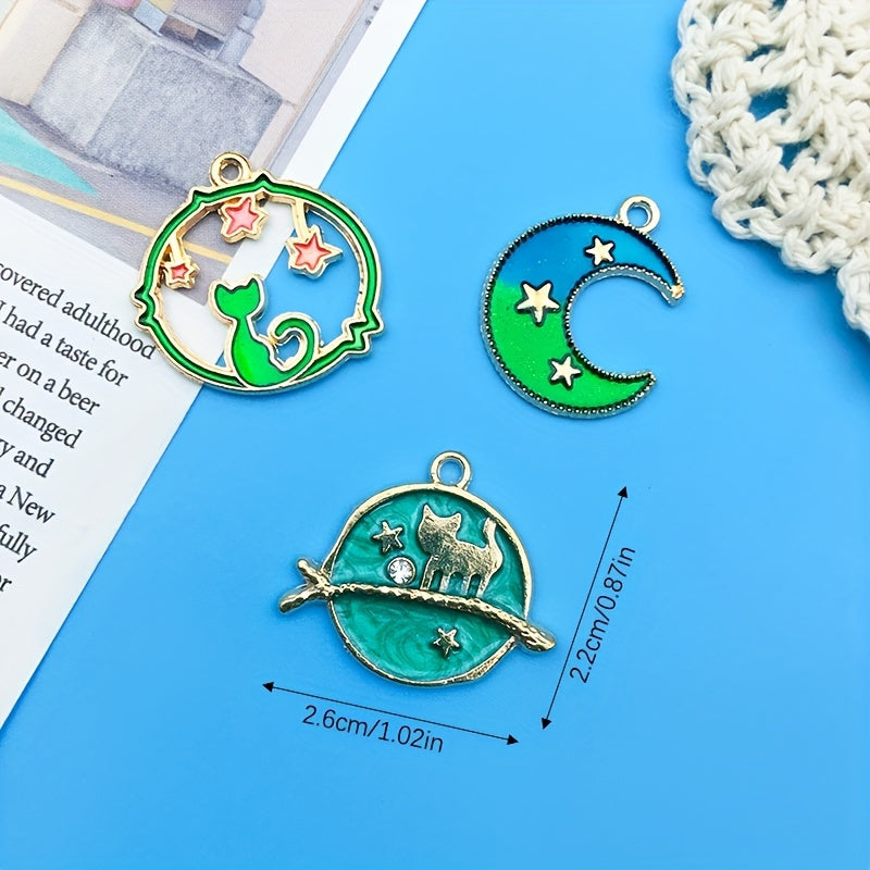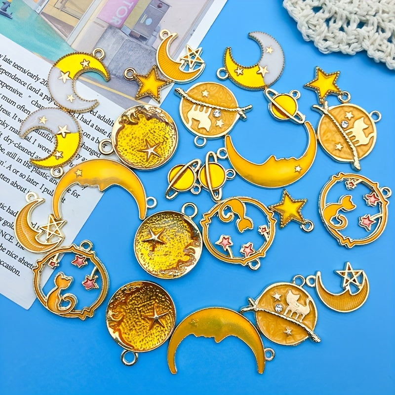 These 24 colorful assorted enamel cat, moon, and star pendants are perfect for creating your own earrings, necklaces, and bracelets. Make unique celestial-themed jewelry with these high-quality charms.