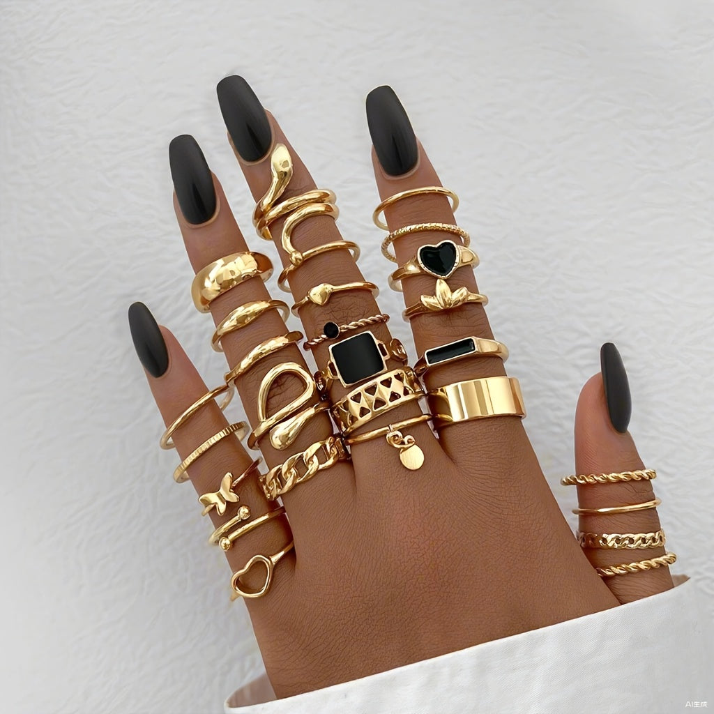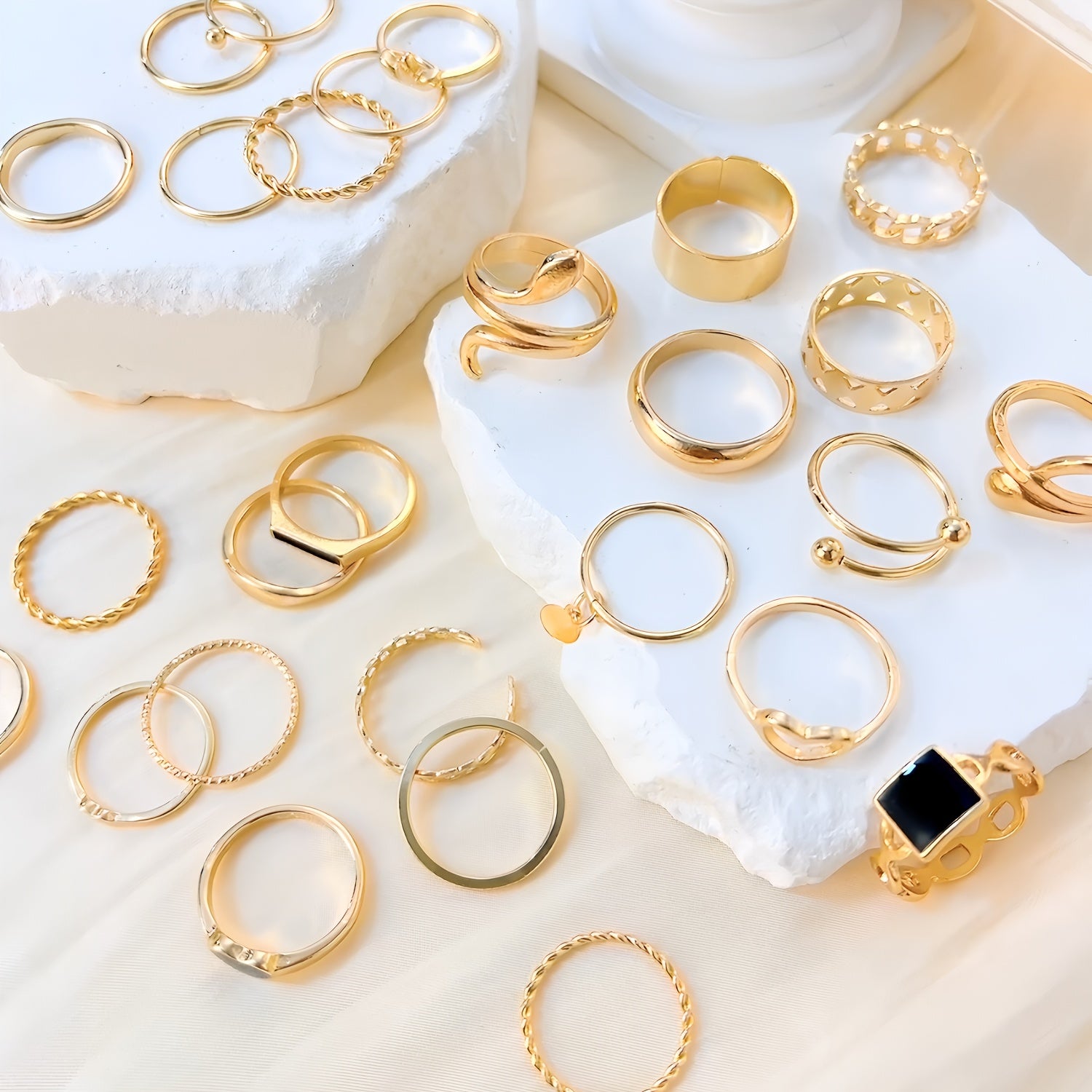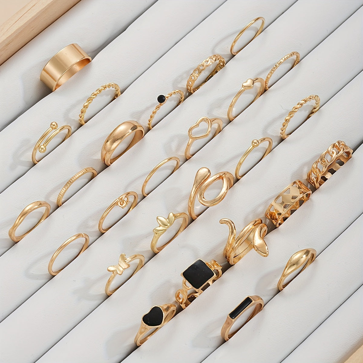 27 Piece Ring Set for Women, Square Heart Designs, Hollow Snake Chain