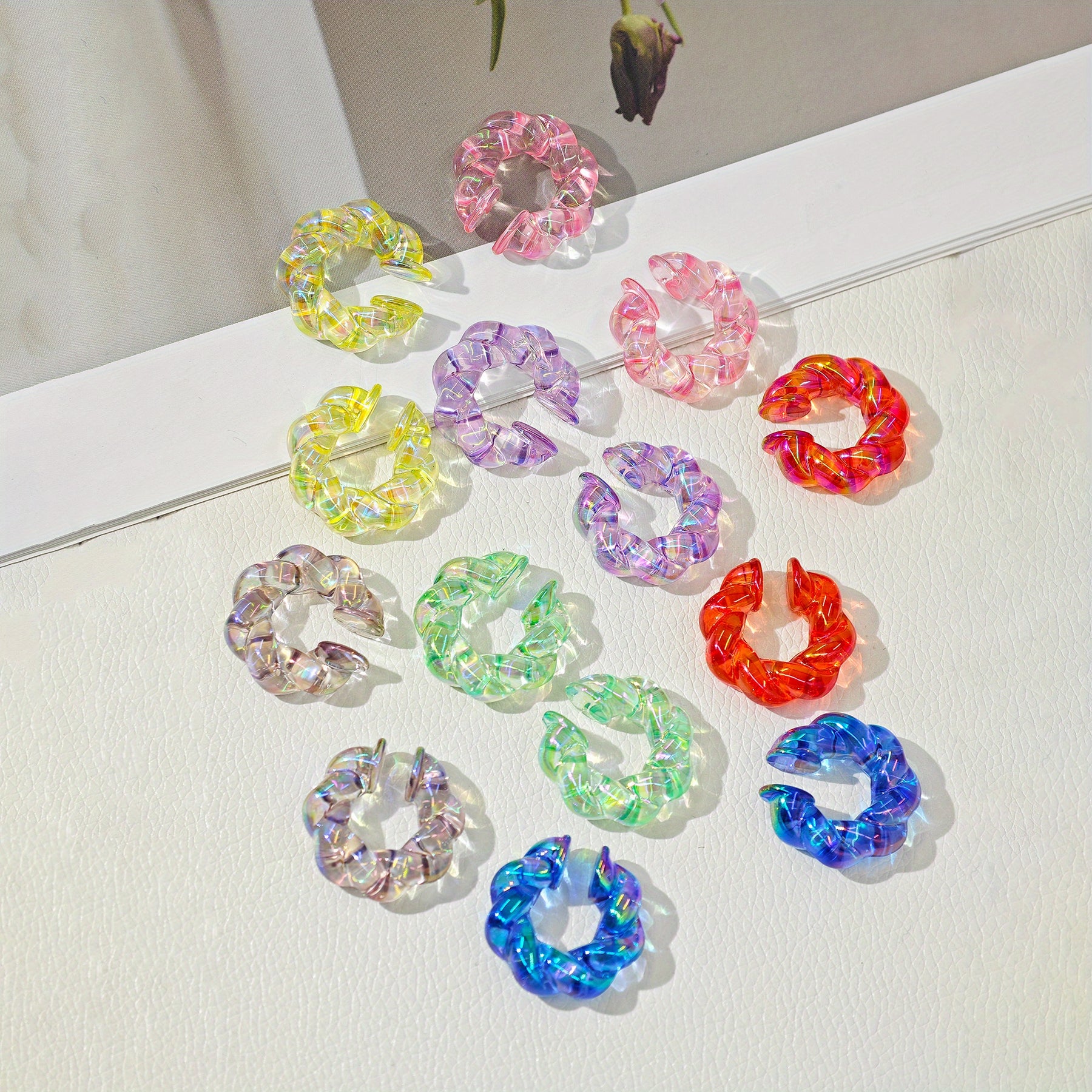 Get this European and American style earring set featuring transparent twist acrylic ear clips in vibrant colors. No piercing required for a trendy look.