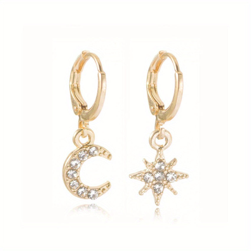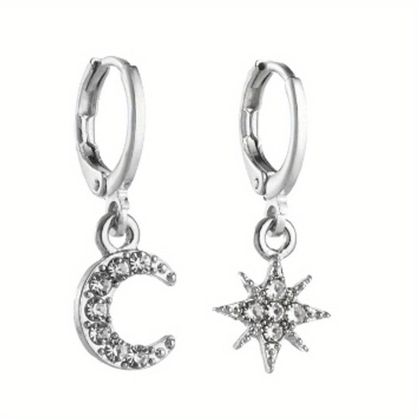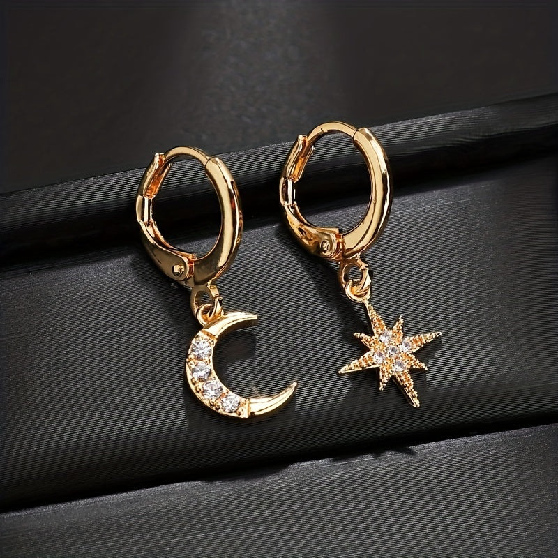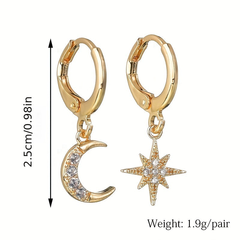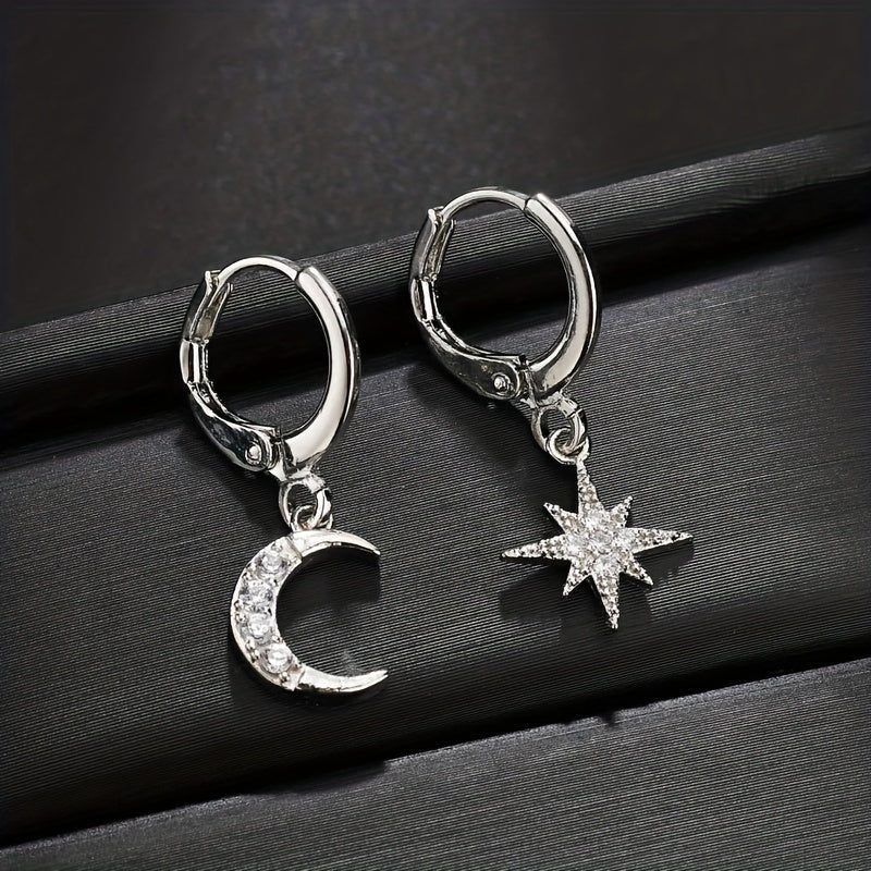 These unique hoop earrings feature an asymmetrical design with a star and moon charm, embellished with sparkling zircon stones. Suitable for both men and women, these earrings are perfect for adding a touch of celestial style to any outfit.