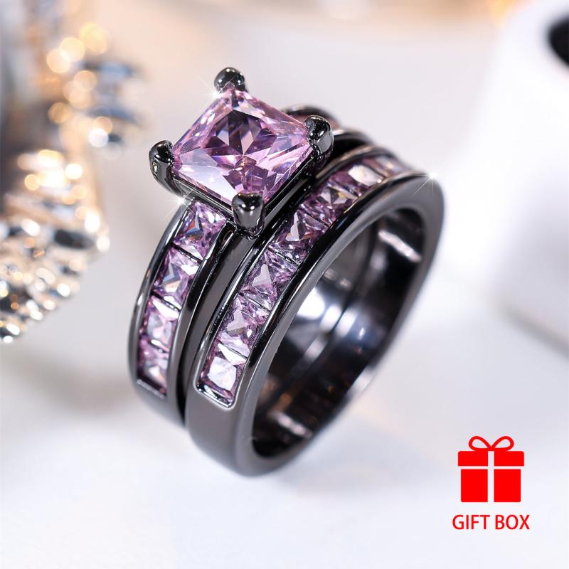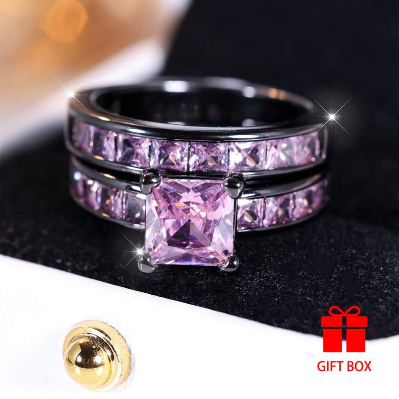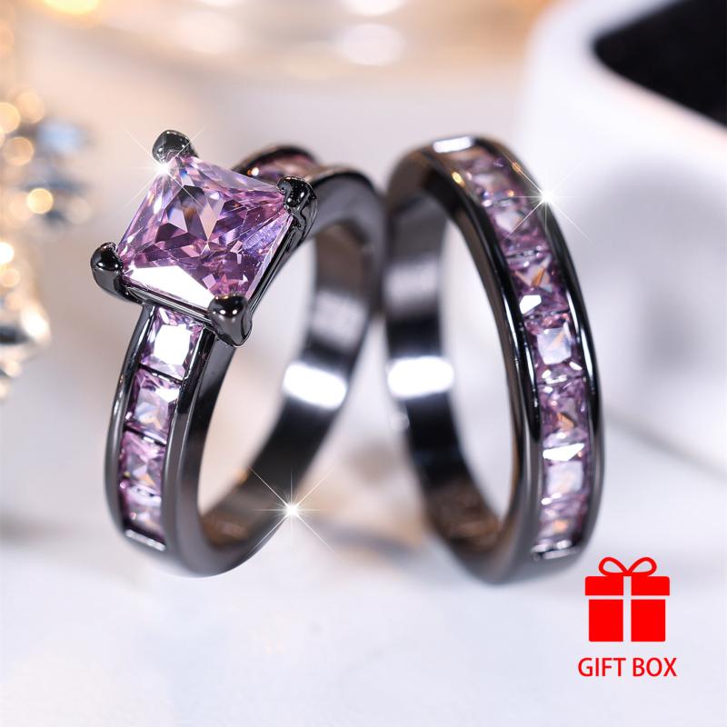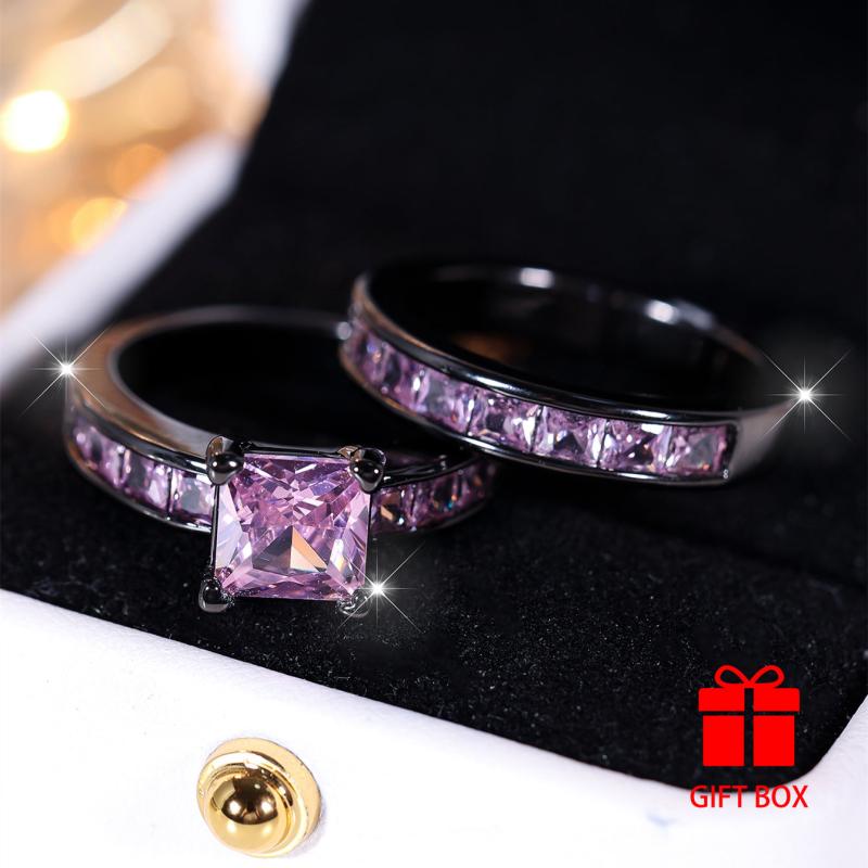 Elegant set of two rings featuring princess cut pink cubic zirconia stones. Ideal for weddings, parties, or everyday glamour. A must-have accessory for any occasion.