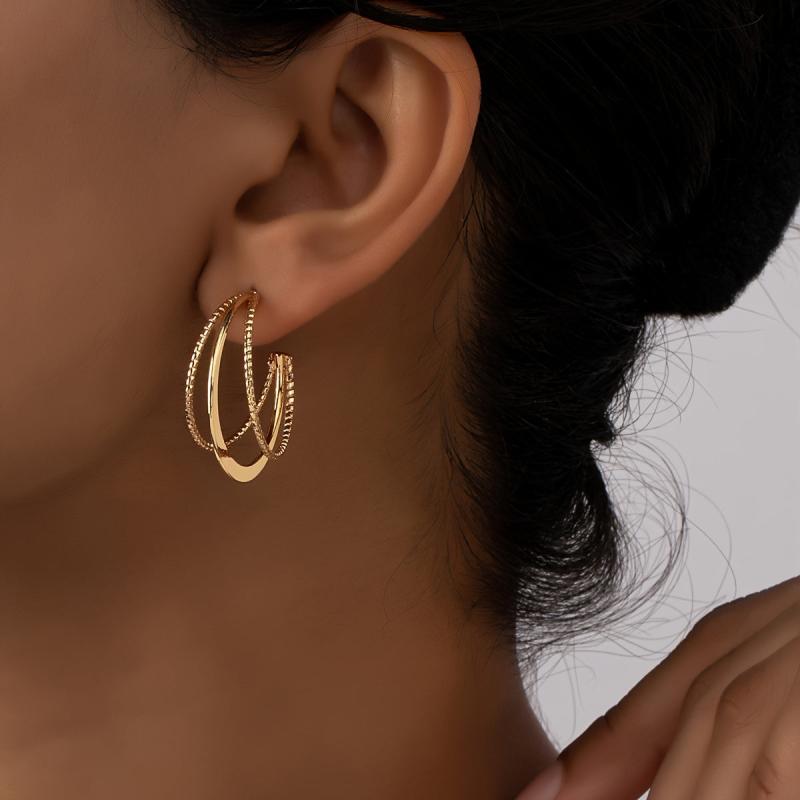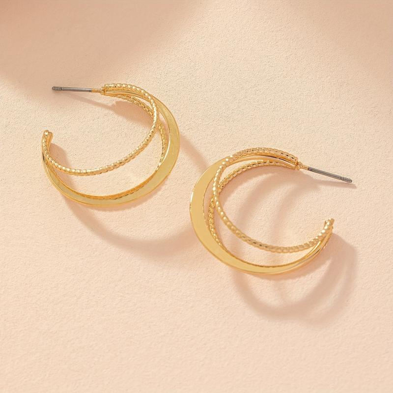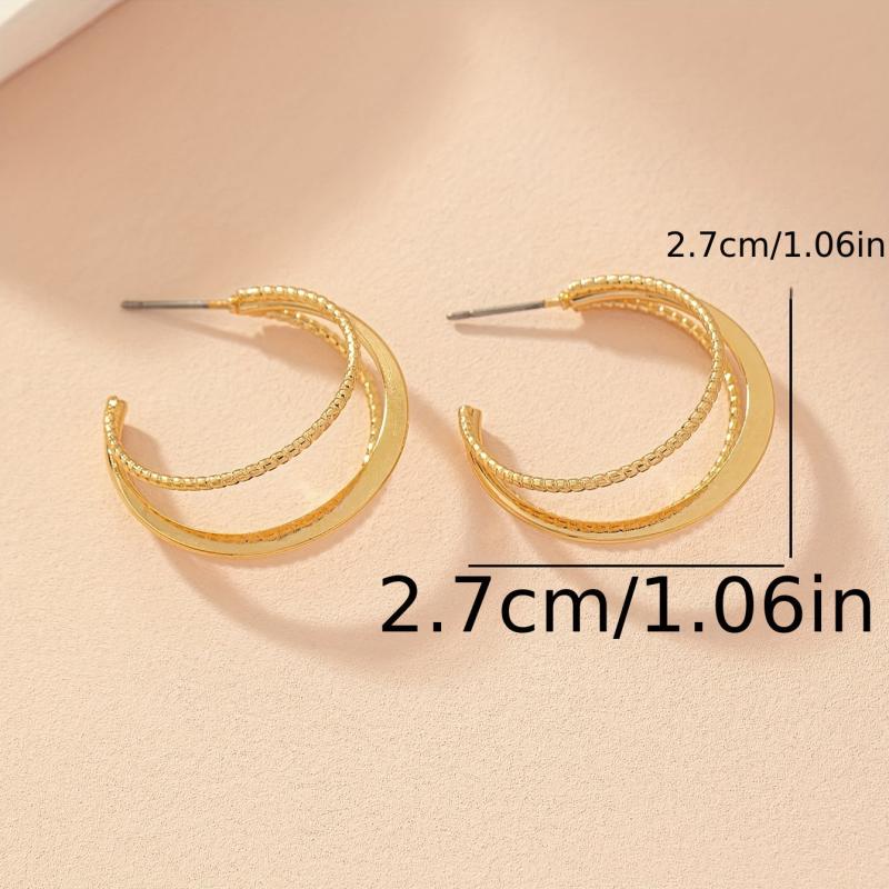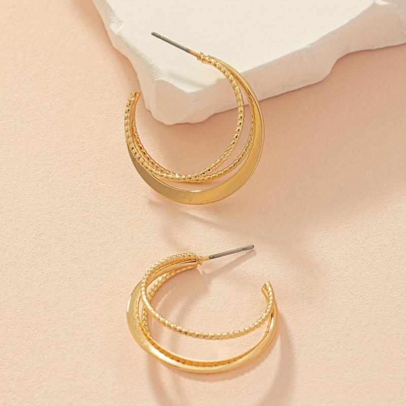 Elevate your casual attire with these stylish triple layer geometric C-shaped hoop earrings in a dazzling golden tone. Perfect for parties, shows, and everyday wear.