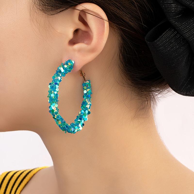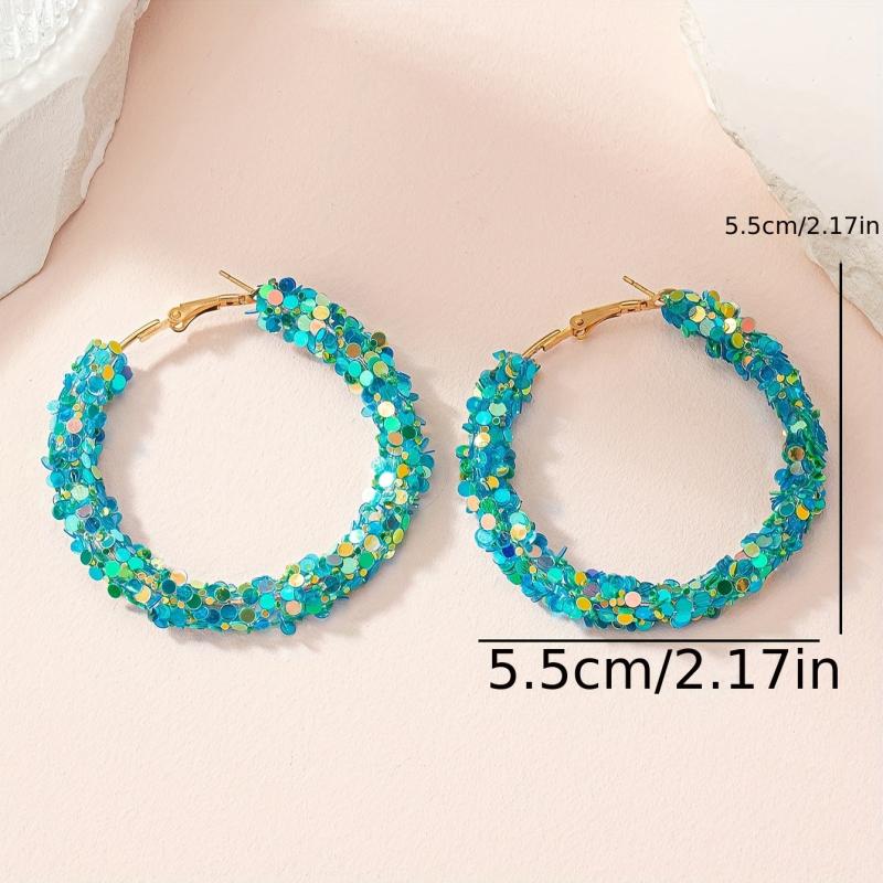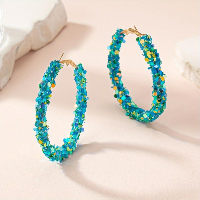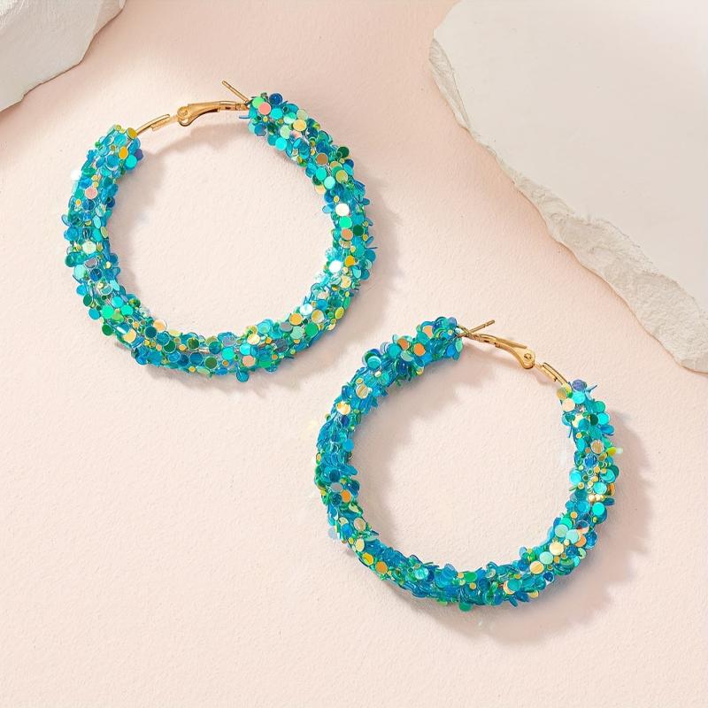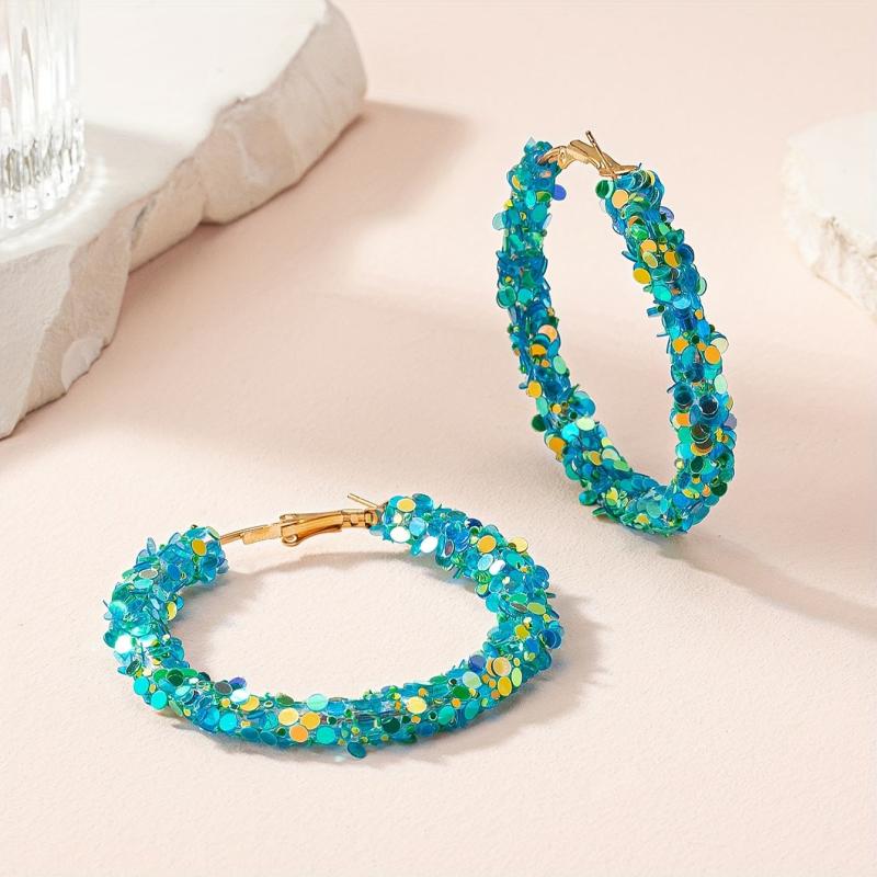 These trendy hoop earrings are crafted with colorful sequins and alloy posts. They are suitable for all seasons and are both creative and stylish.