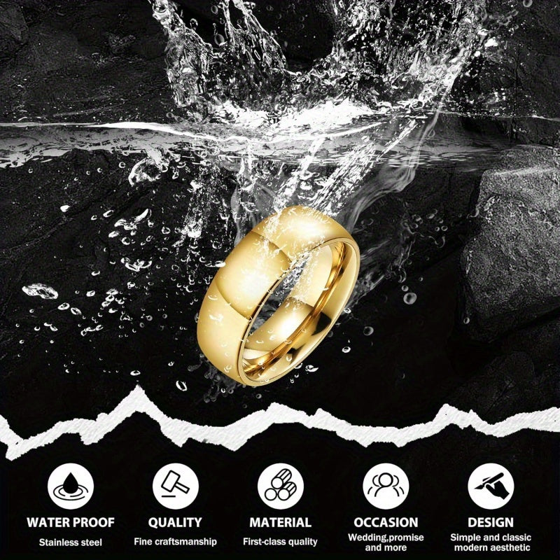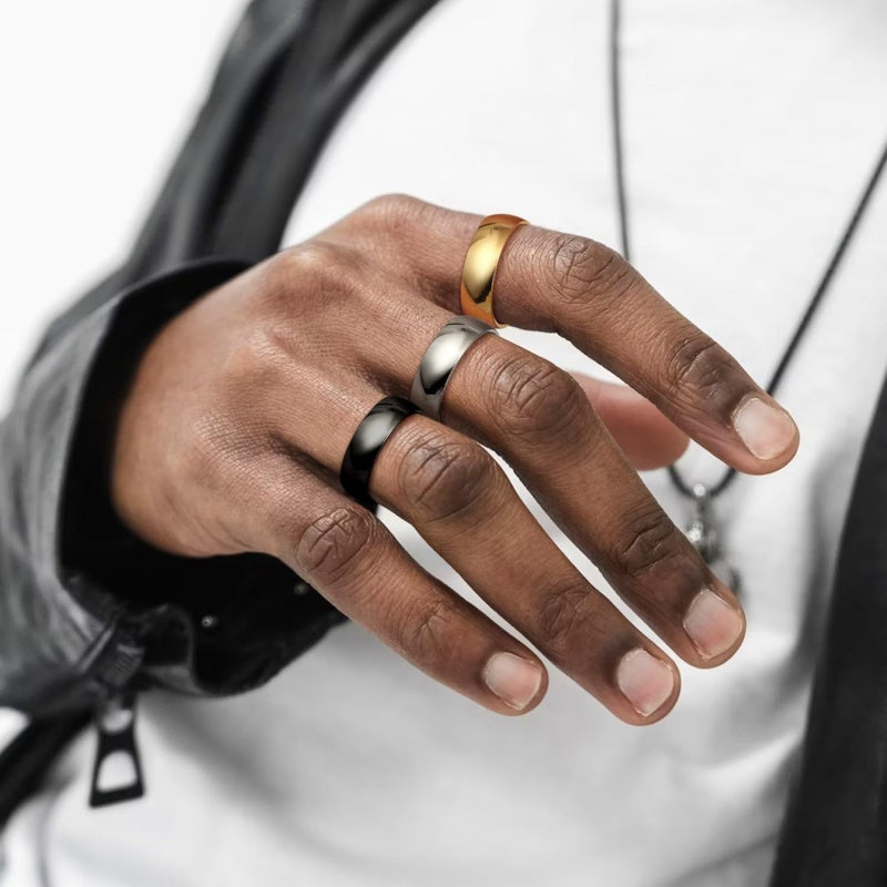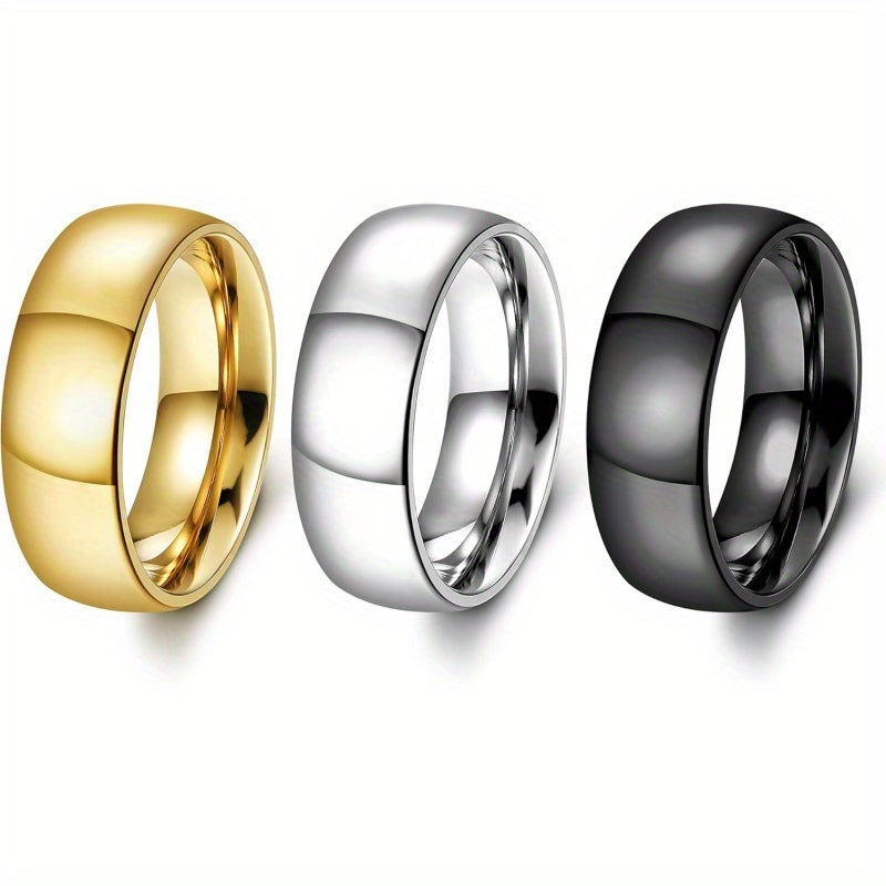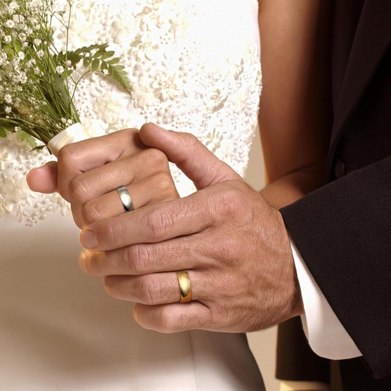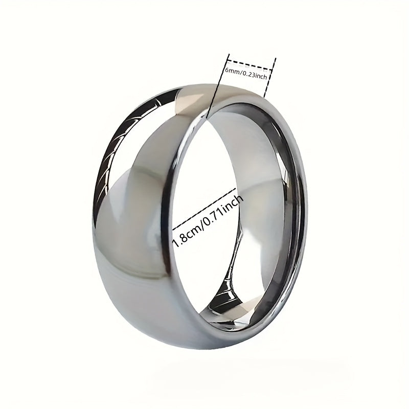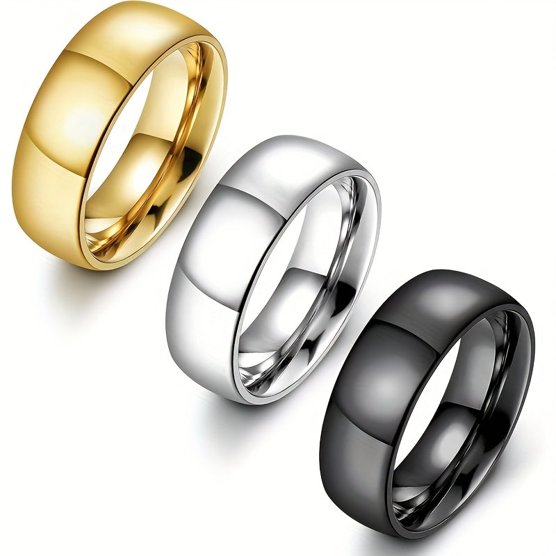 This set includes a men's and women's ring made of stainless steel with beveled edges. Women's band size is 6.