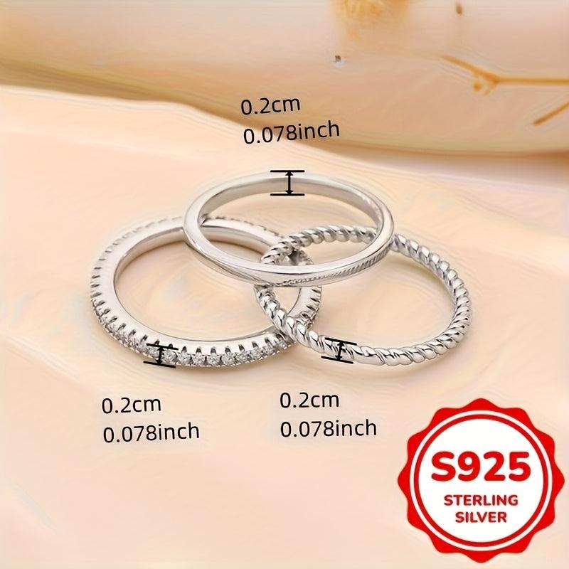 This set includes three stacked rings with synthetic zirconia inlays, perfect for daily wear or parties. Made of fine 925 sterling silver, this jewelry adds an elegant touch to any outfit.