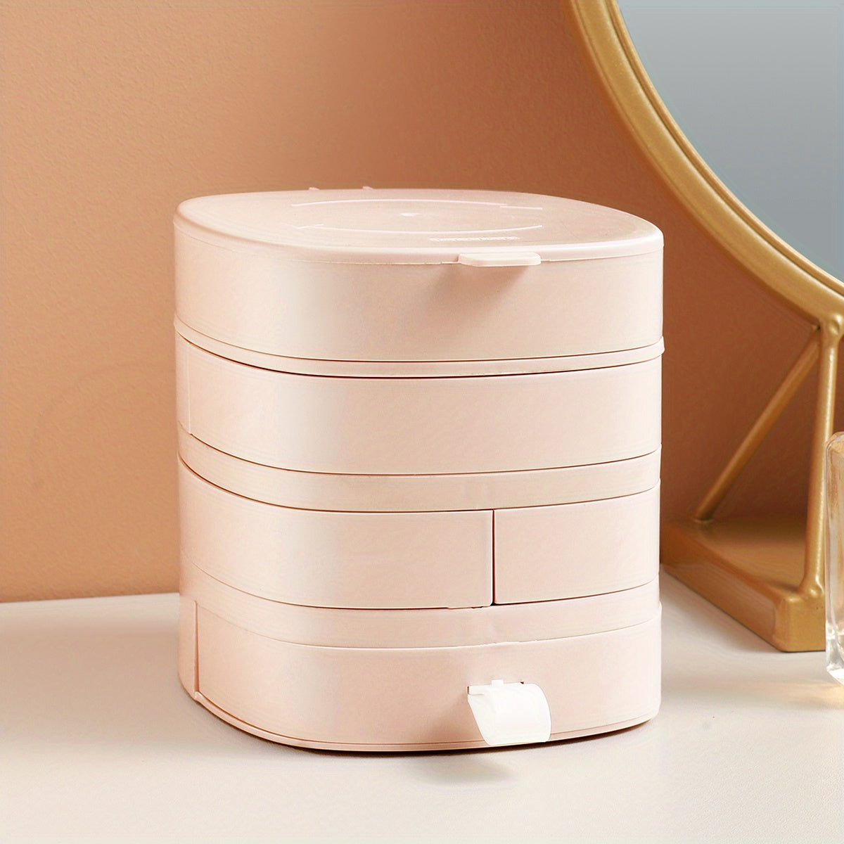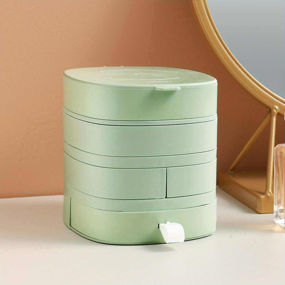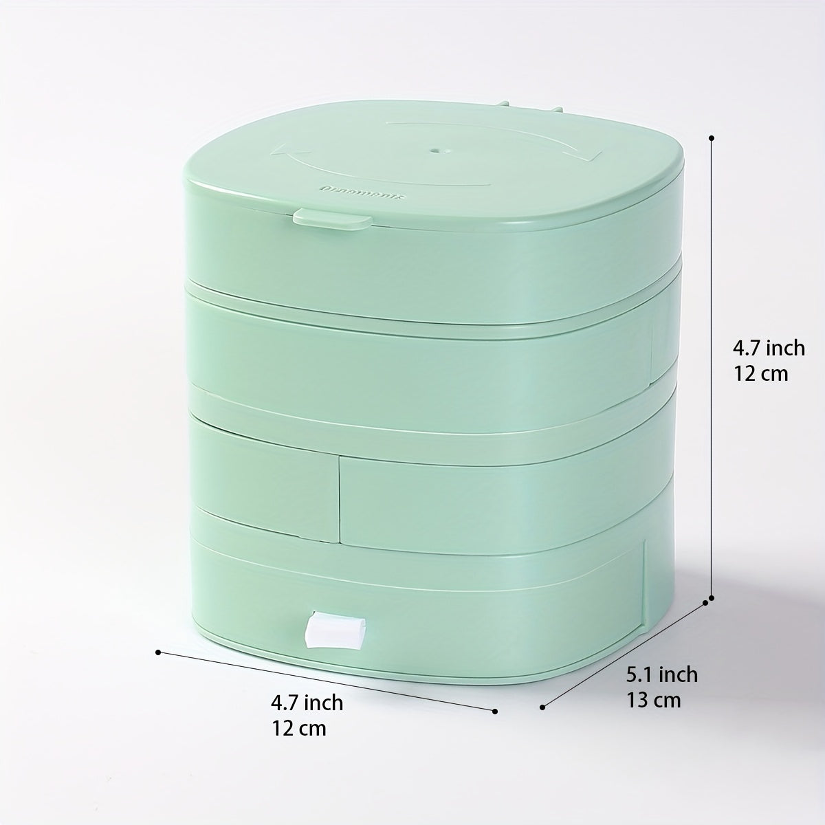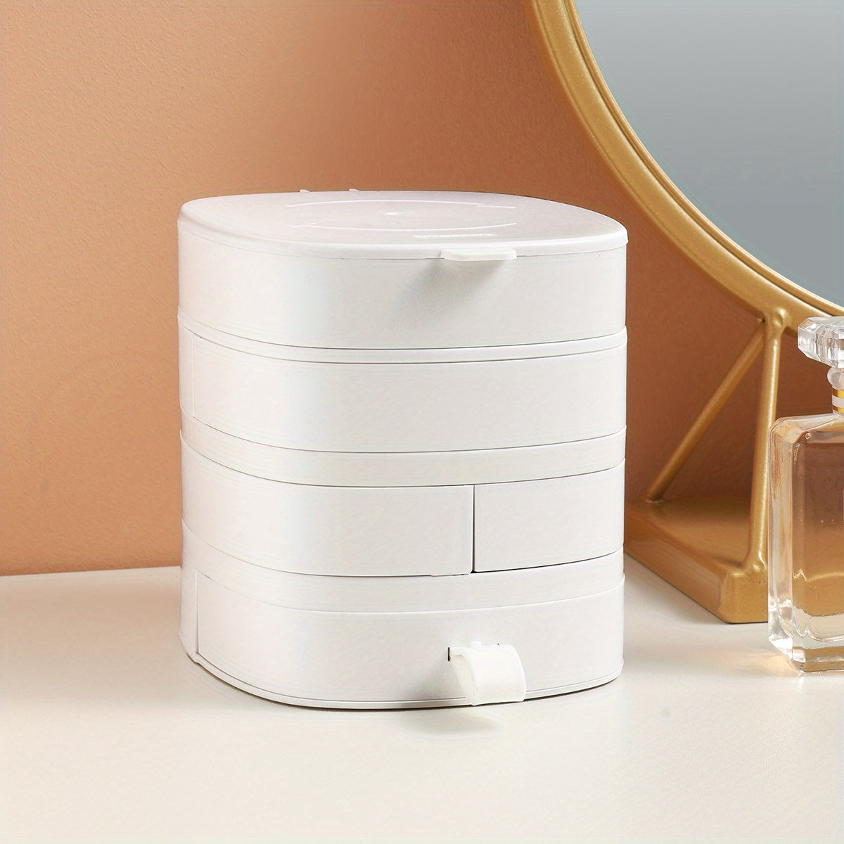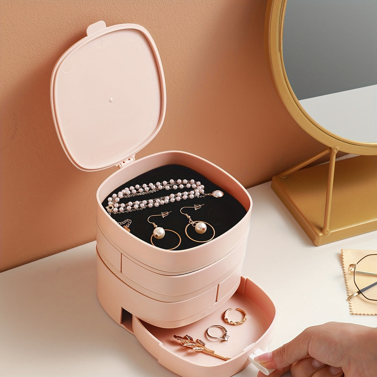 Organize your bracelets, rings, and necklaces in this rotating jewelry tray with lid. Perfect for travel or home storage.