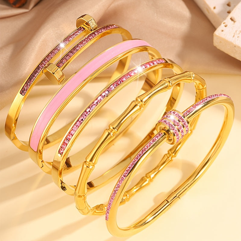 • Set of 5 stainless steel bracelets with rhinestone accents