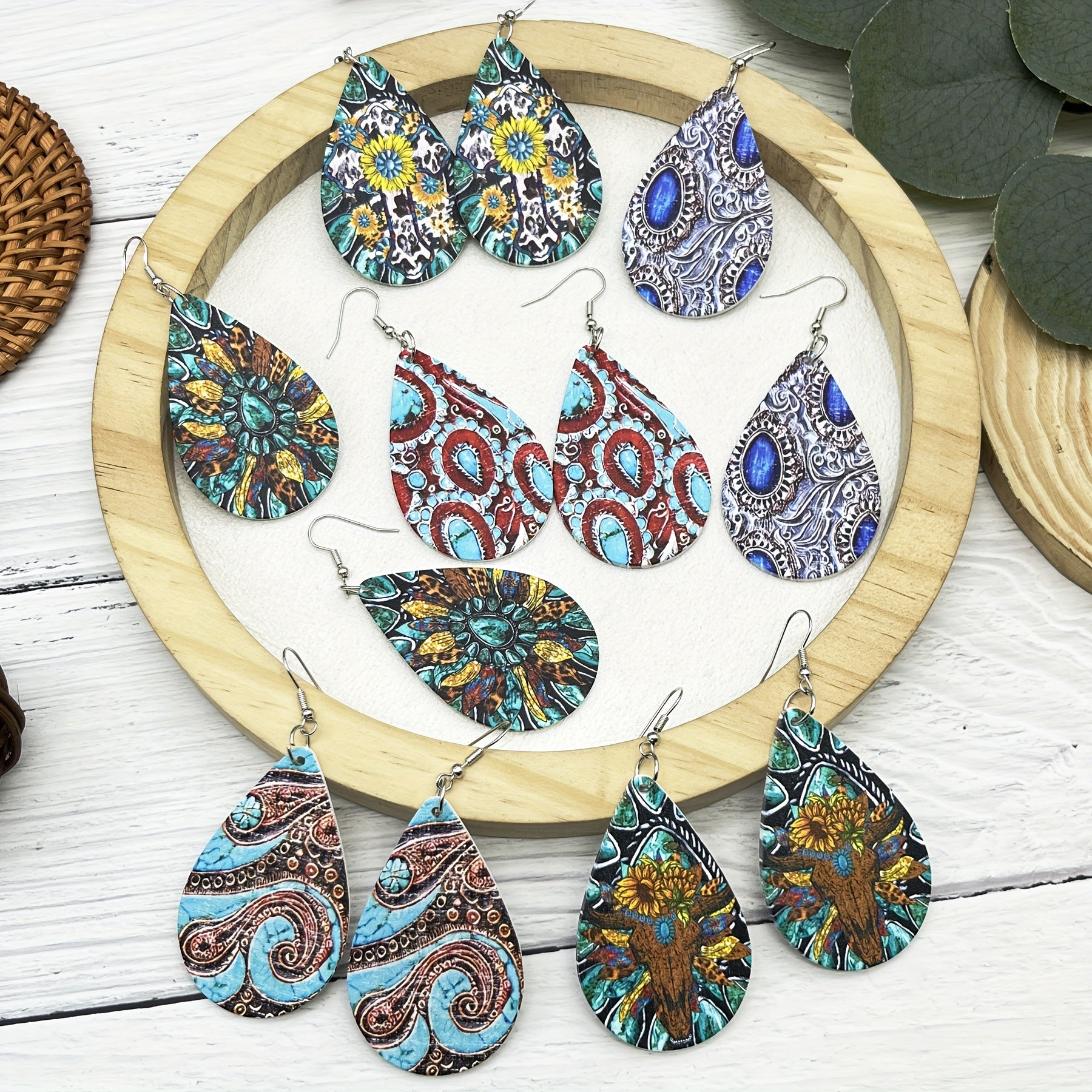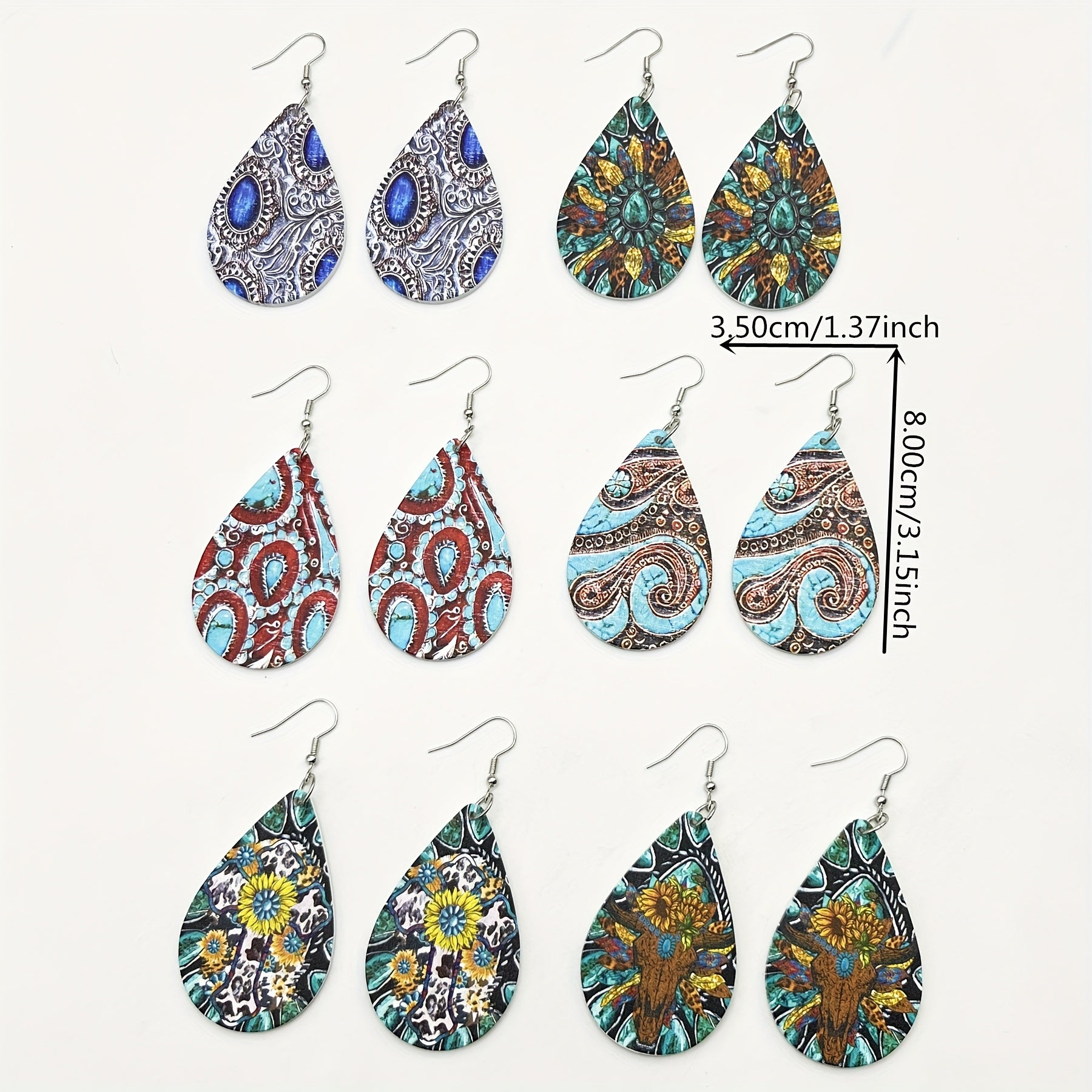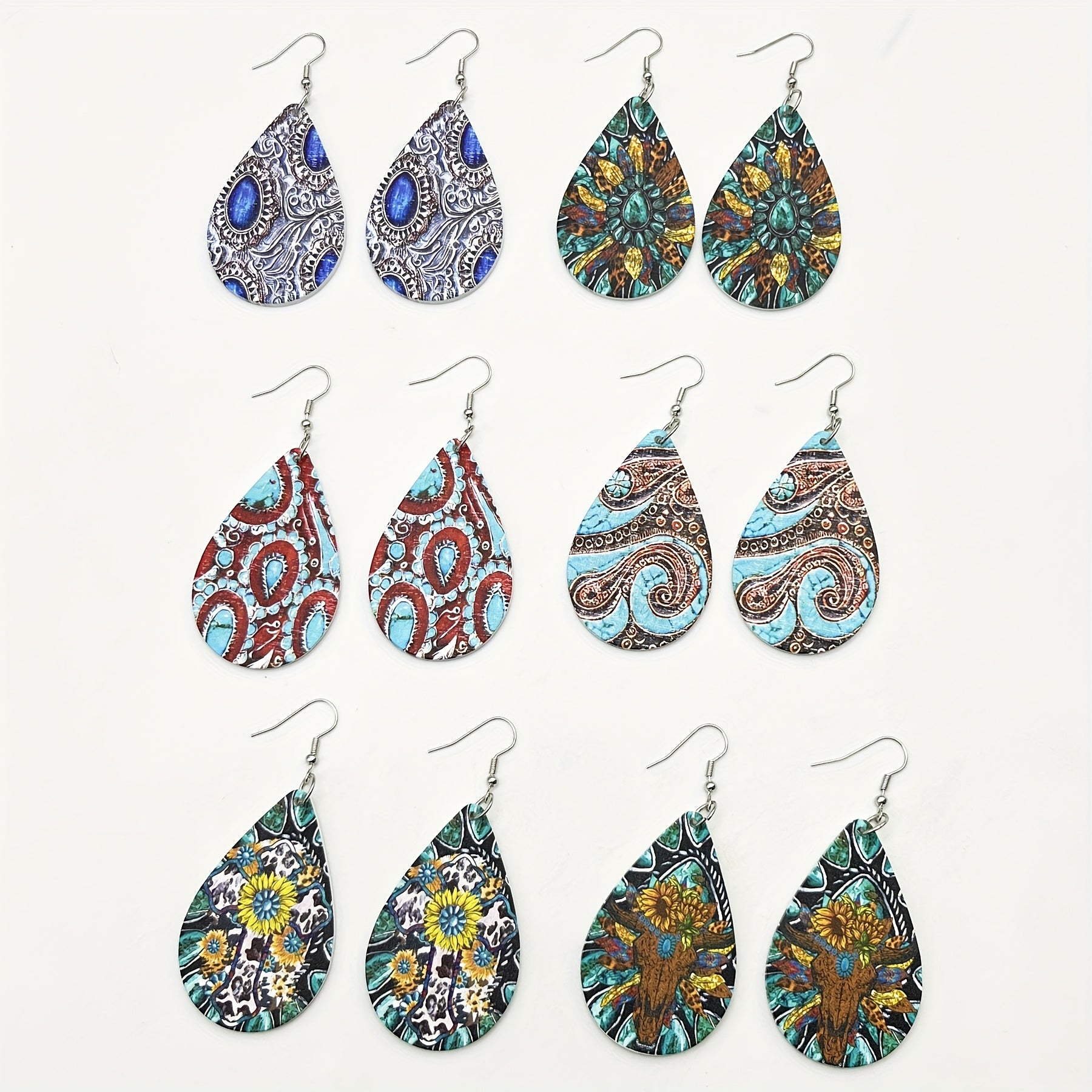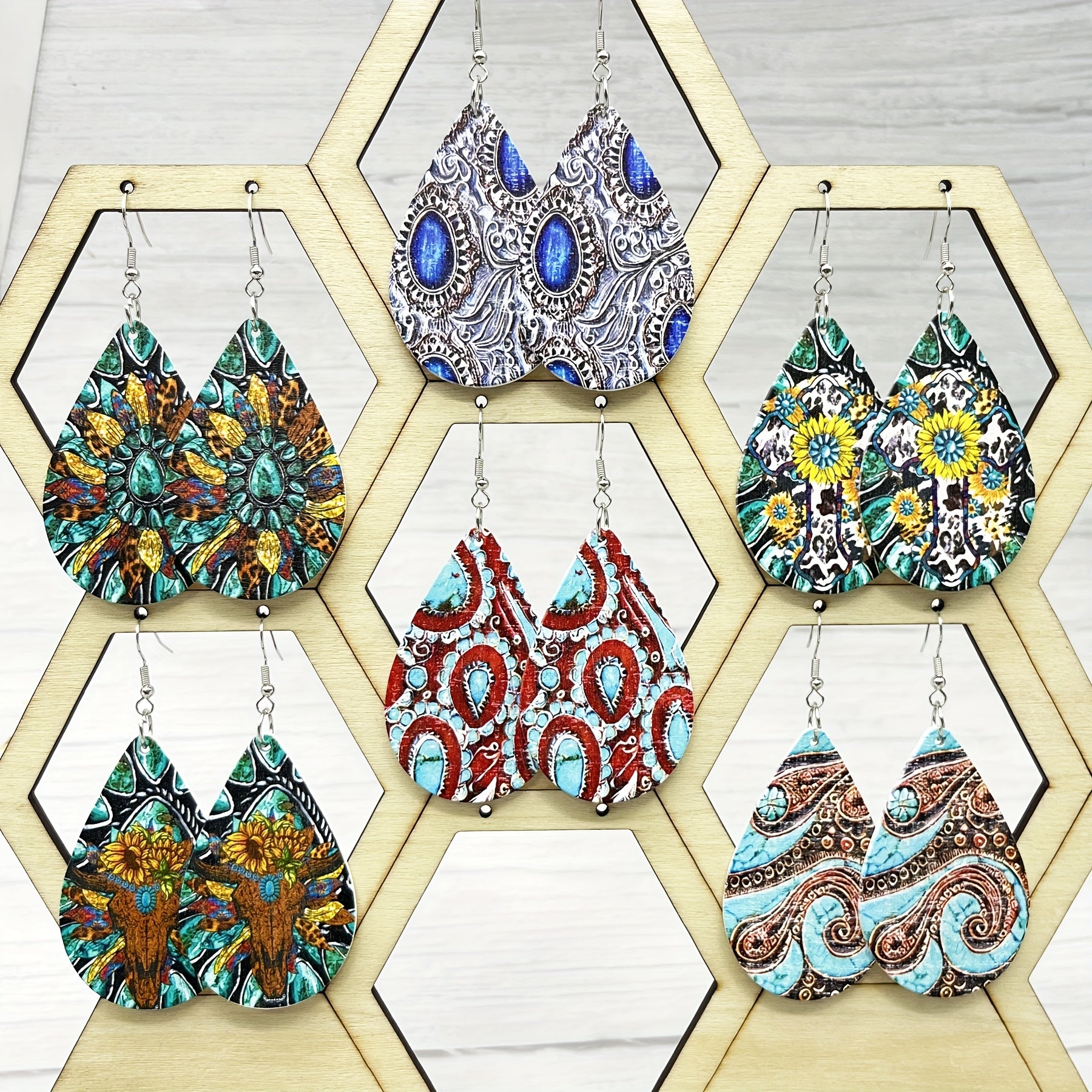 6 Pairs Wooden Teardrop Earrings Retro Print Floral Geometric Patterns