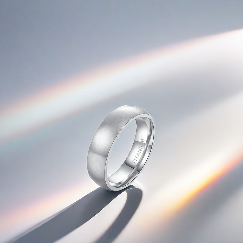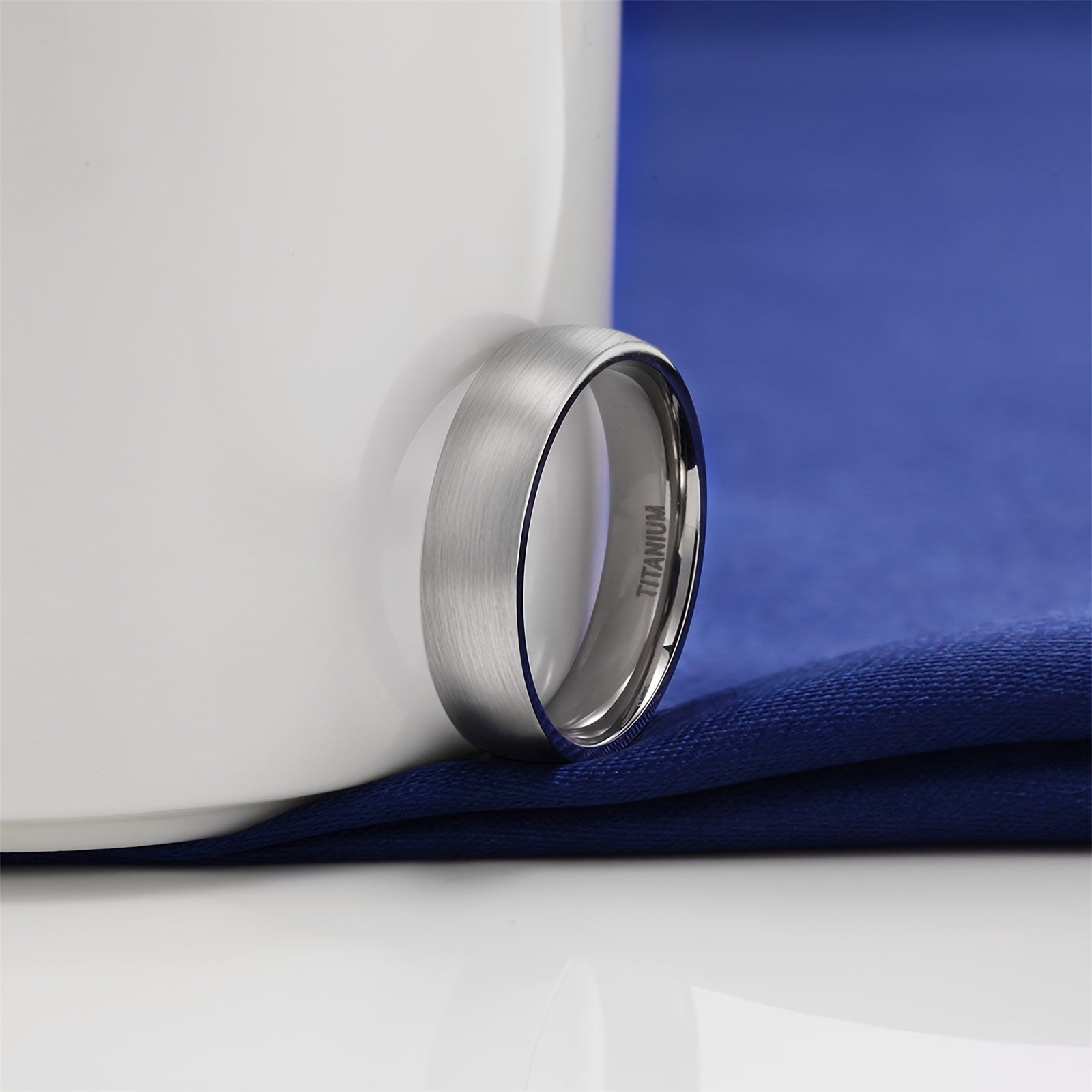 This titanium wedding band features a high gloss finish, perfect for couples looking for a modern and minimalist design.