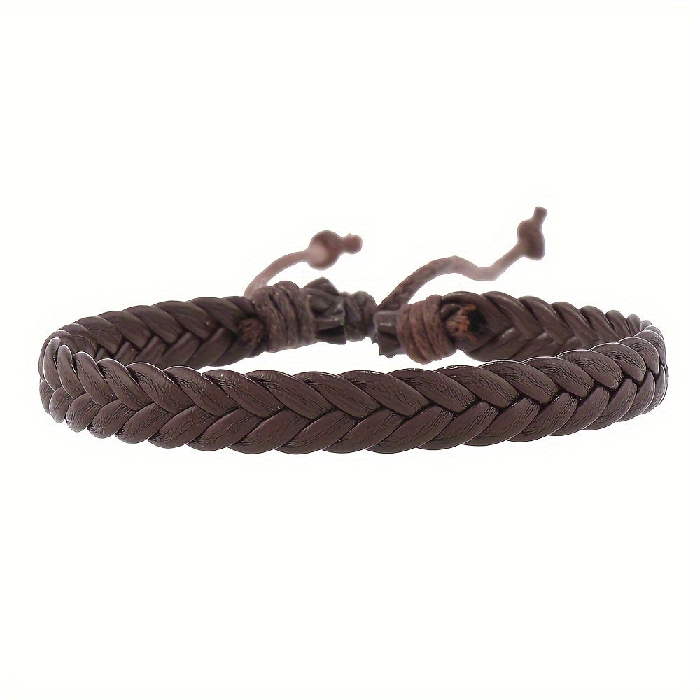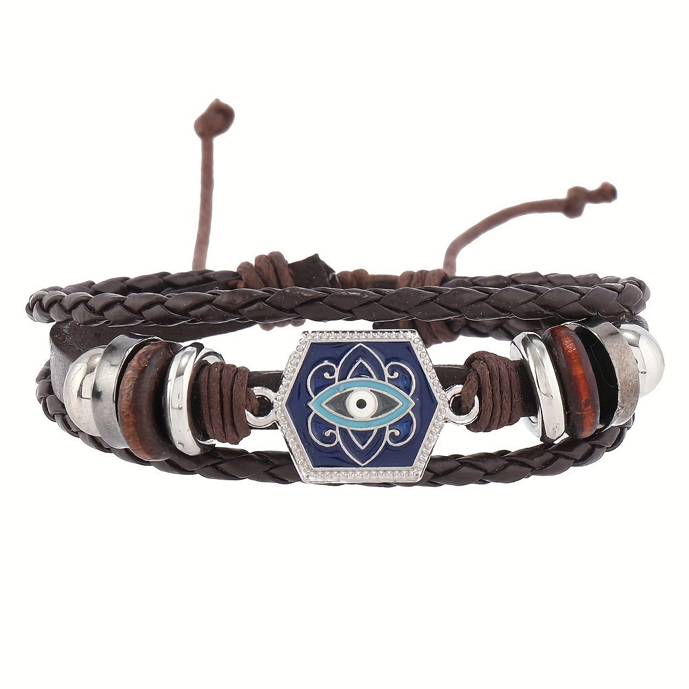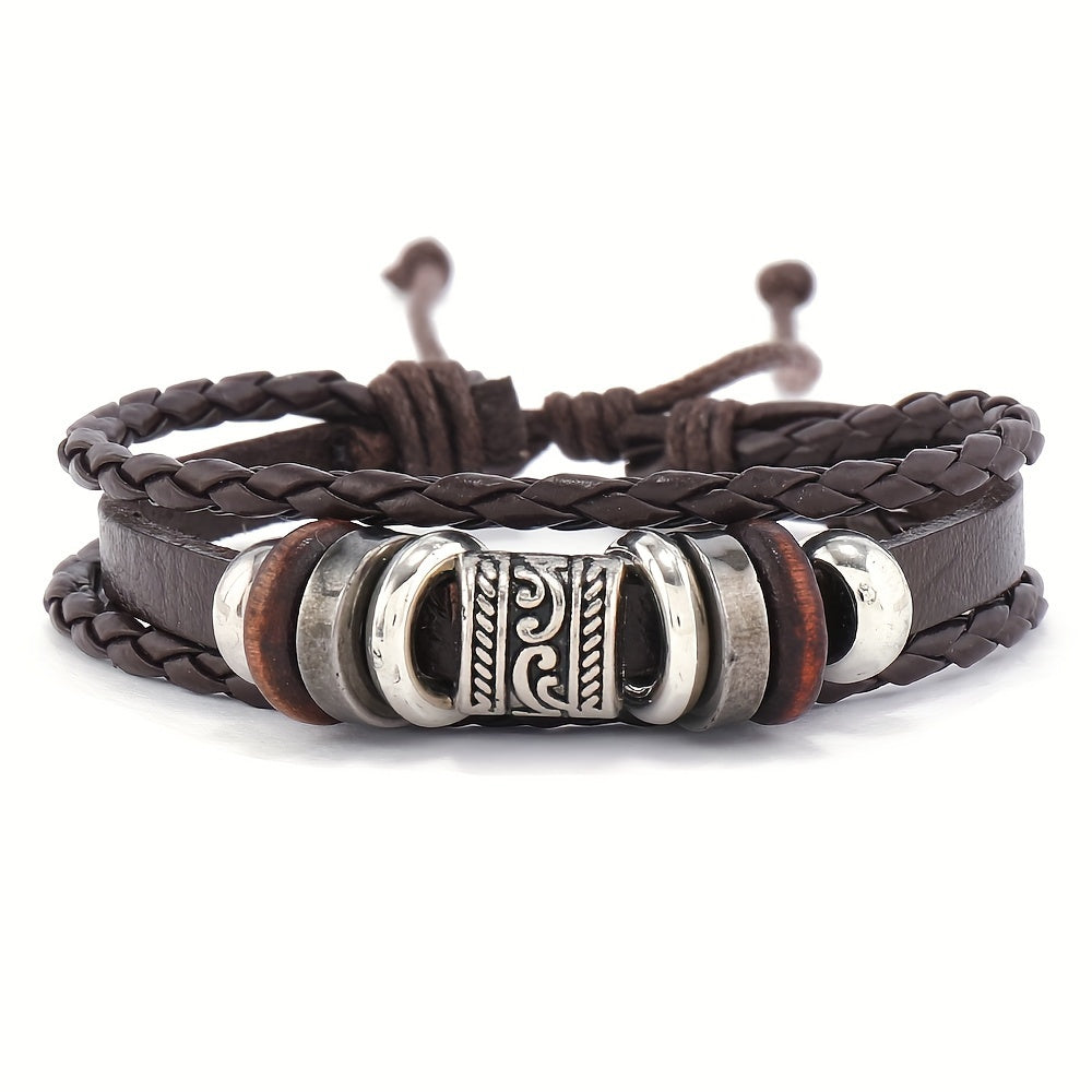 Enhance your punk style with this set of 6 bracelets featuring totem wooden beads on braided PU leather material.