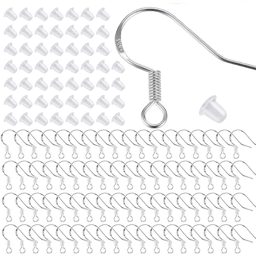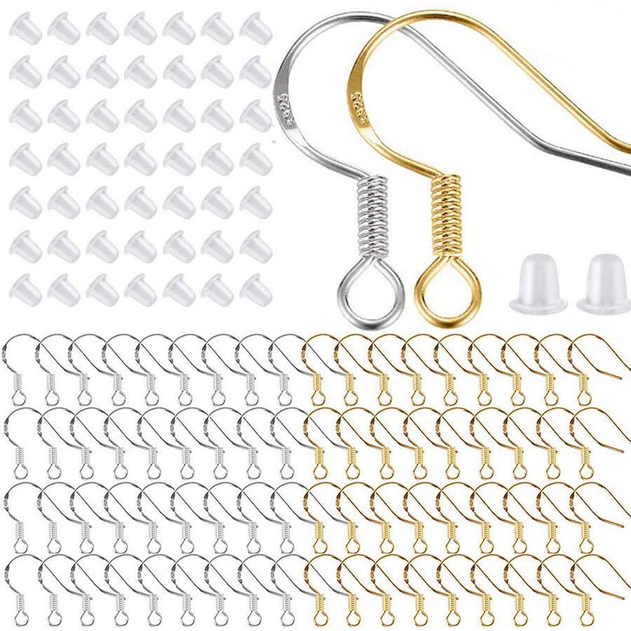 This kit includes 400 golden and 400 silvery earring hooks with transparent silicone backs. Perfect for DIY earrings.