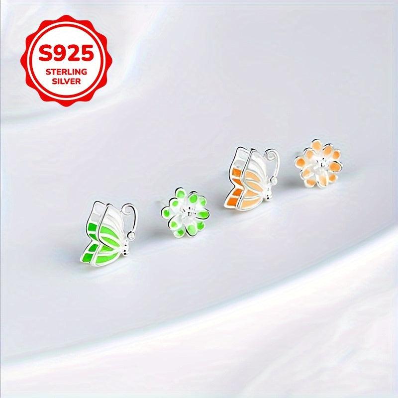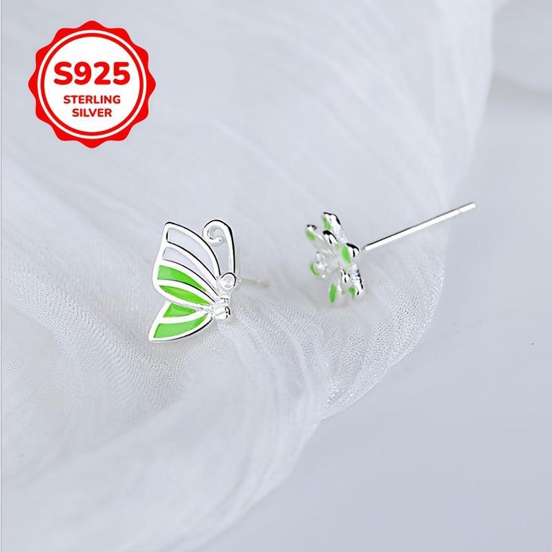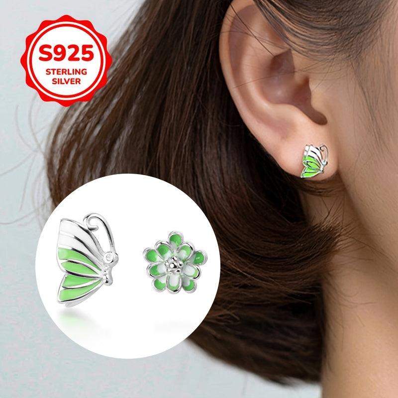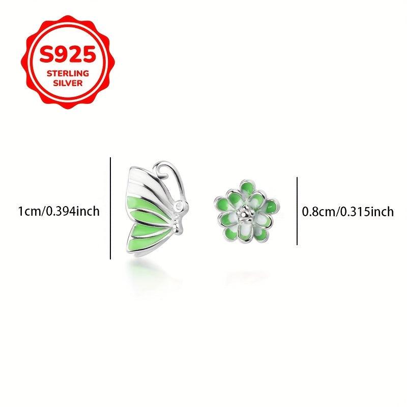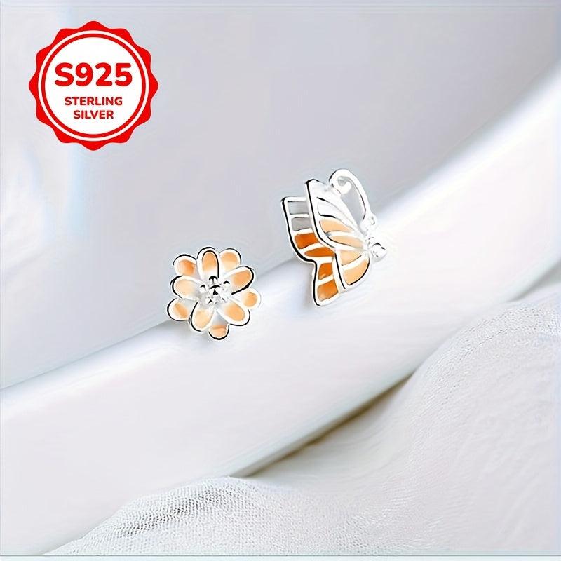 Add a touch of elegance with these unique 925 silver hypoallergenic dual sweet stud earrings in an asymmetrical butterfly and flower design. Perfect for any occasion.