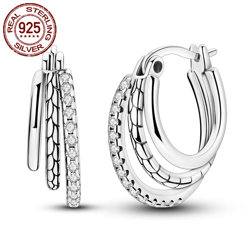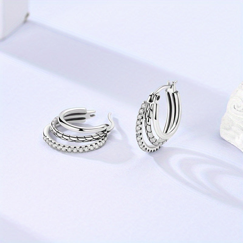 925 Silver Triple Layer Snake Bone Pattern Hoop Earring with Zirconia Accents