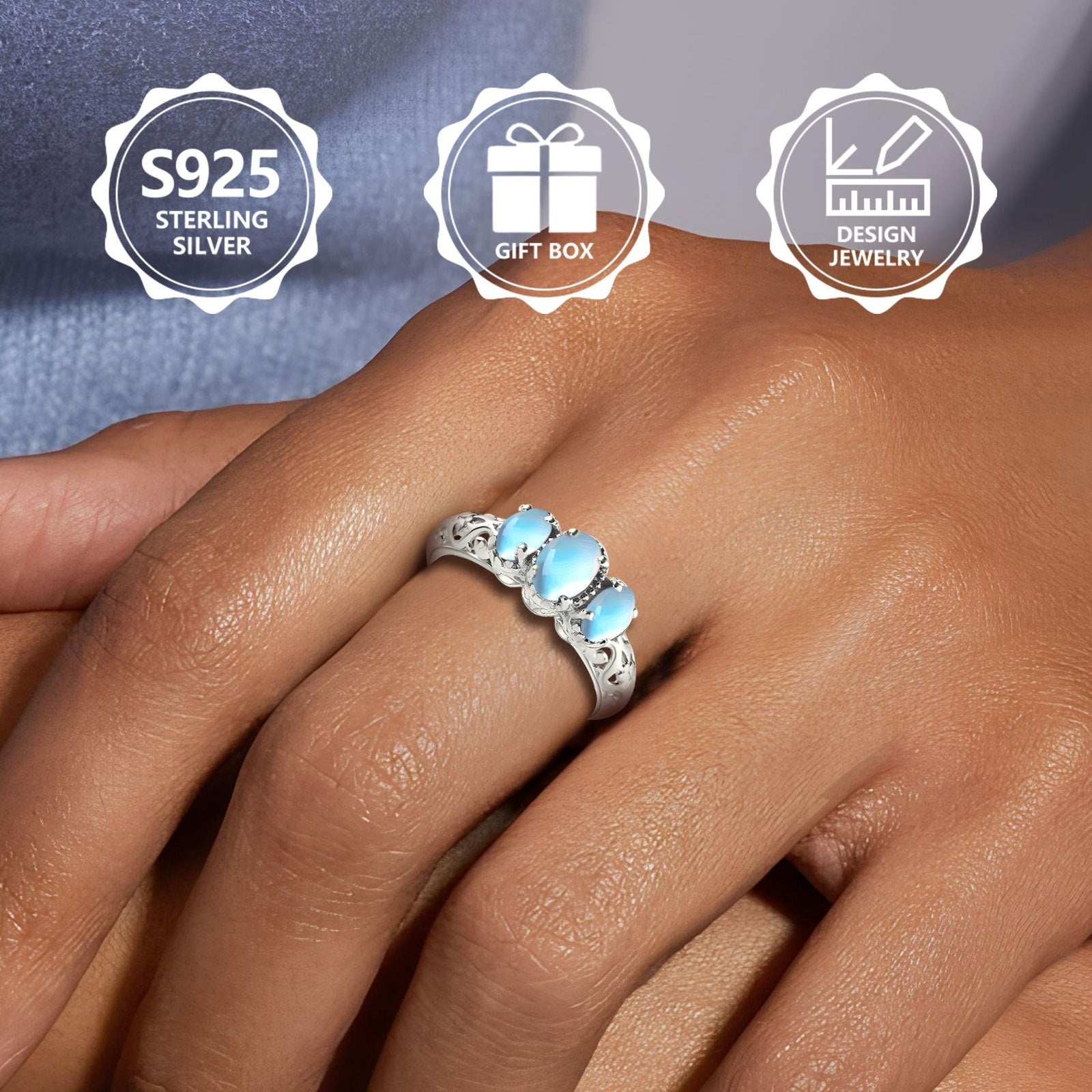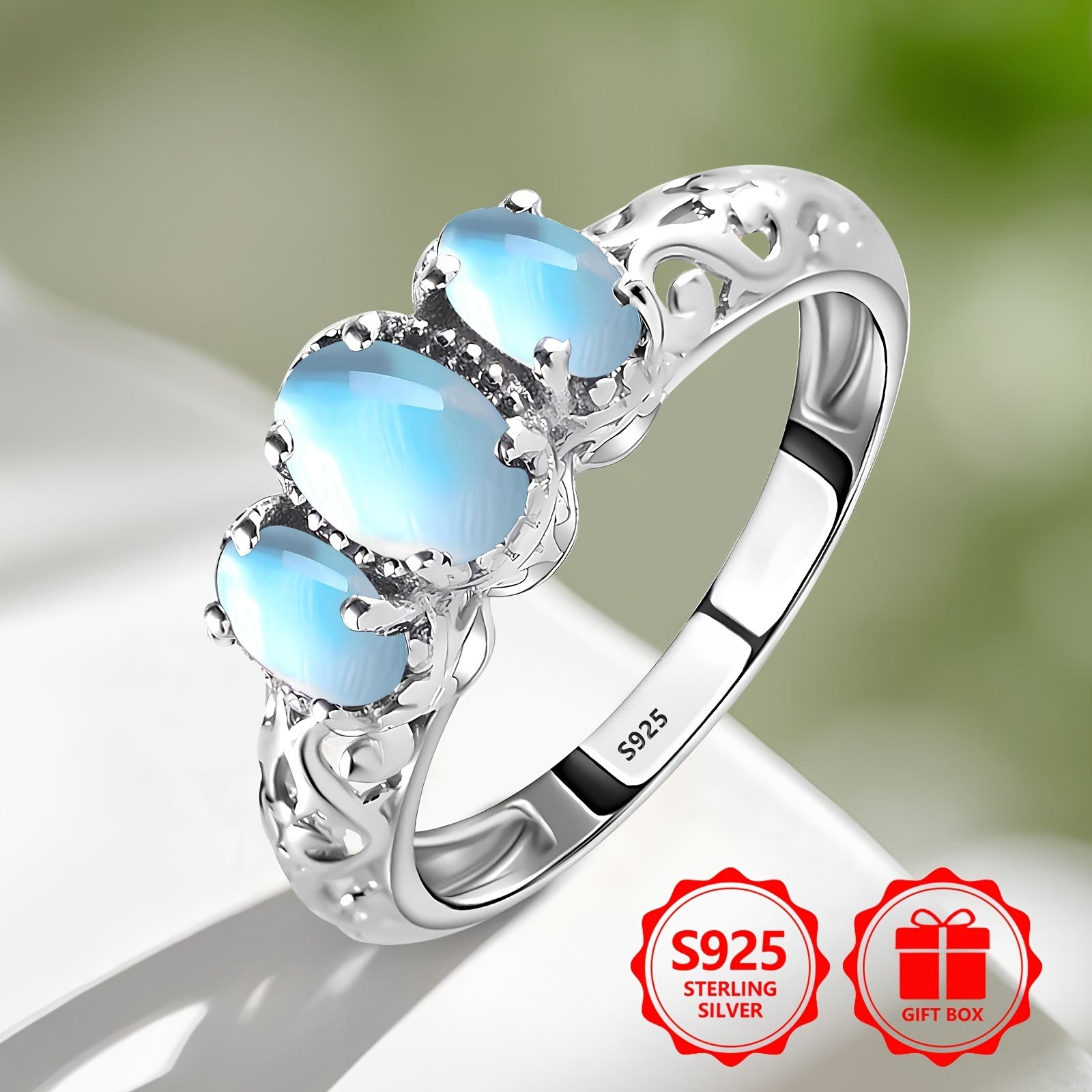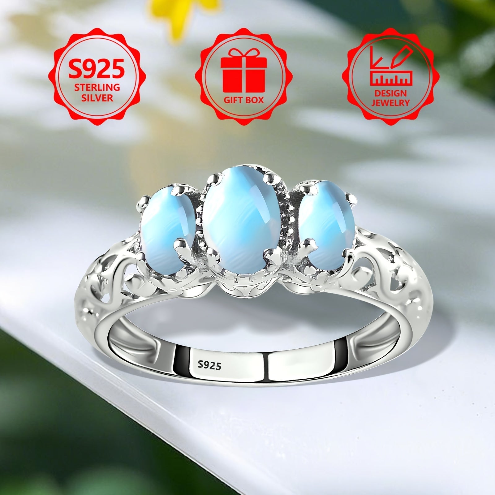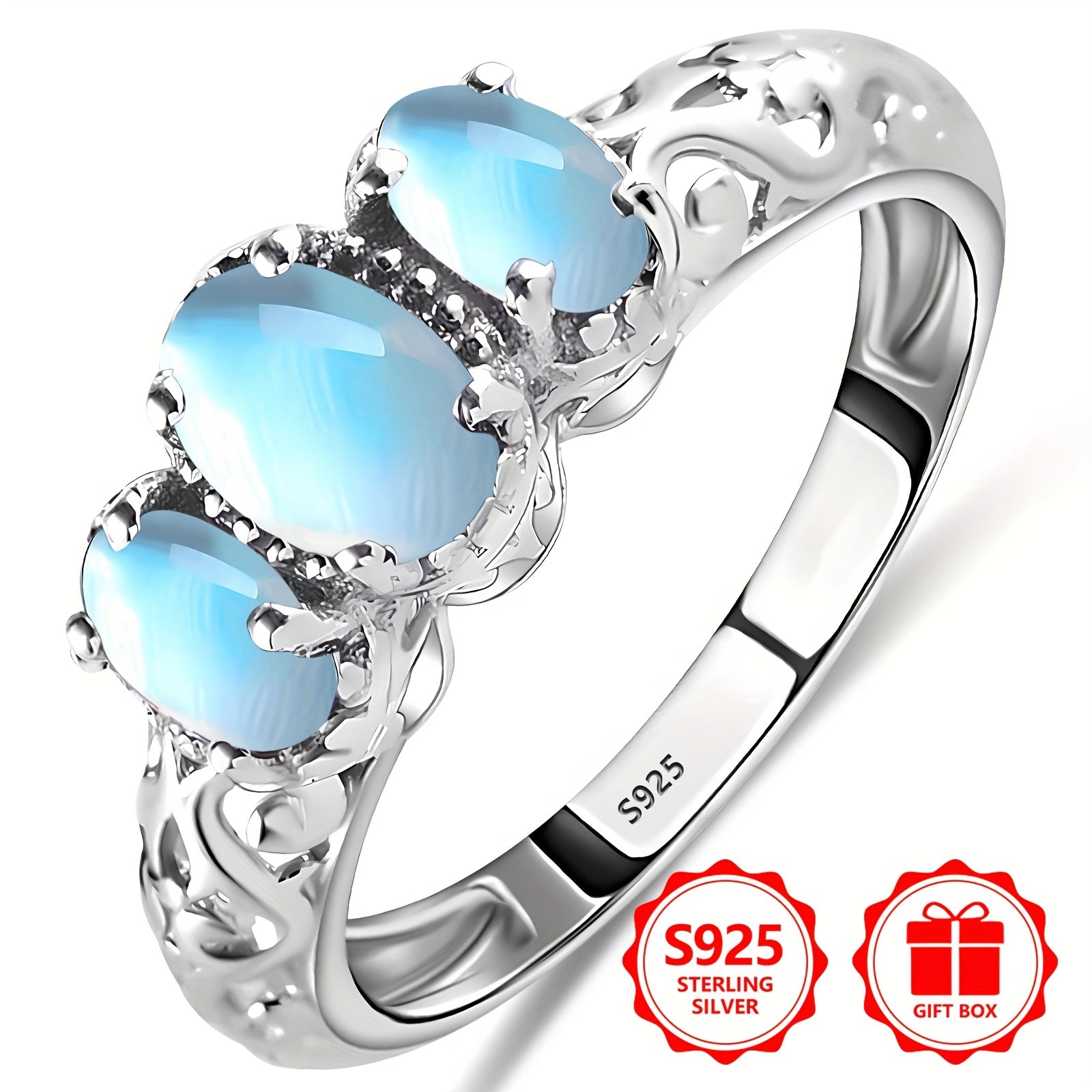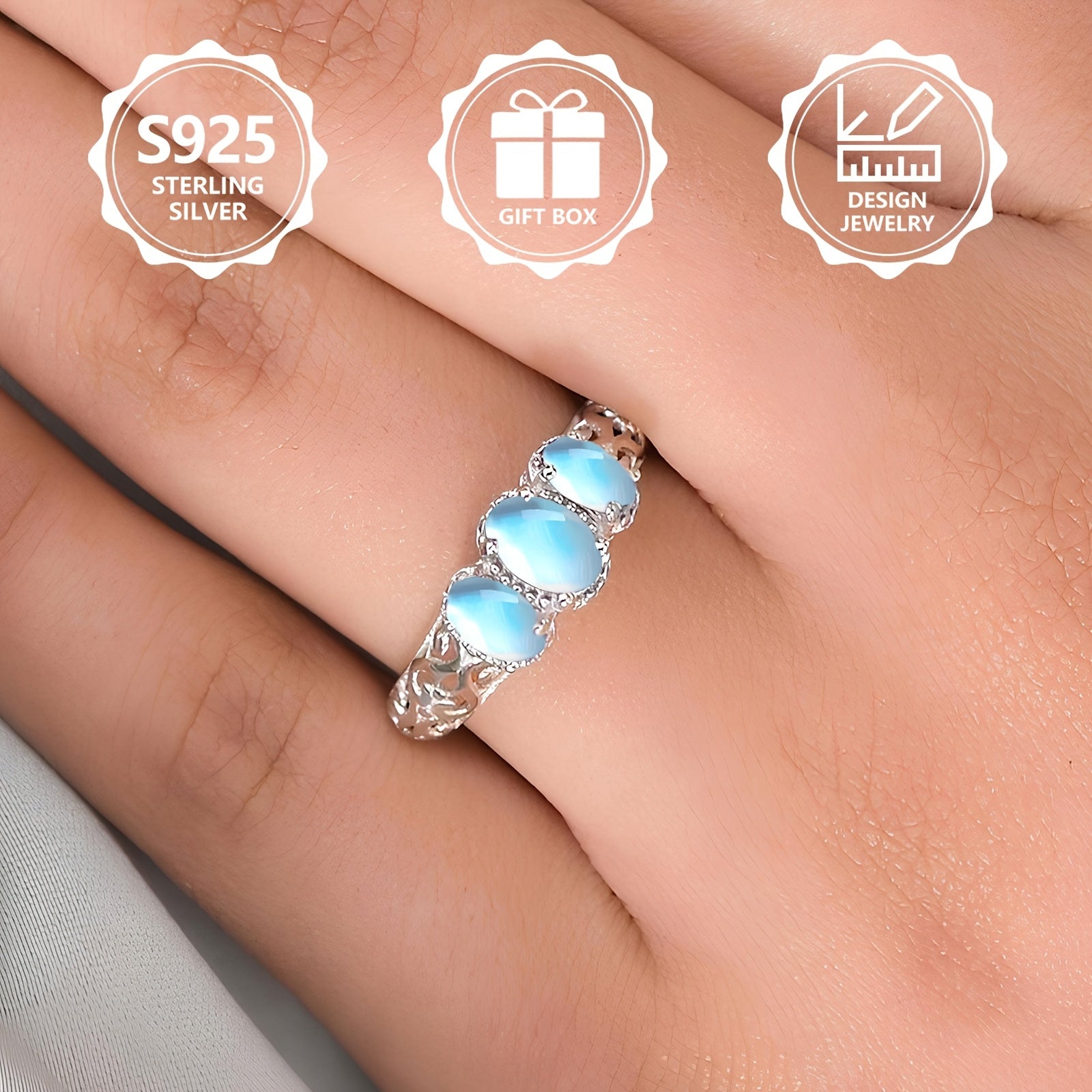 Elevate your style with this stunning 925 sterling silver ring featuring a bohemian hollow design with 3 oval moonstones. Ideal for all seasons and comfortable for daily wear.