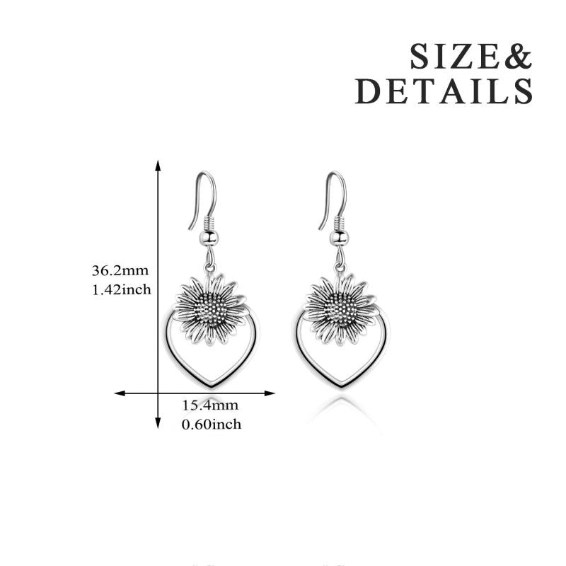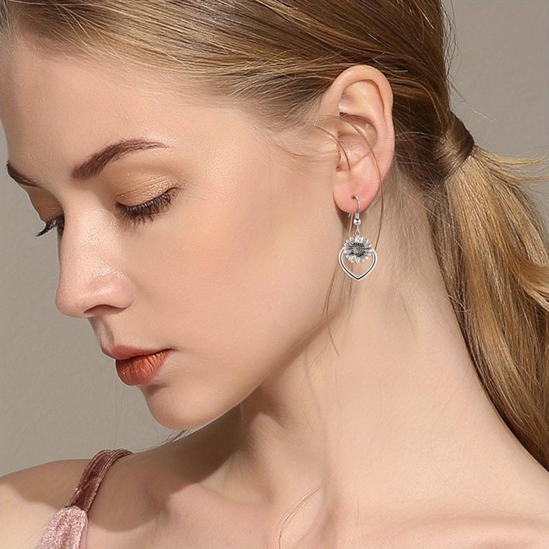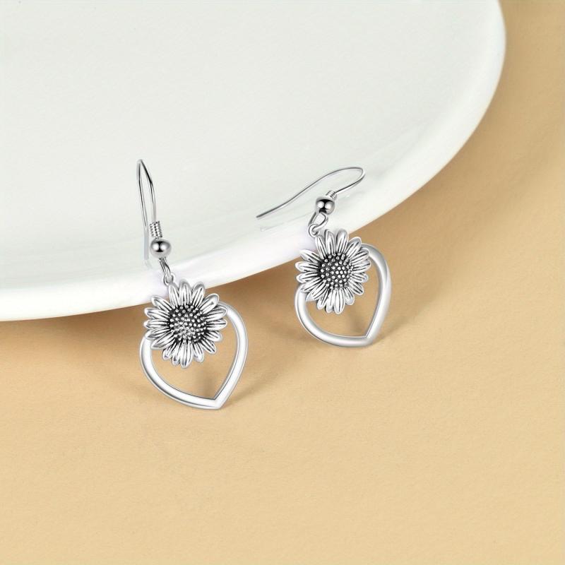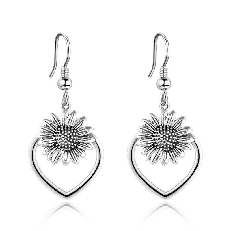 925 Sterling Silver Heart Sunflower Dangle Earrings
