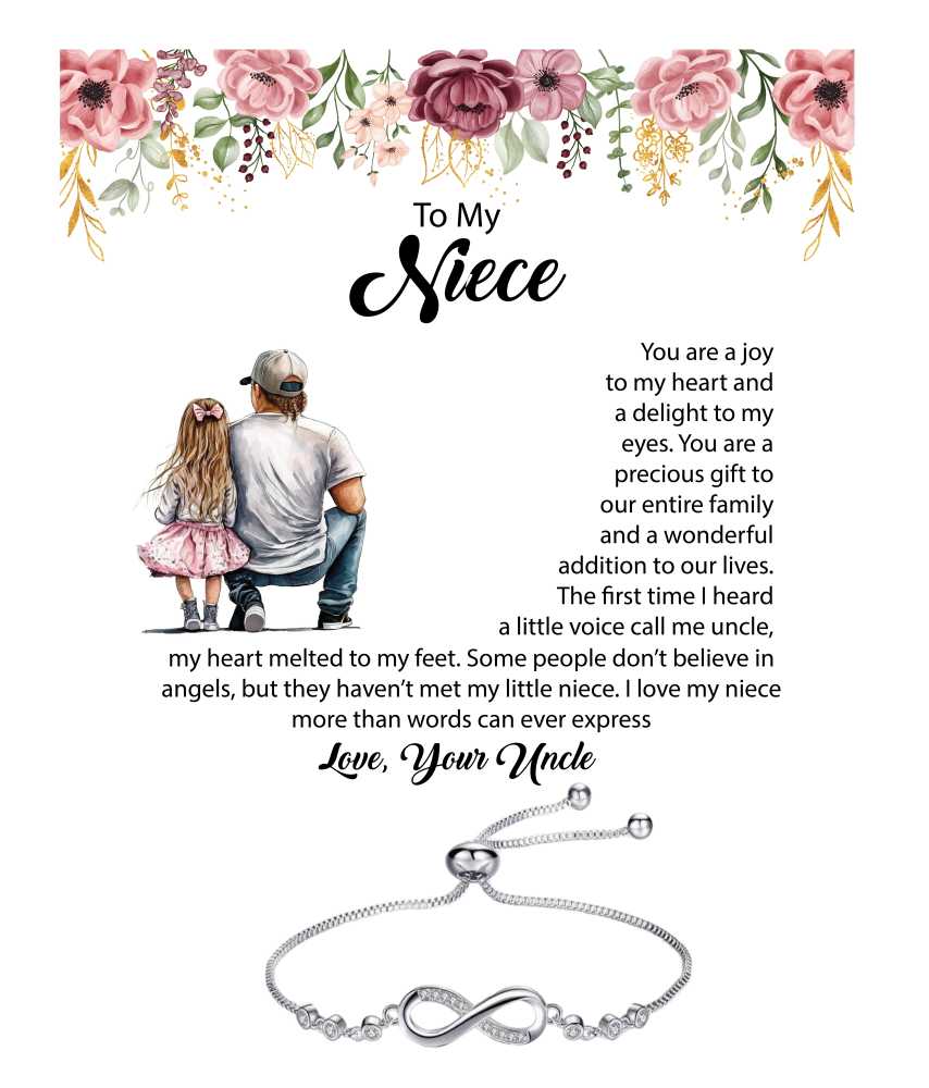Bling Queen is an affordable fashion jewellery brand with various product types like bracelets, necklaces, earrings, rings, etc. suitable for women, men and kids. This elegant silver zirconia studded infinity bracelet is a heartfelt gift crafted to celebrate the special bond between you and your niece. The bracelet features a beautifully designed infinity symbol, representing eternal love and the unbreakable connection you share. The infinity charm is adorned with high quality cubic zirconia stones, meticulously set to create a sparkle that captures the light beautifully, reflecting the joy and brilliance of your niece's spirit. Crafted from premium silver plating, this bracelet shines brightly, making it suitable for everyday wear as well as special occasions. Accompanying the bracelet is a beautifully designed message card that enhances the emotional significance of your gift.