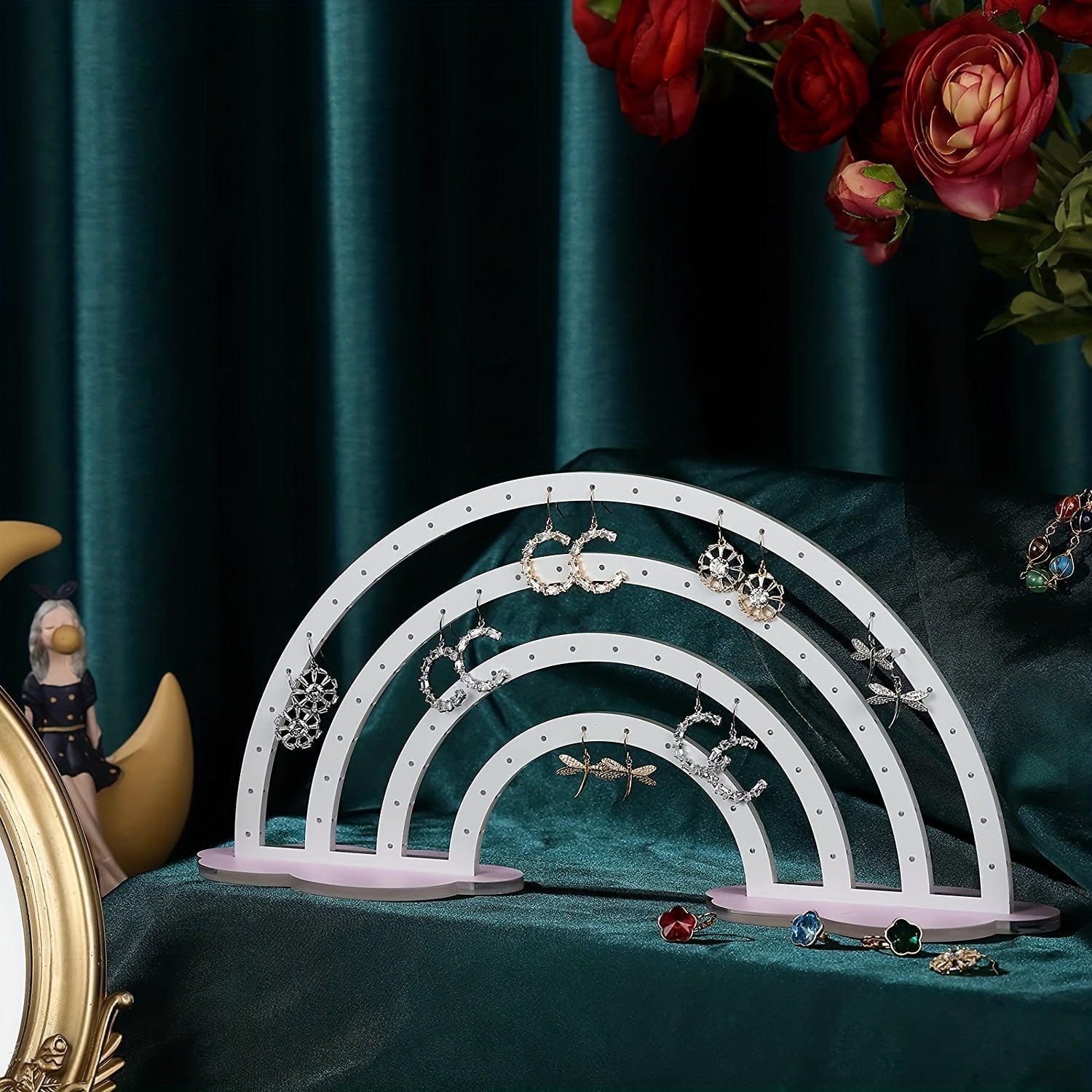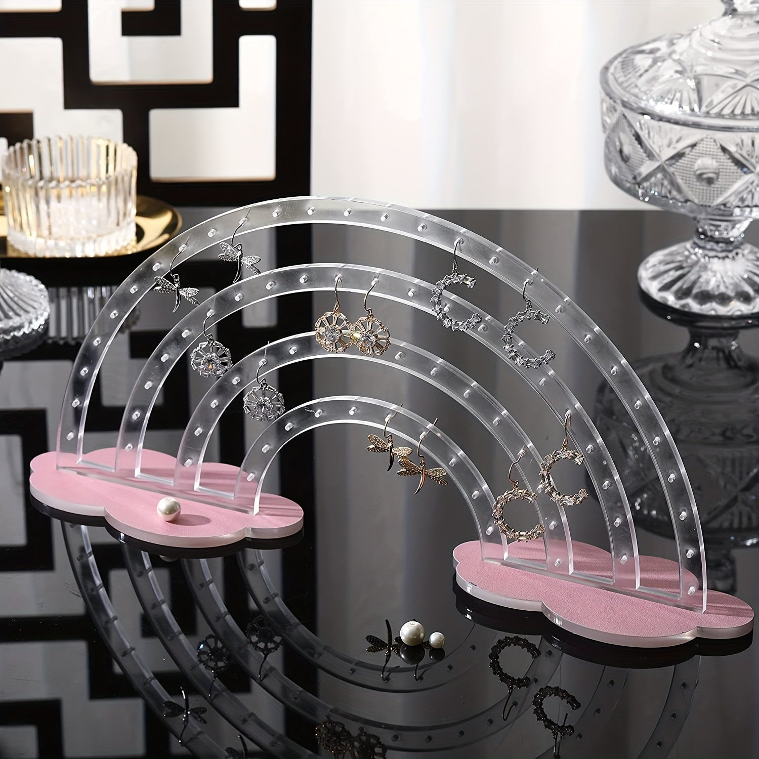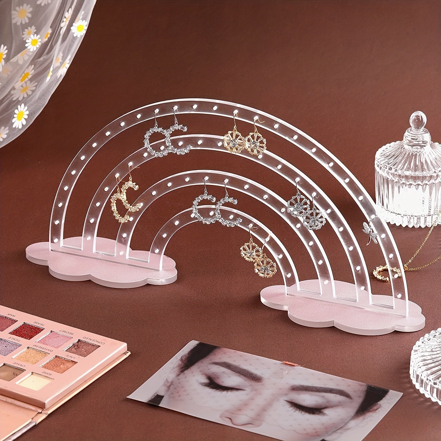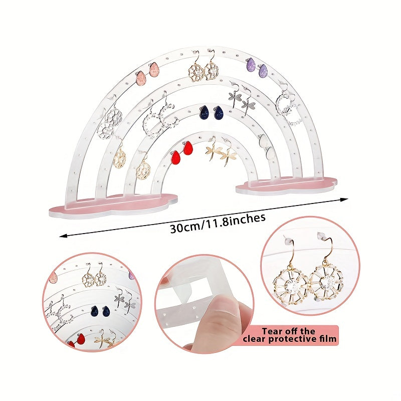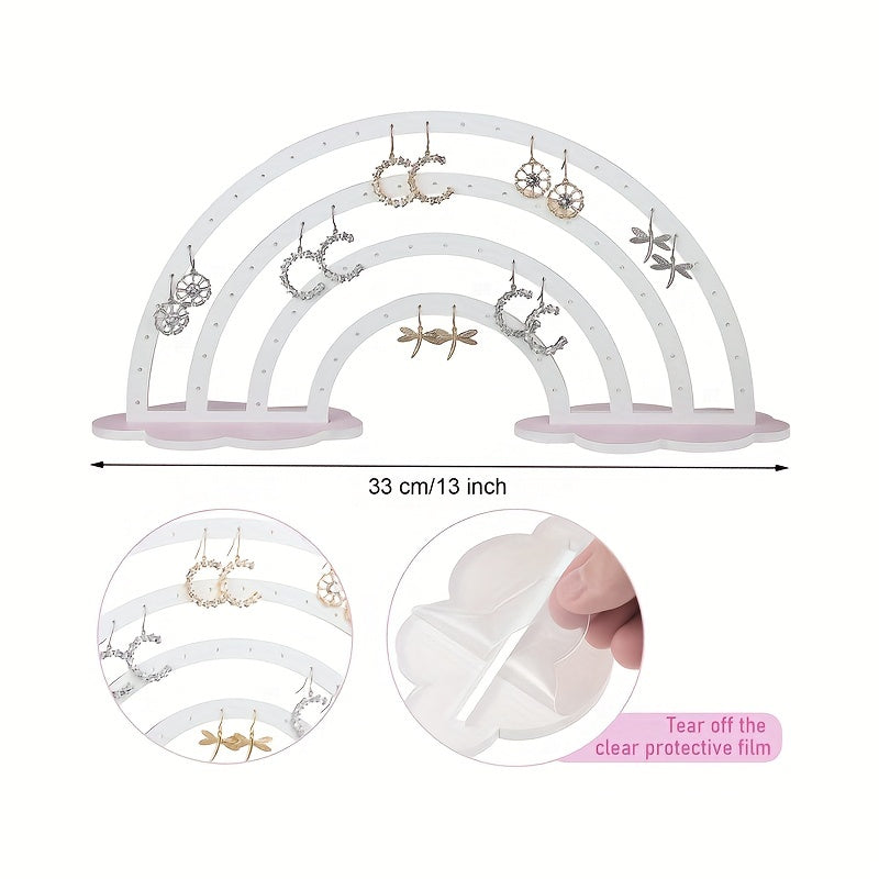 Organize your earrings, rings, necklaces, and bracelets with this cute rainbow cloud-shaped display holder made of transparent acrylic.