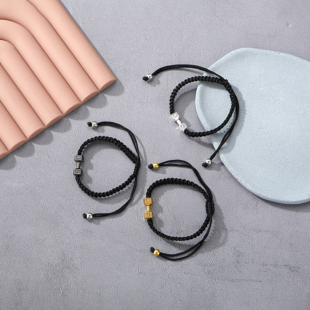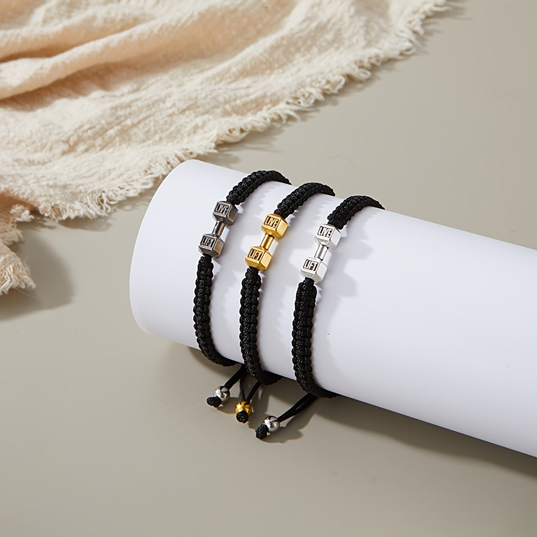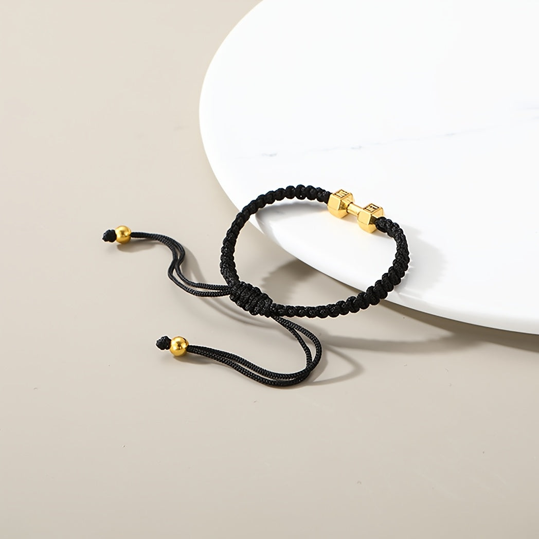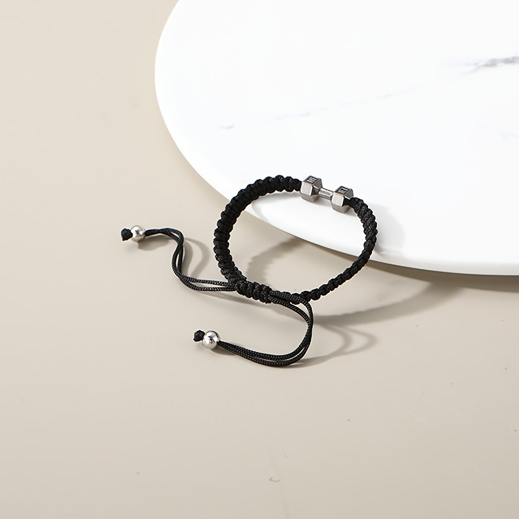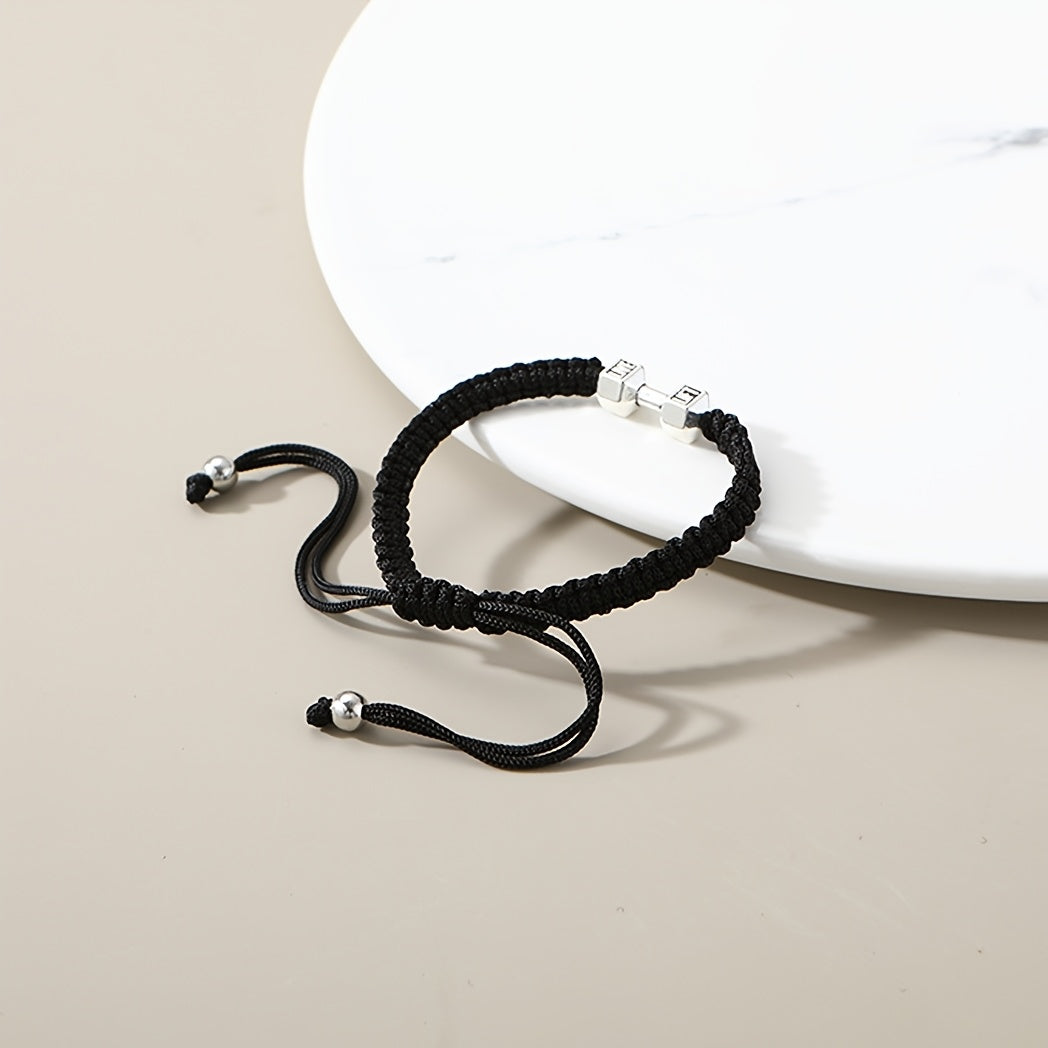 This adjustable woven rope bracelet features a stainless steel dumbbell connection. Perfect for gifting and suitable for everyday wear with a vacation style.