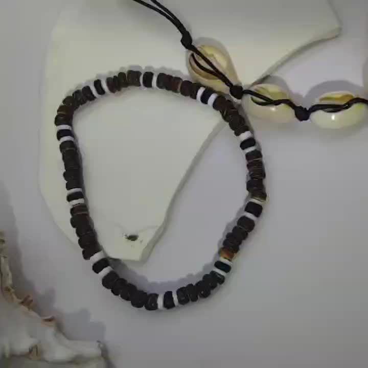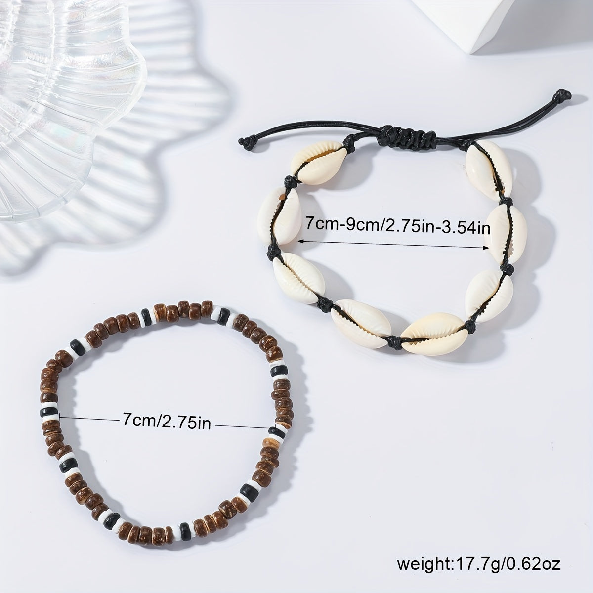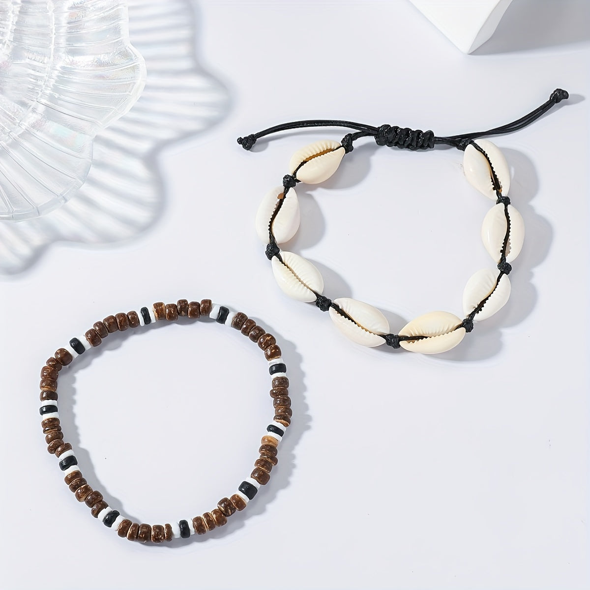 This vintage set includes dual-layer shell anklets and wooden bead bracelets for a bohemian beach look.