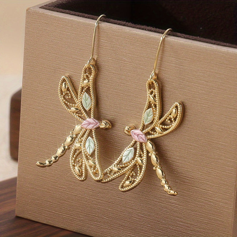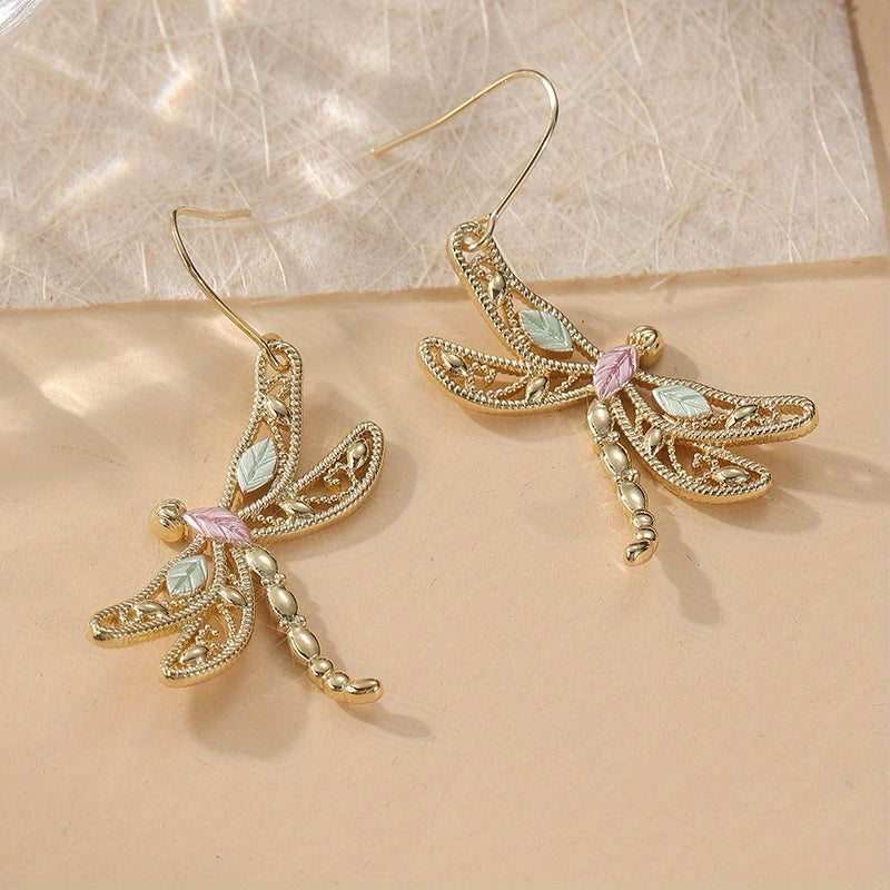 Chic pair of retro bohemian dragonfly pendant earrings featuring hollowed out design with green and pink gemstones. Made of KC golden plated copper, this jewelry is perfect for women for Christmas and daily wear.