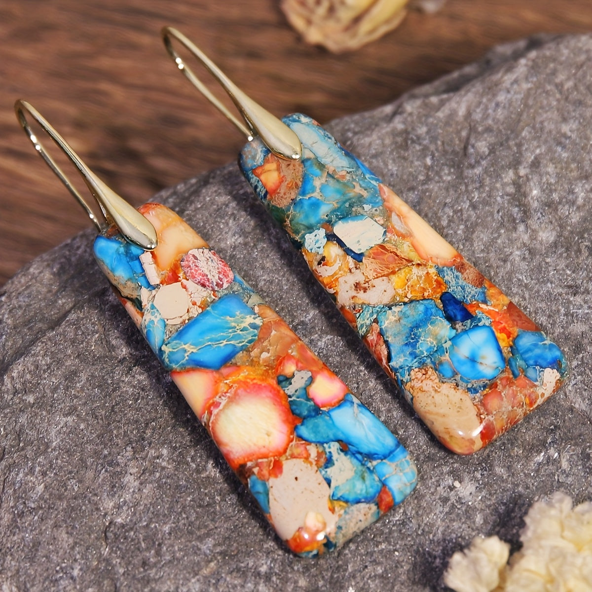 These vintage bohemian drop earrings feature natural stone teardrops with an orange floral pattern, perfect for summer vacation or daily wear.