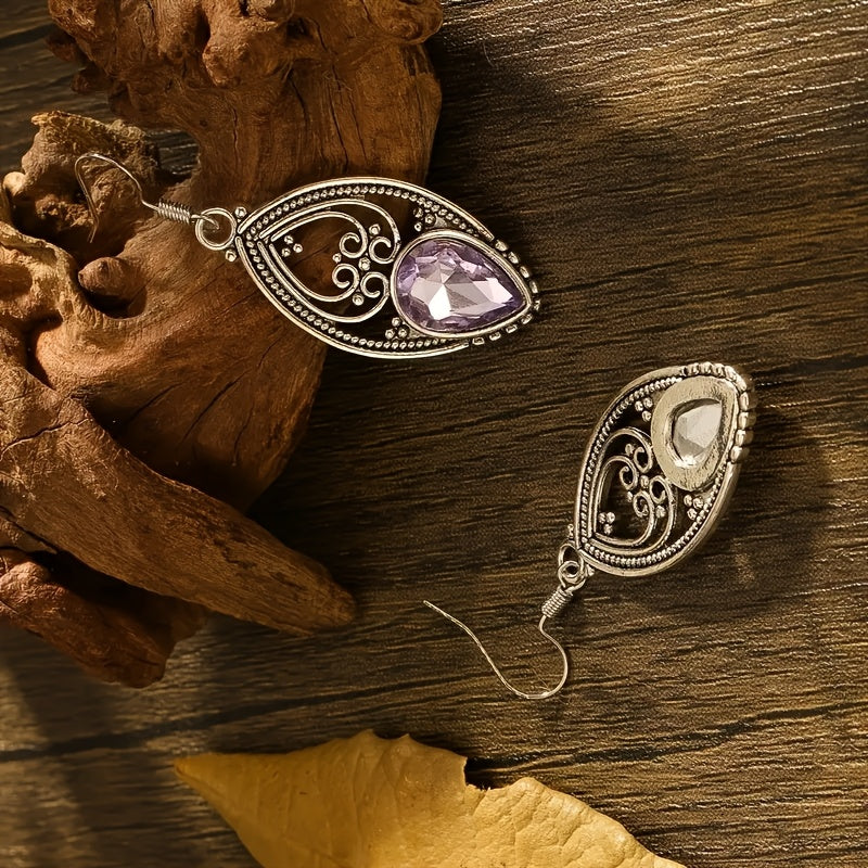 Add a touch of vintage charm to your daily look with these intricate filigree teardrop earrings featuring a beautiful purple gemstone. Made of copper with K plating, these earrings are perfect for gifting and ideal for all seasons.