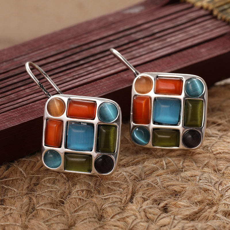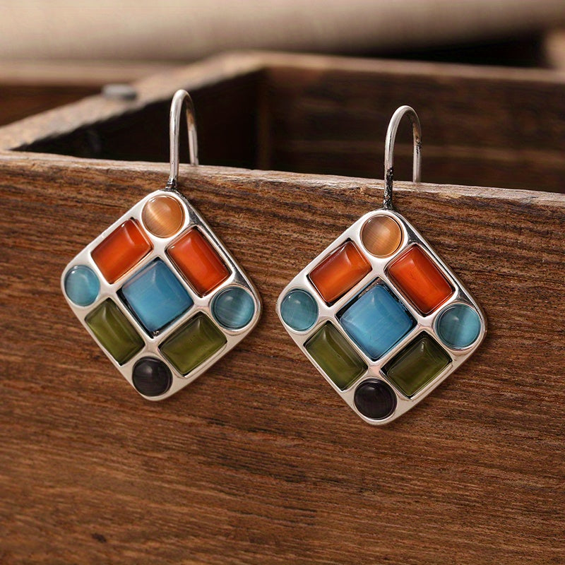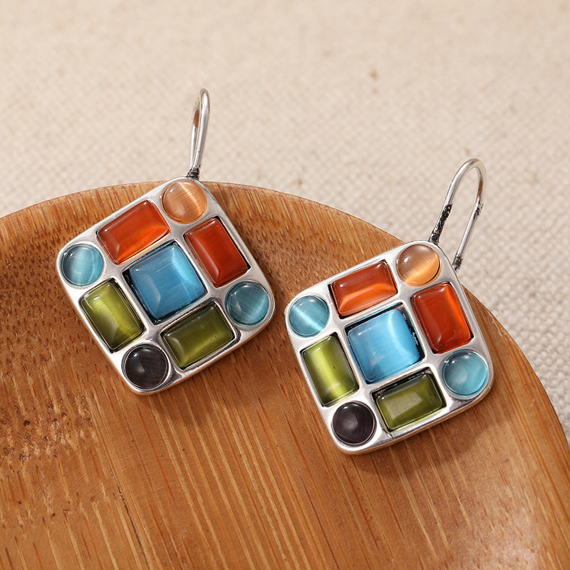 Bohemian Square Dangle Earrings Colorful Mosaic Stones Copper Hooks