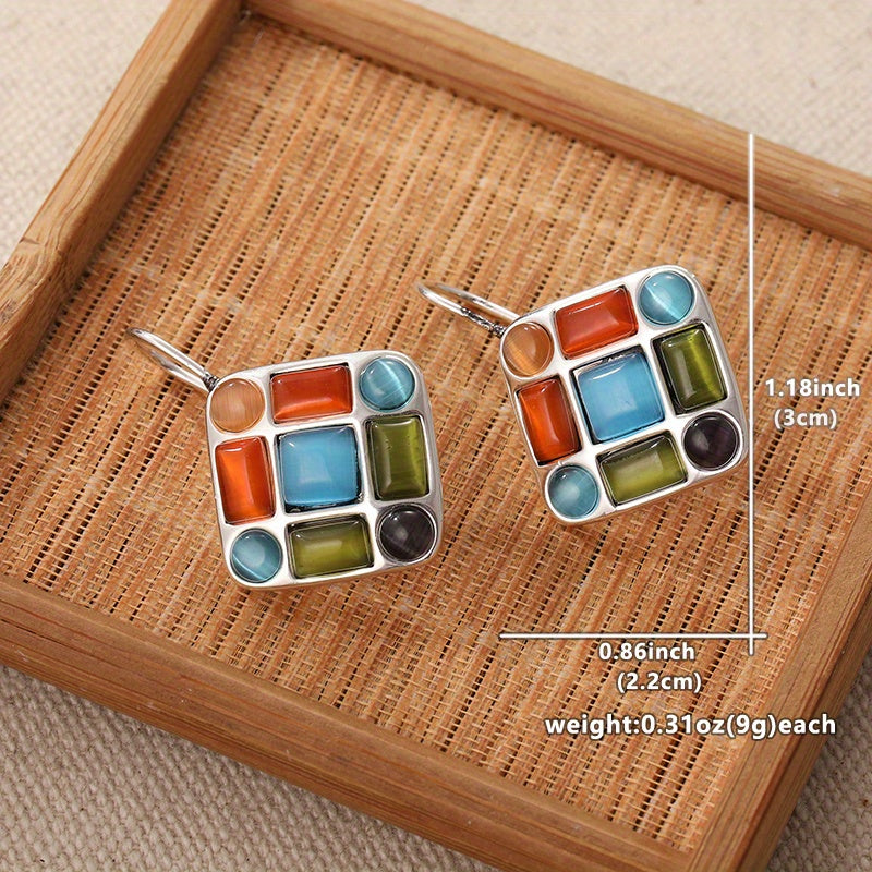 These vintage bohemian square dangle earrings feature a colorful mosaic design with turquoise, orange, green, and purple stones. The earrings are made with copper hooks, making them a perfect gift for women to wear every day.