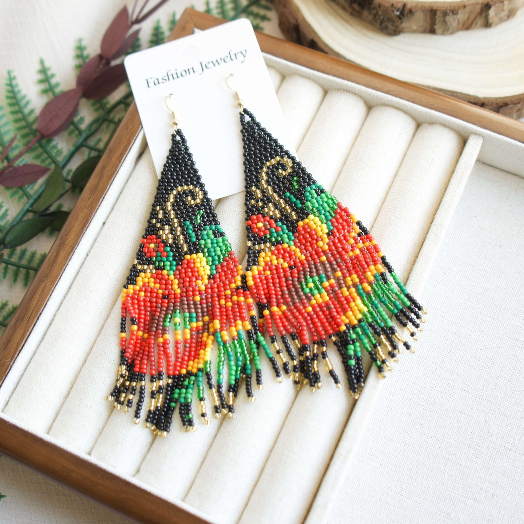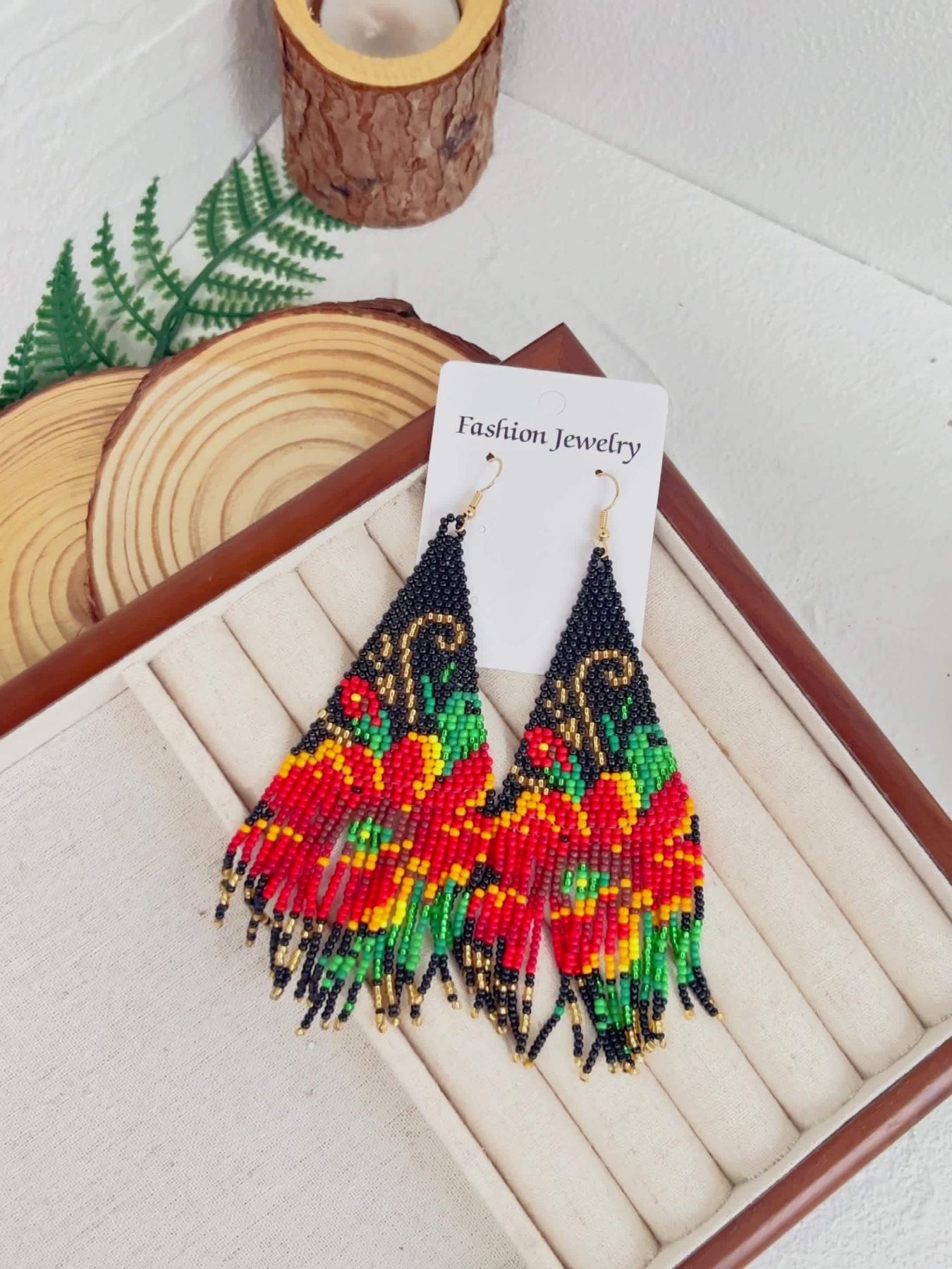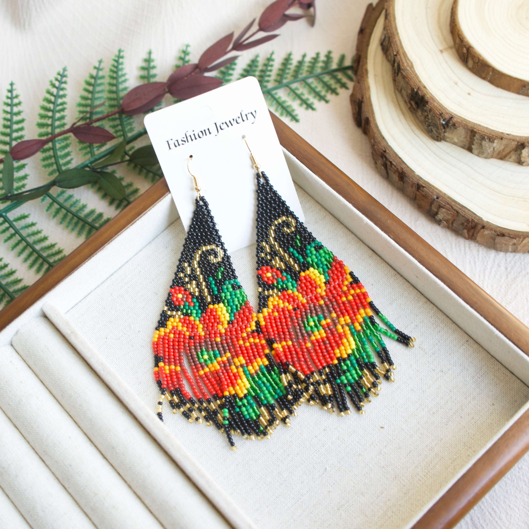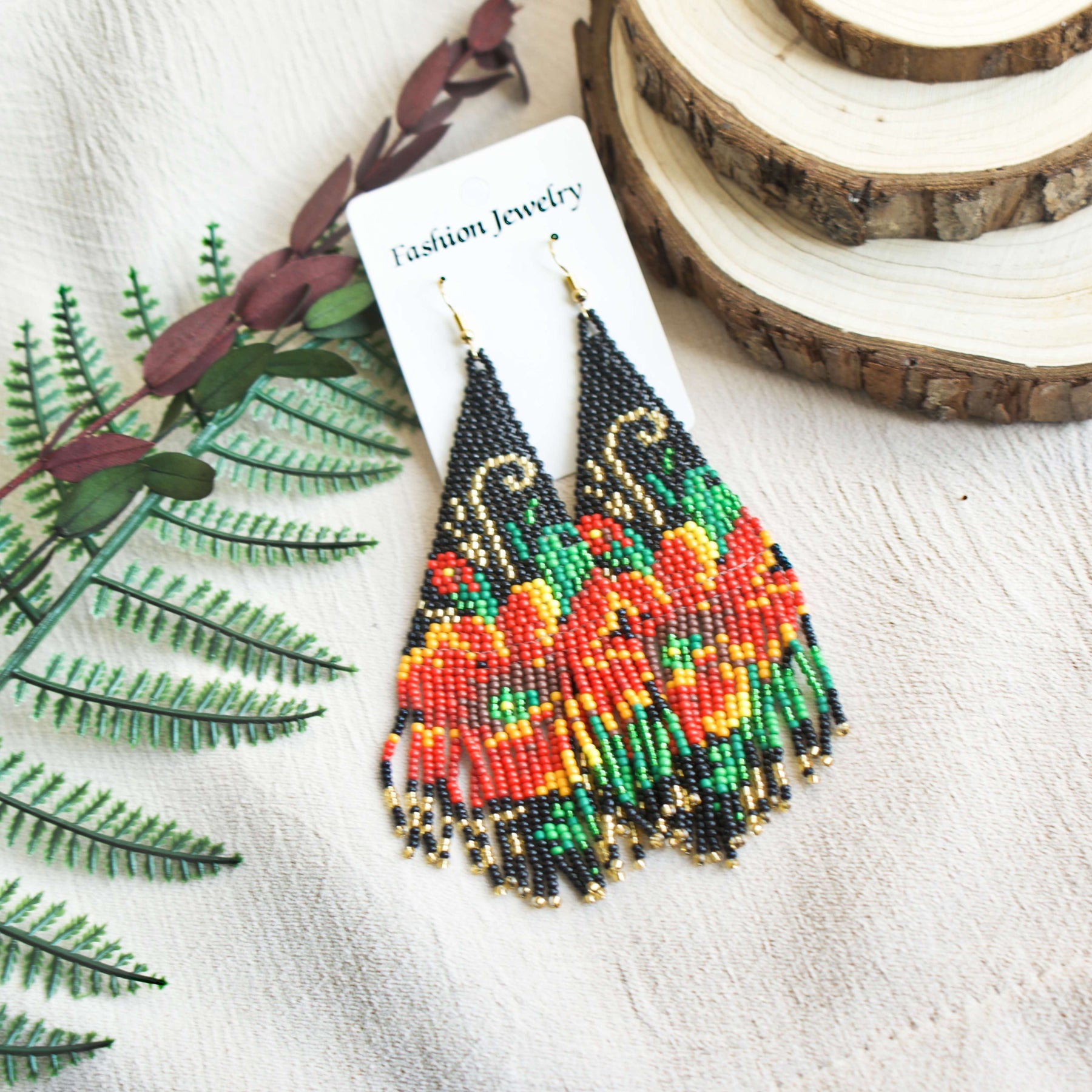 Add a touch of bohemian flair to your outfit with these unique earrings featuring rice bead flower drops and exaggerated tassels.