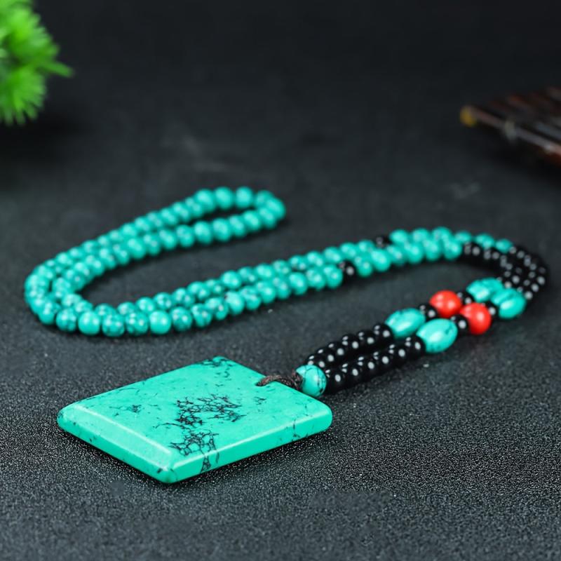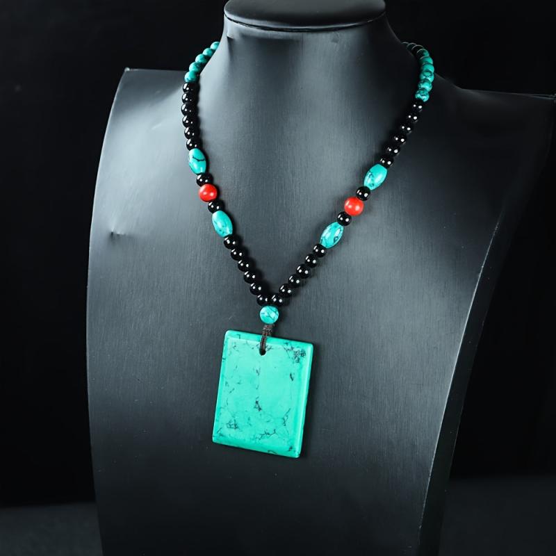 Bohemian Turquoise Pendant Necklace with Beads and Red Accents