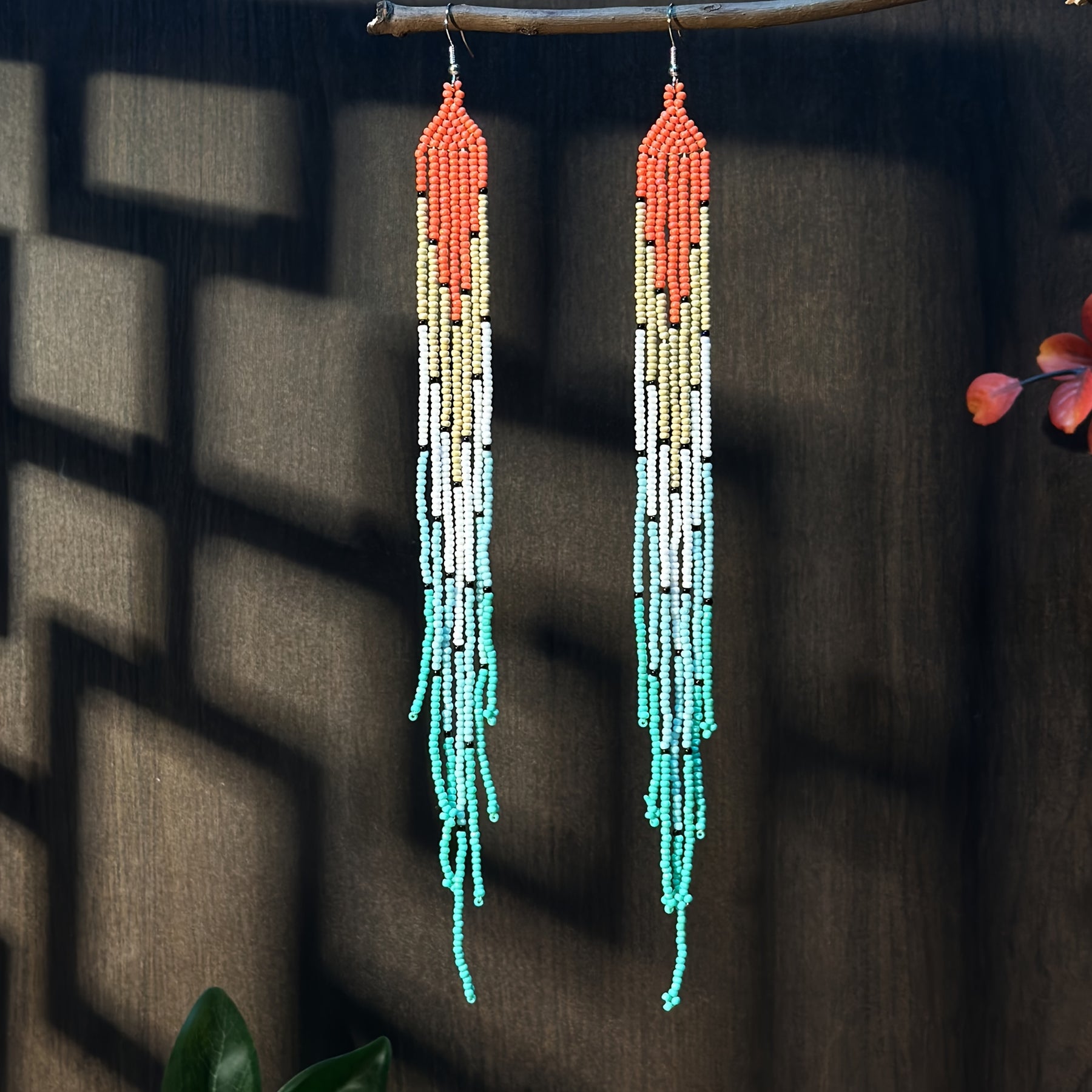 Handcrafted seed bead earrings in a vibrant rainbow gradient with accents. These extra long tassel earrings are perfect for a boho look.
