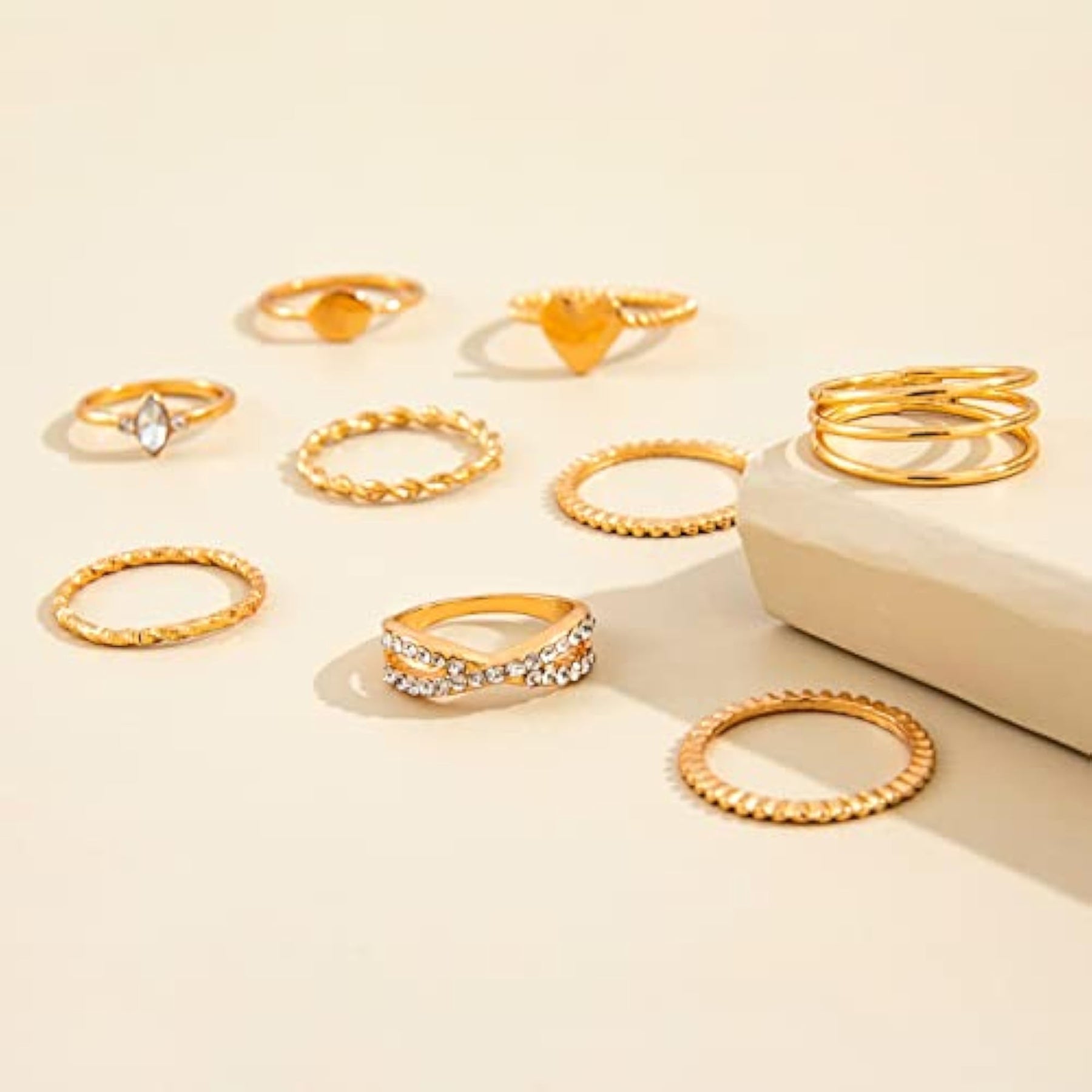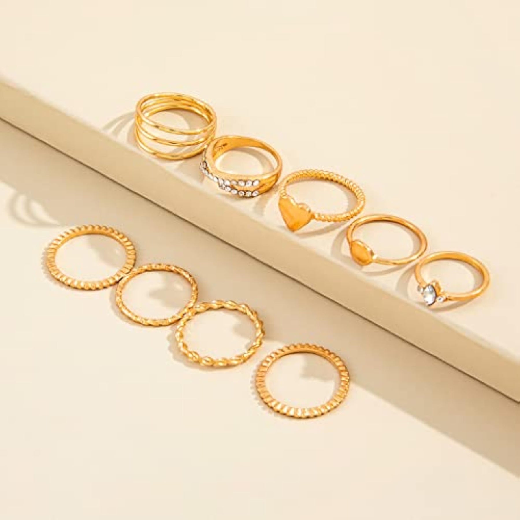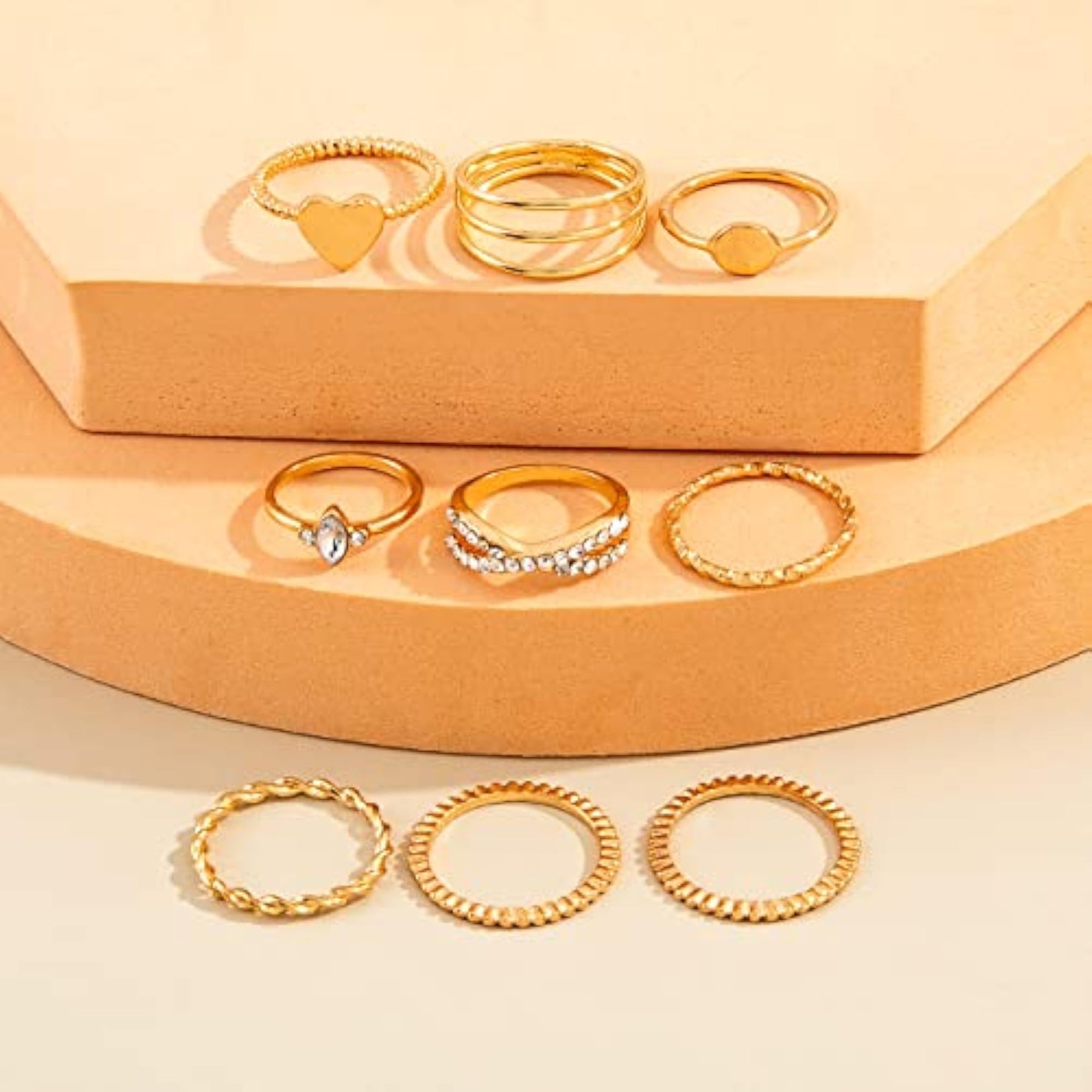 Enhance your bohemian style with this set of 9 midi finger rings. Made of metal, these rings are perfect for stacking or wearing individually.