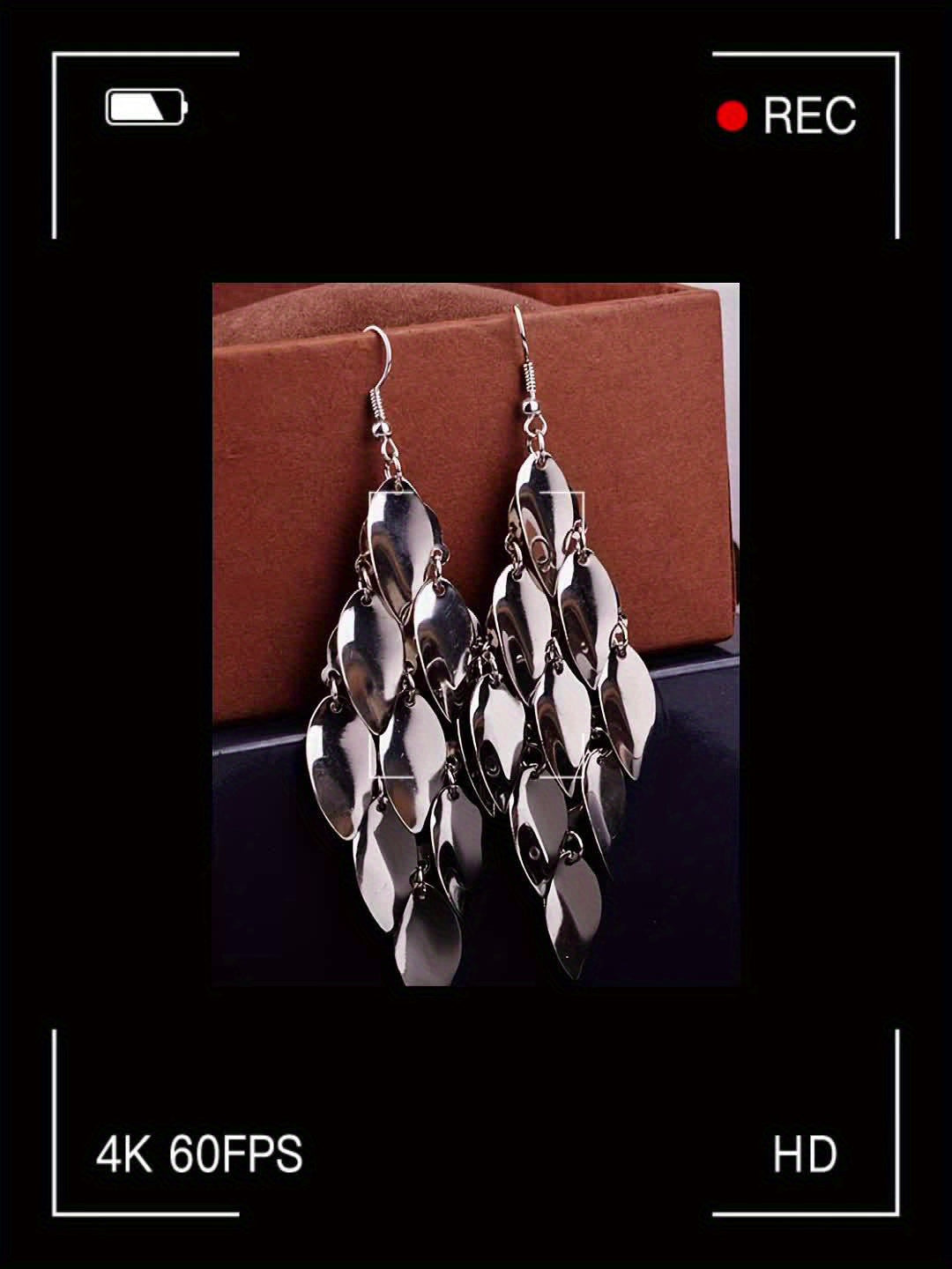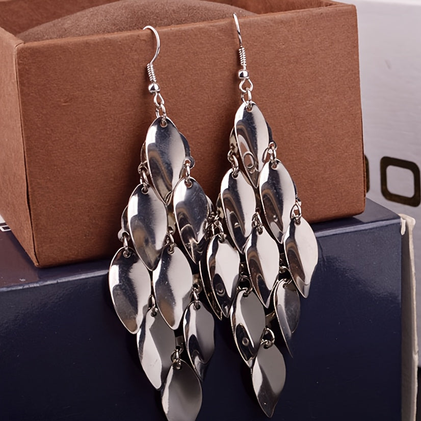 Add a touch of vintage boho style with these long golden leaf dangle earrings. The layered metal leaves feature a sparkling texture, perfect for daily wear or as a gift. The earrings have nickel posts for everyday comfort.