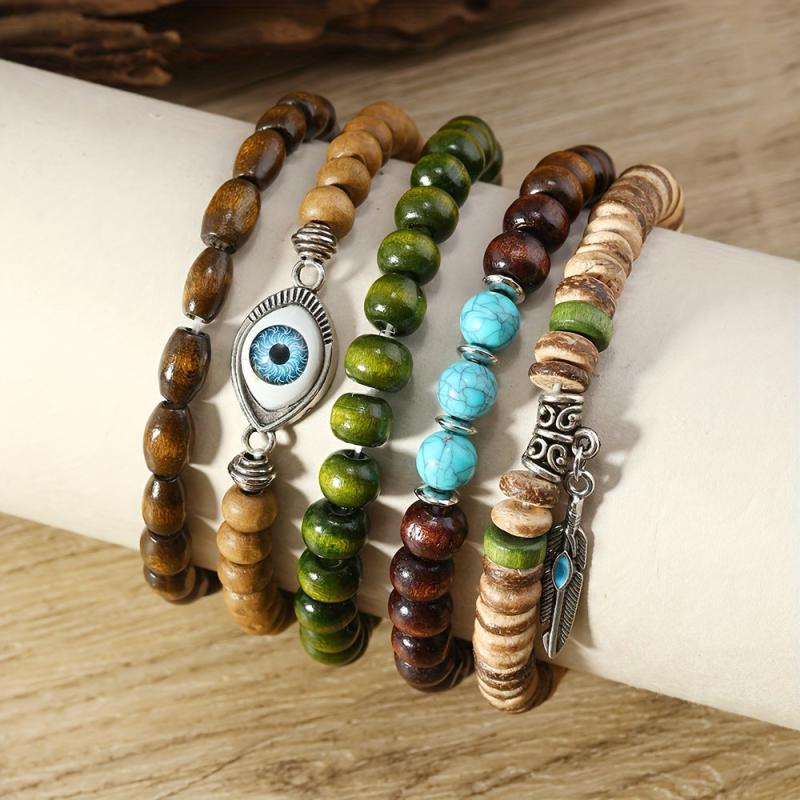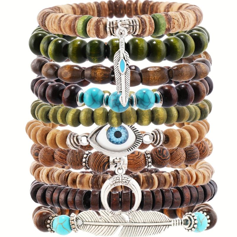 This 10 piece bracelet set includes natural wood and turquoise beads with feather, evil eye, and wing charms. Perfect for couples looking for matching jewelry.