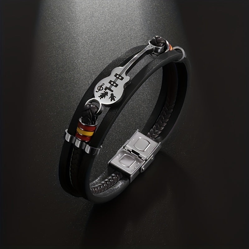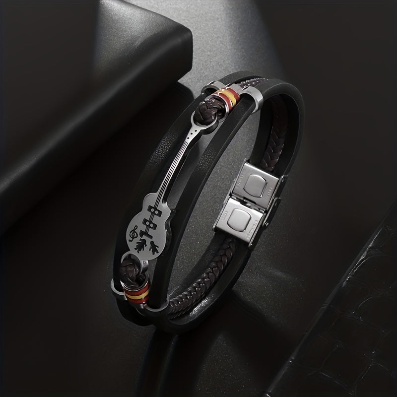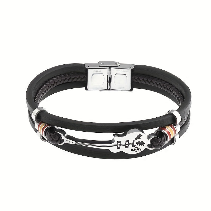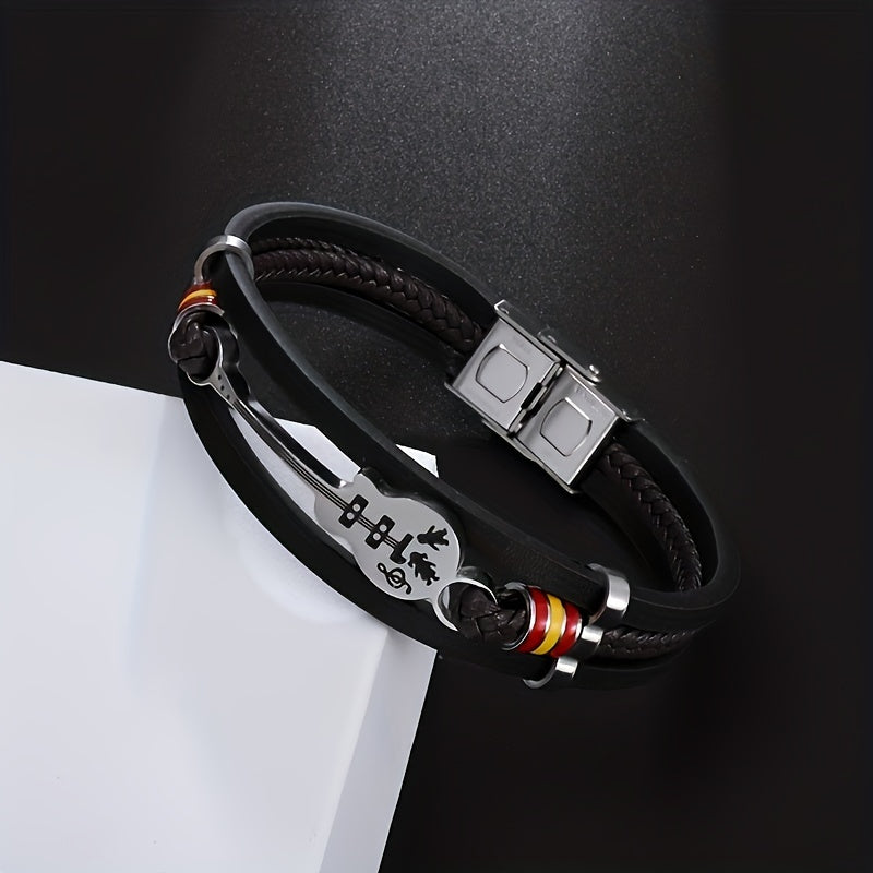 Get ready to rock with this stylish braided faux leather guitar bracelet, perfect for parties and concerts. Channel your inner rock star with this fashionable music-inspired accessory.