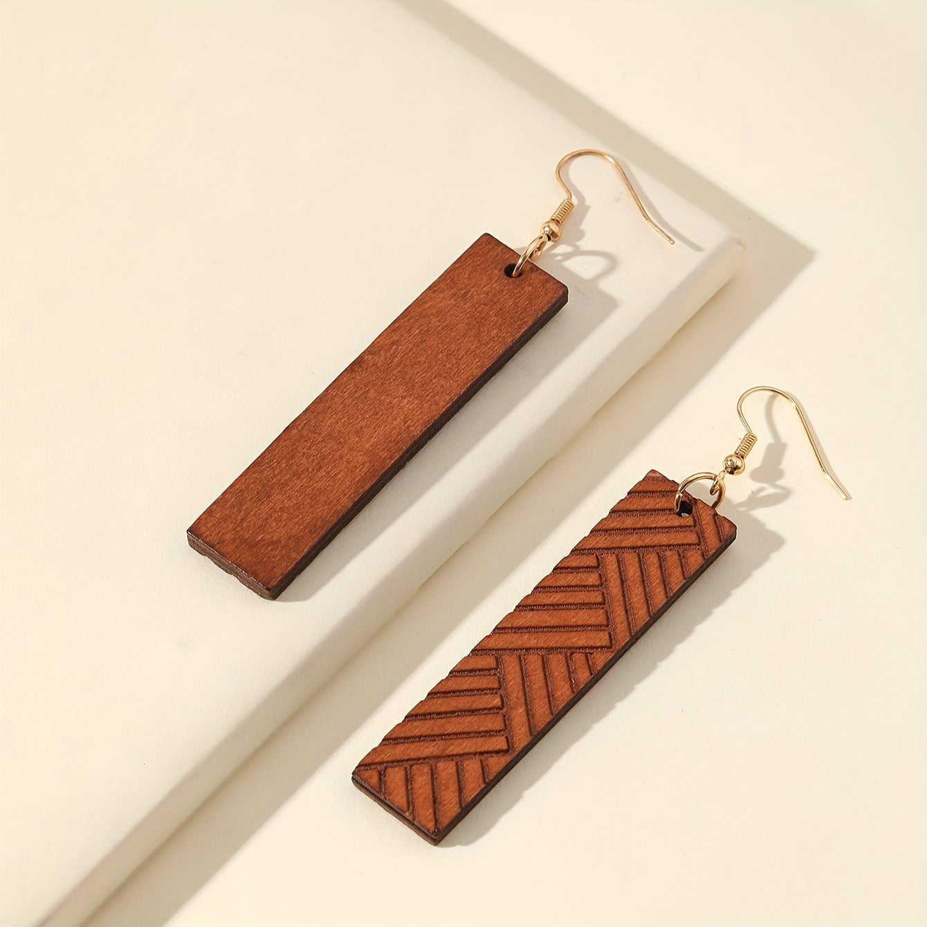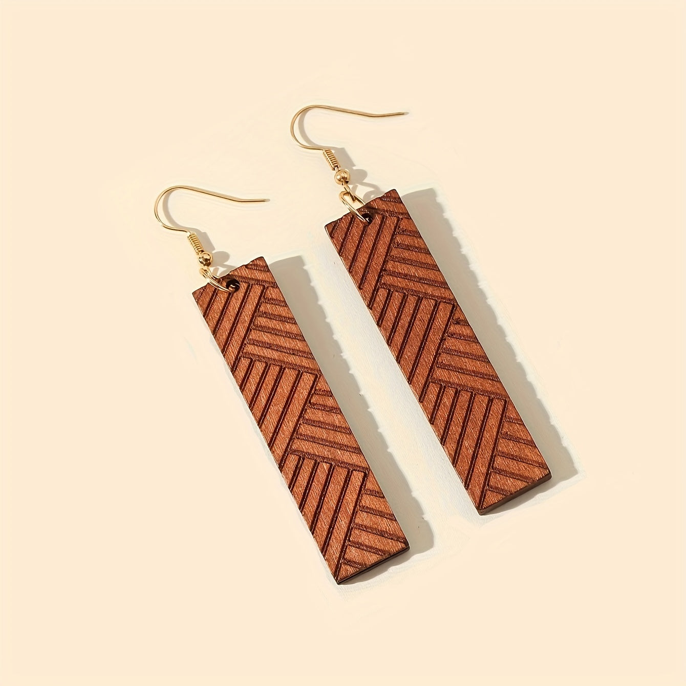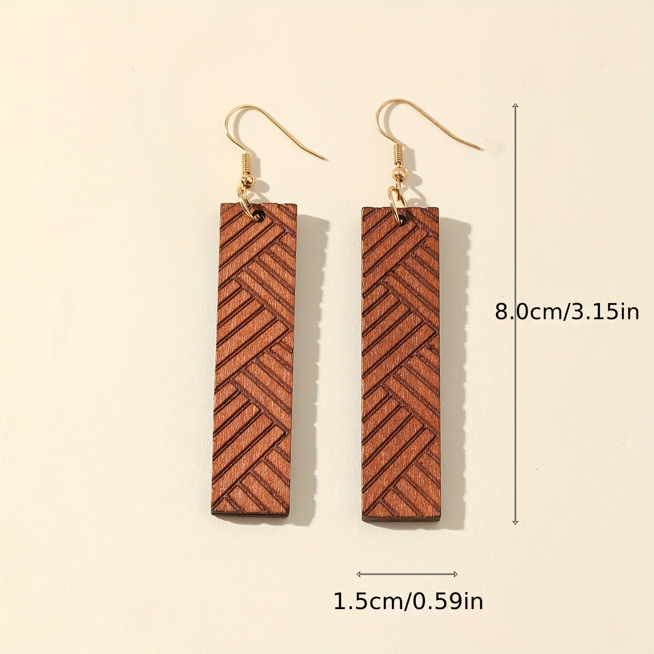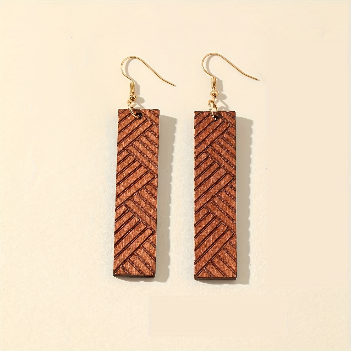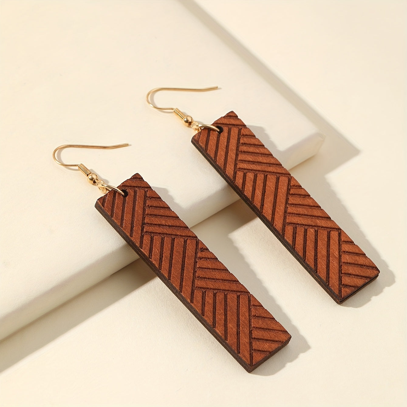 Complete your fall and winter looks with these retro-style brown dangle earrings made of wooden material.