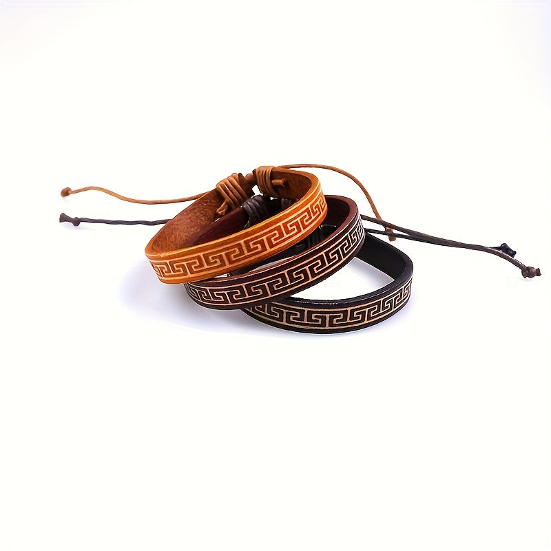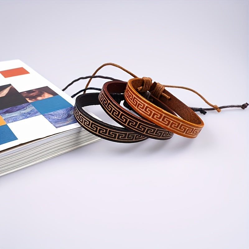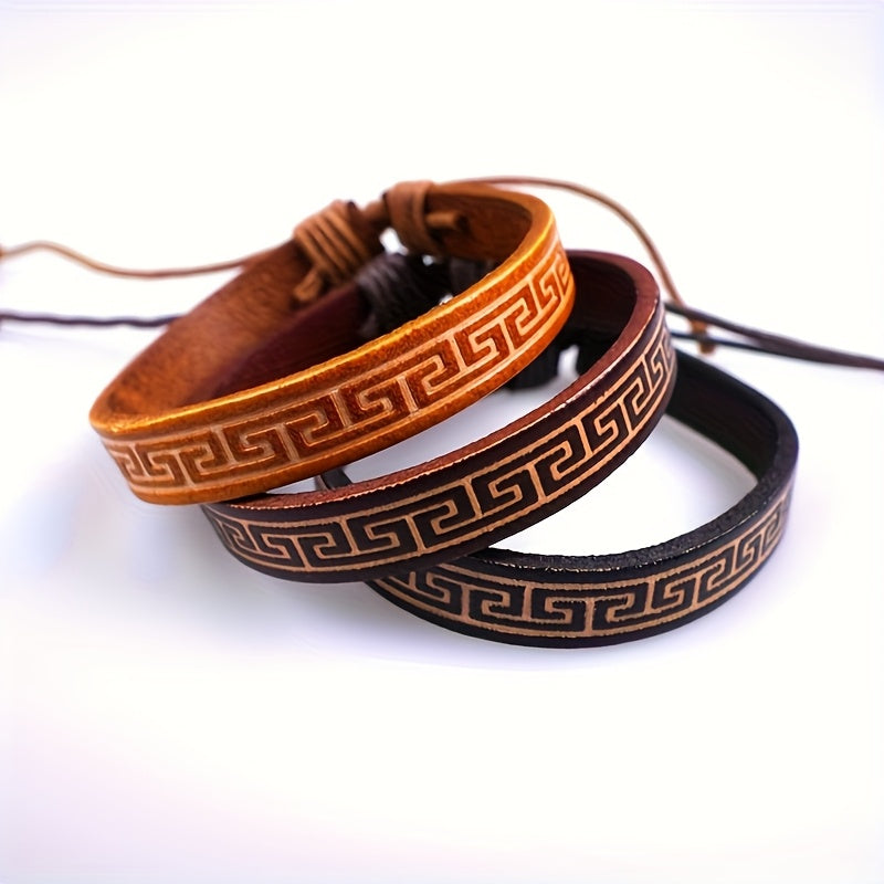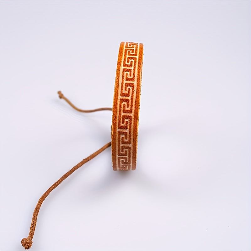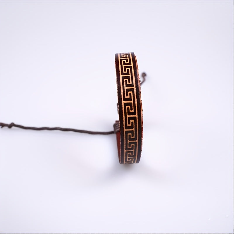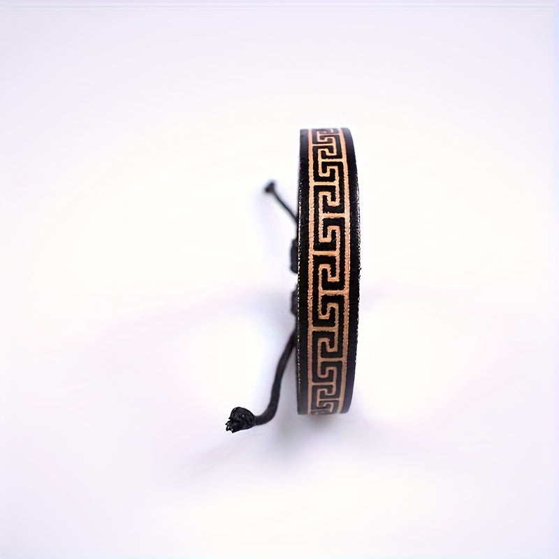 This wide burgundy leather bracelet features an embossed Greek Key design with a golden ribbon woven edge. It is a casual style accessory suitable for all occasions.