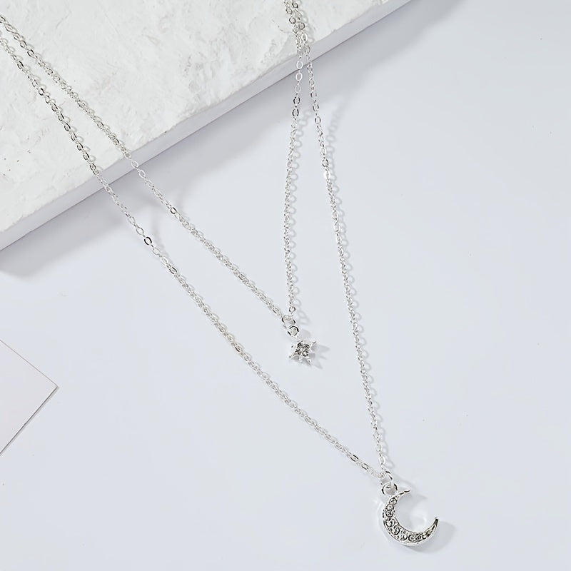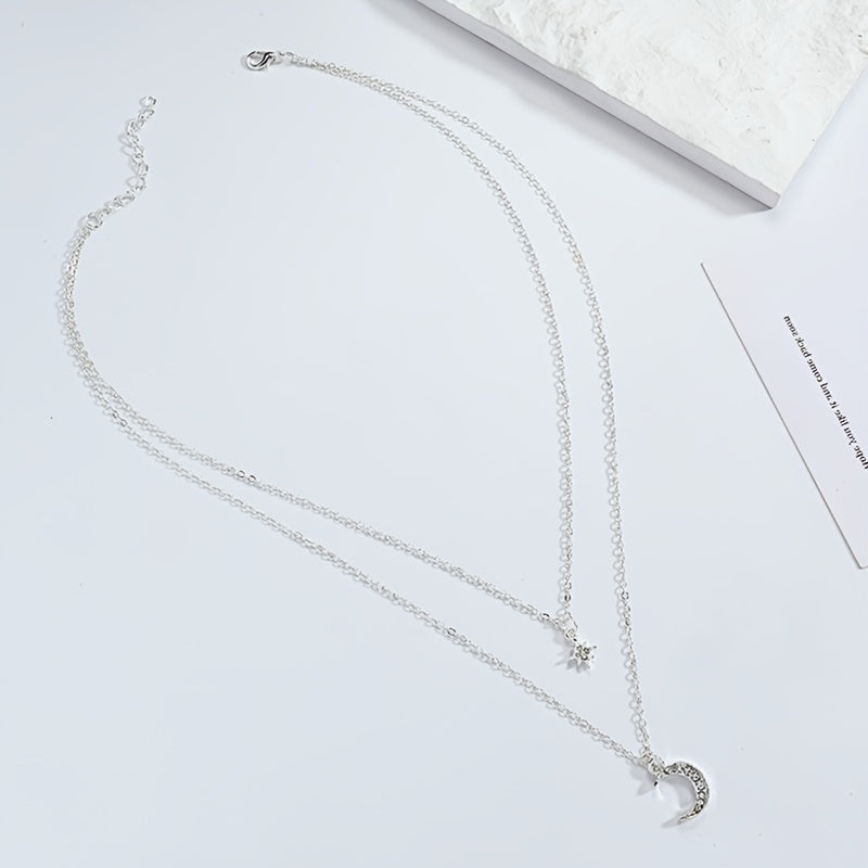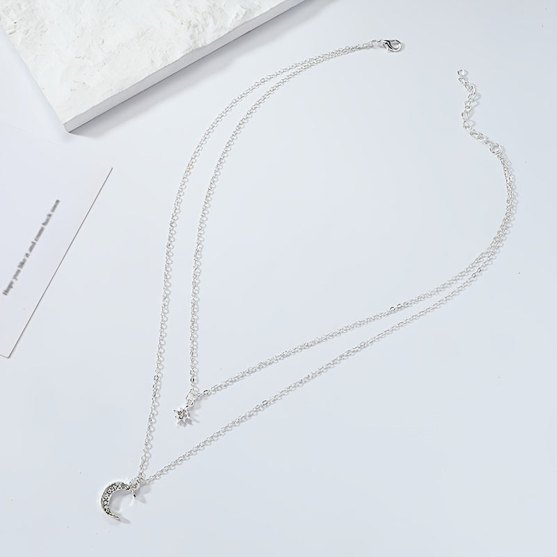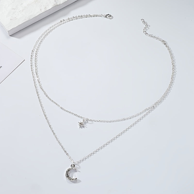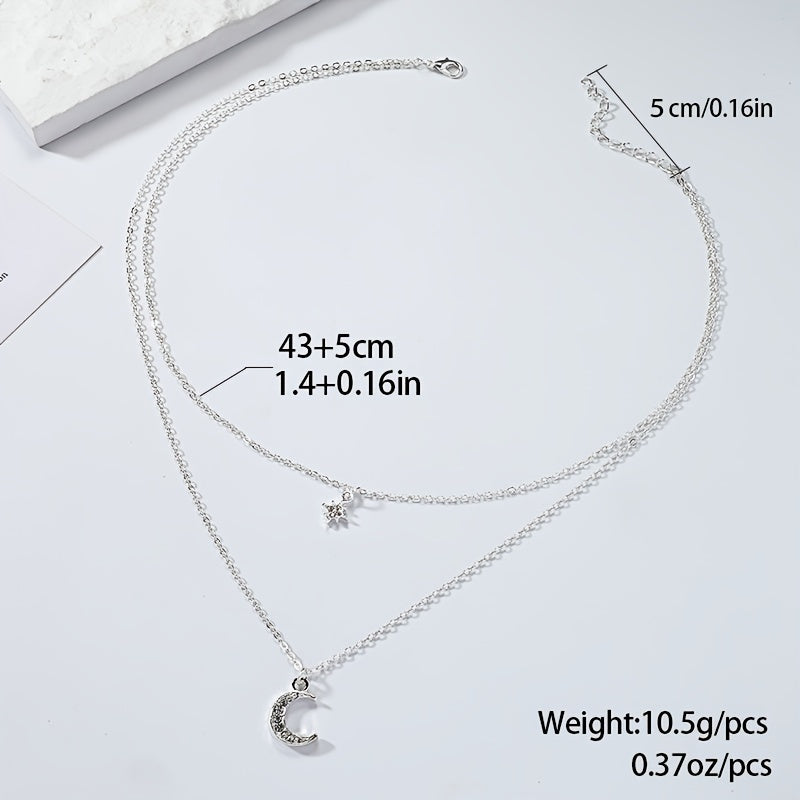This stunning double layer necklace features a rhinestone star and moon design that adds charm to any outfit. It makes a perfect gift for a loved one.