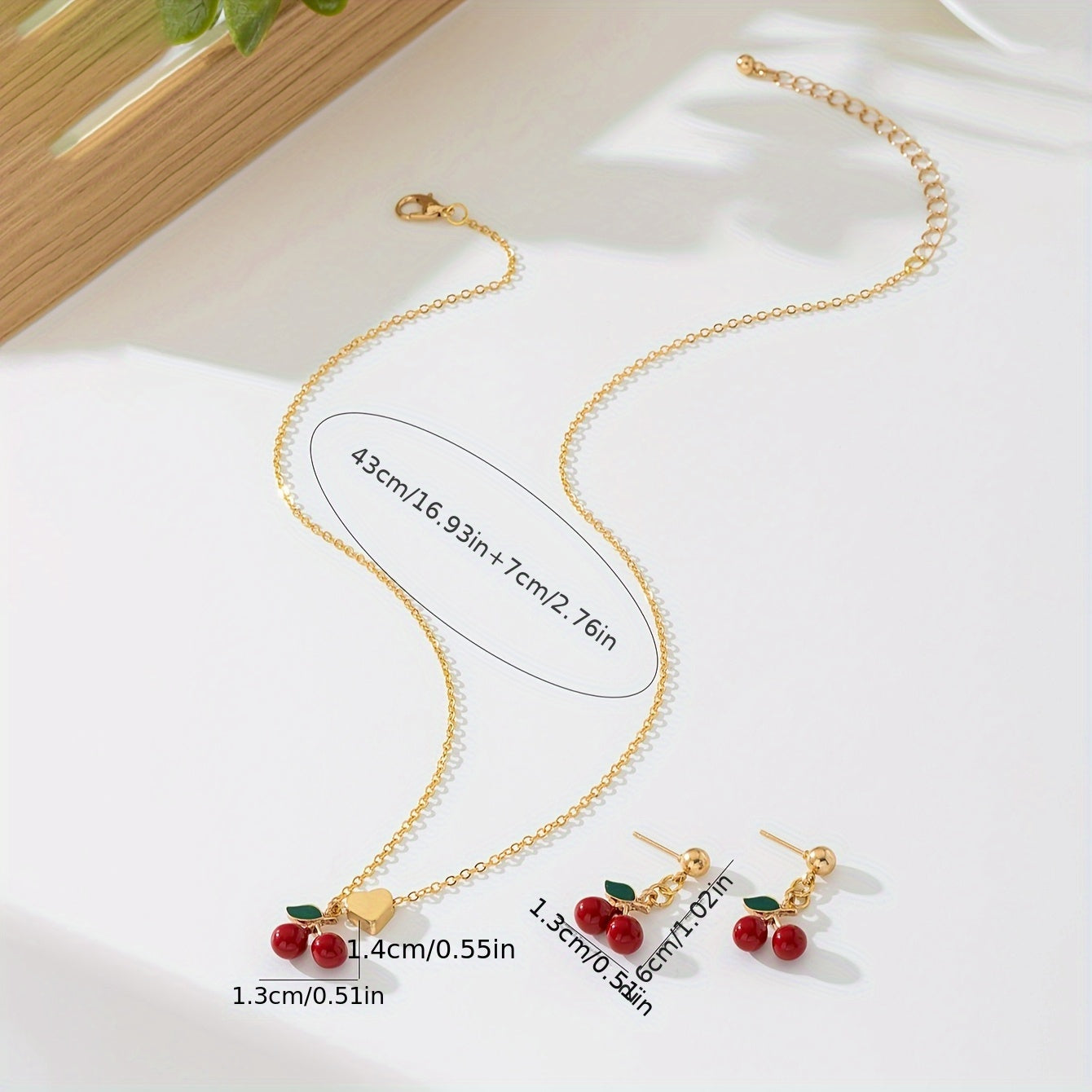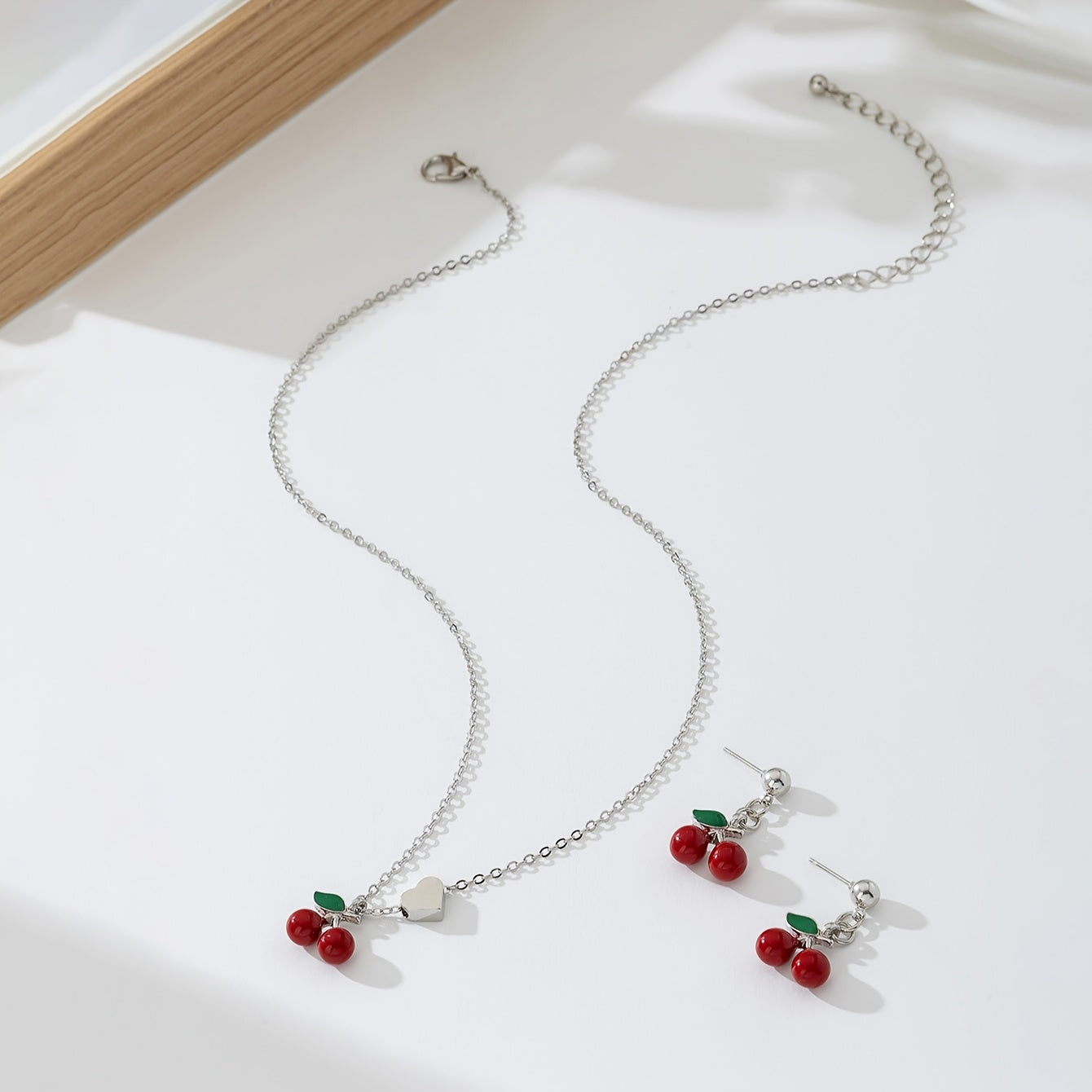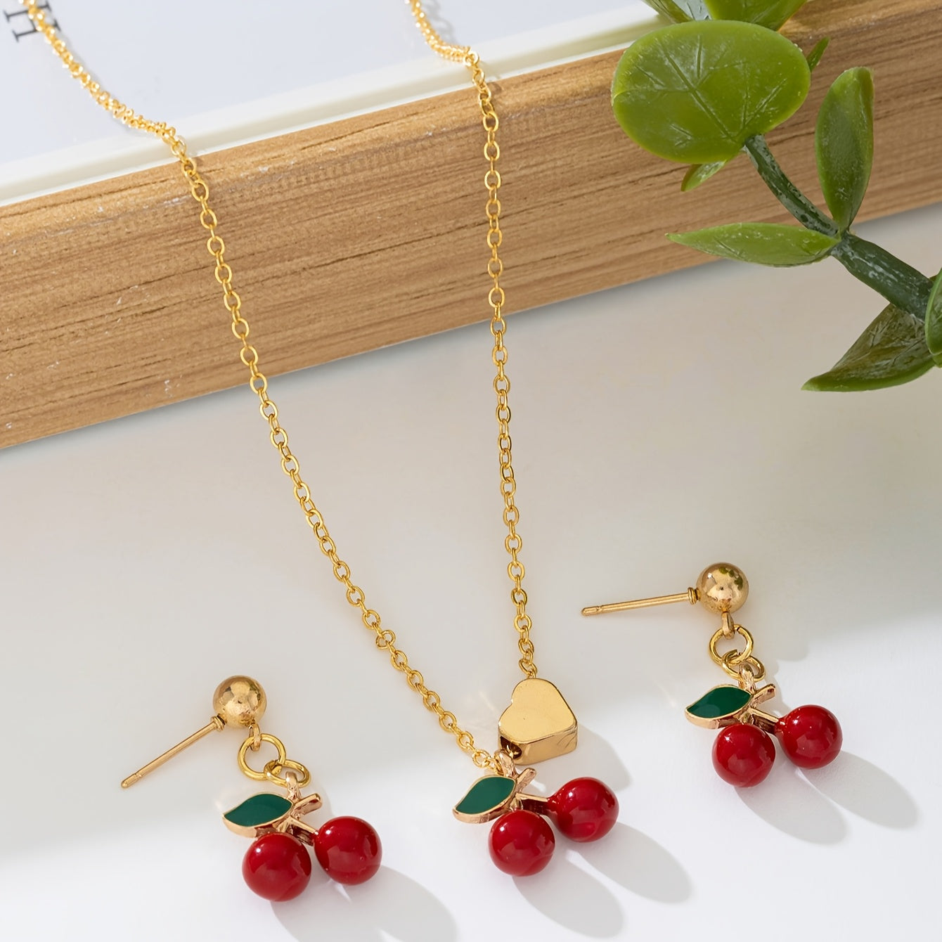 Add a touch of elegance to your casual attire with this 3pcs jewelry set. Includes a cherry necklace, earrings, and a heart pendant, exuding European style charm.