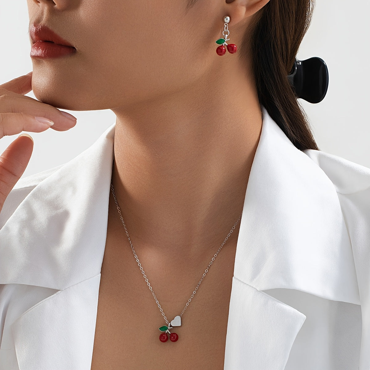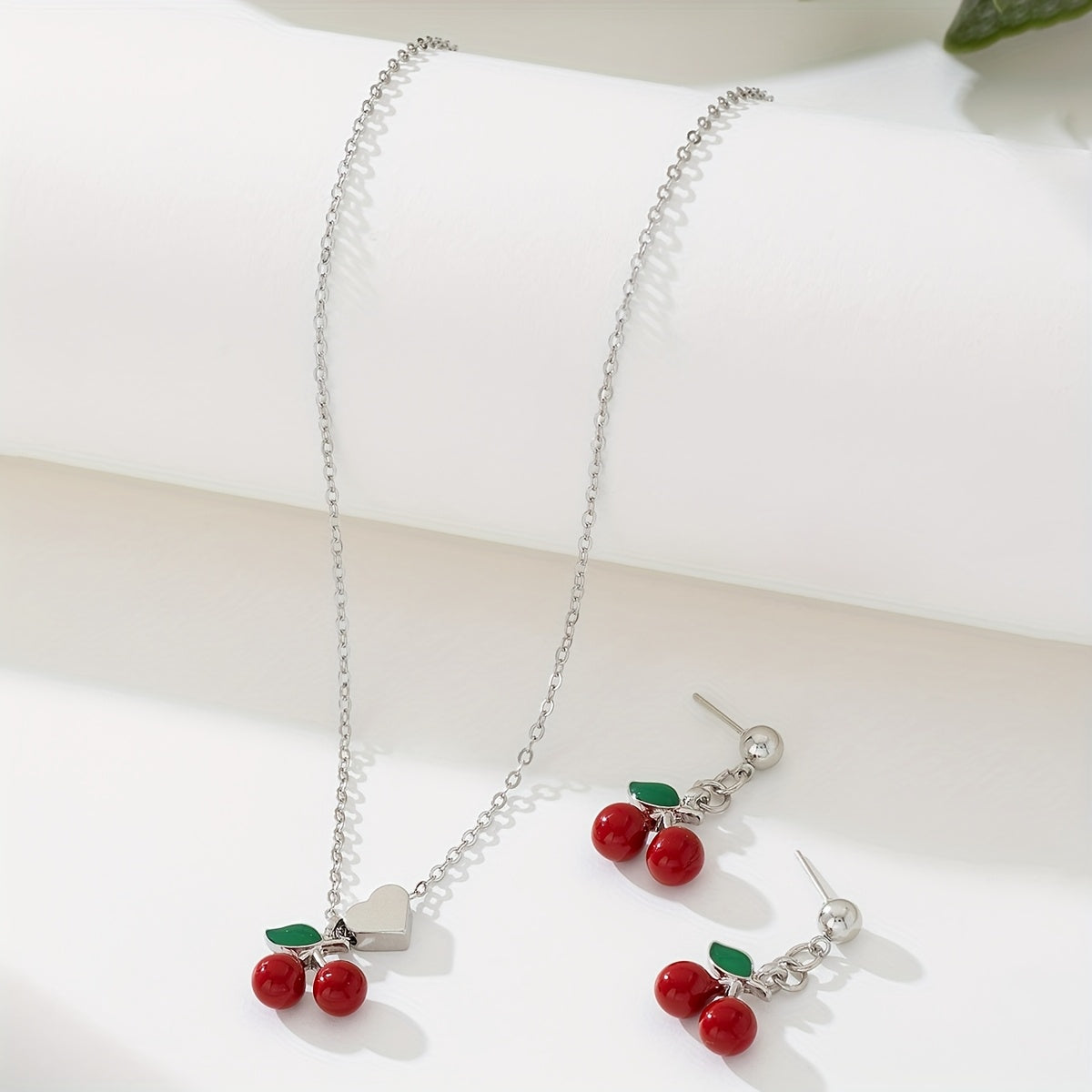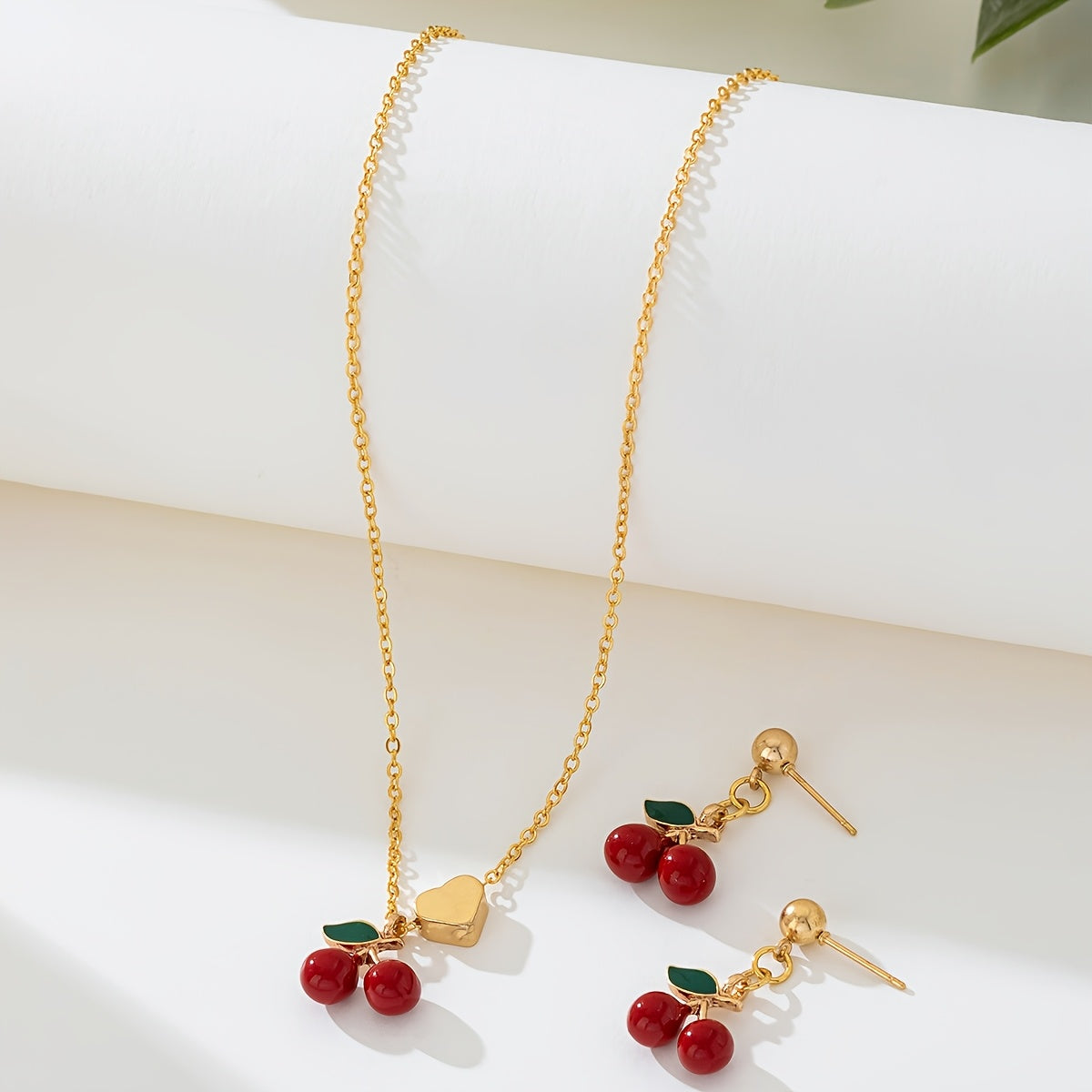 Add a touch of elegance to your casual attire with this 3pcs jewelry set. Includes a cherry necklace, earrings, and a heart pendant, exuding European style charm.