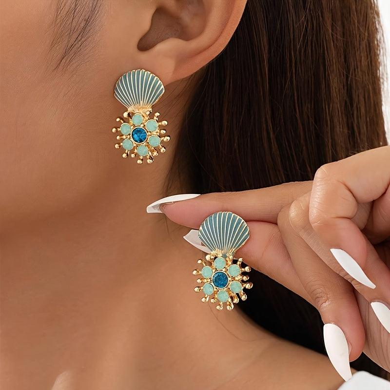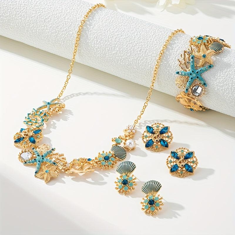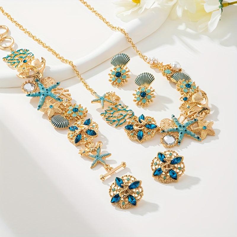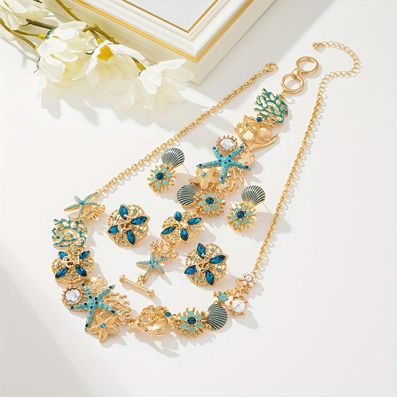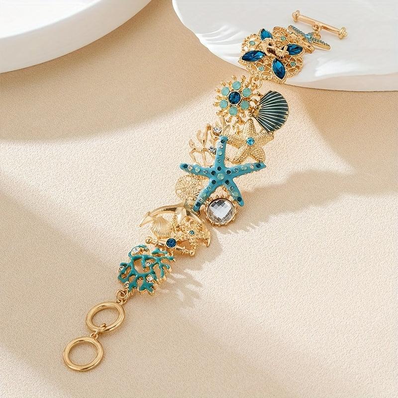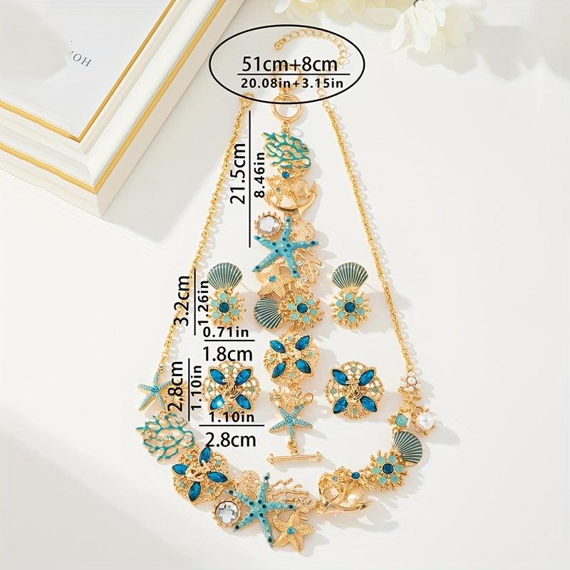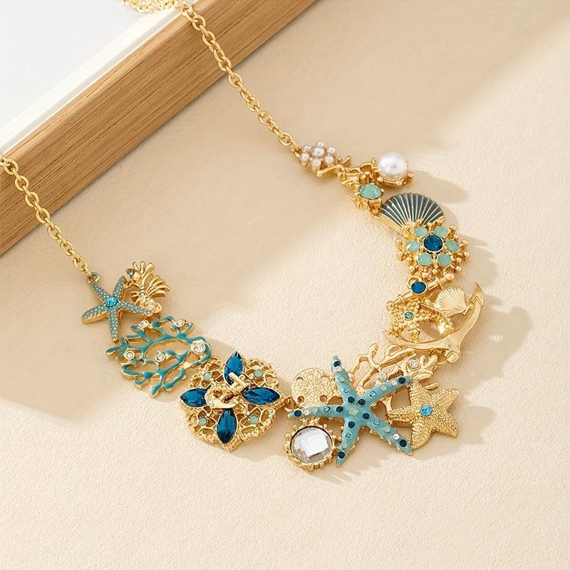 Elevate your beach style with this stunning alloy necklace featuring rhinestone-encrusted starfish, coral, shell, and anchor pendants.