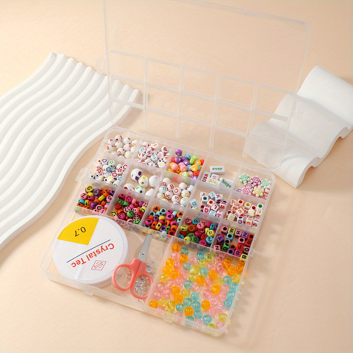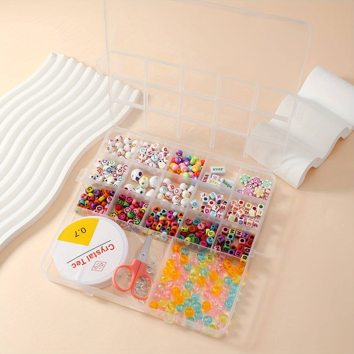 This 17 compartments box contains a variety of soft pottery beads, letter beads, glass rice beads for kids to create their own unique jewelry pieces. Perfect for educational and creative play.