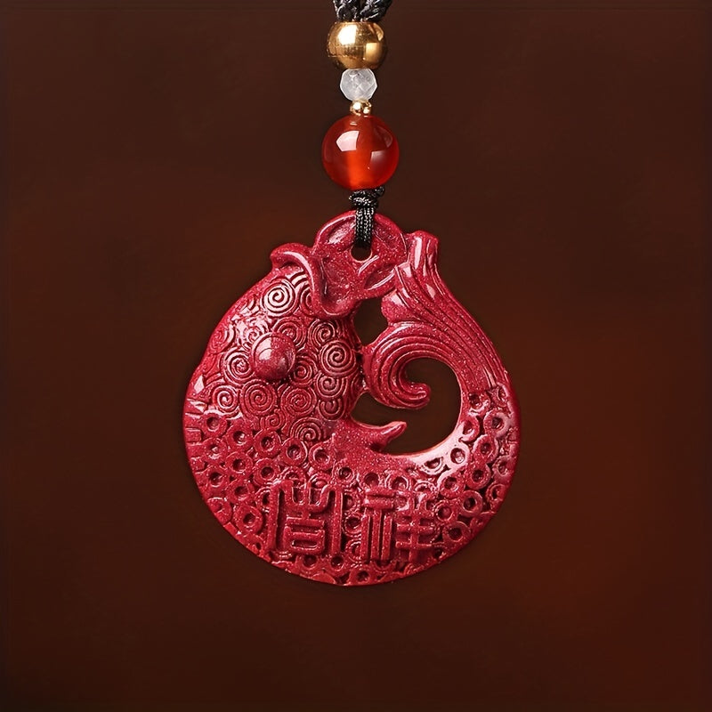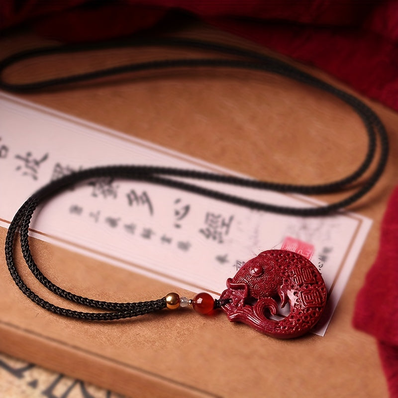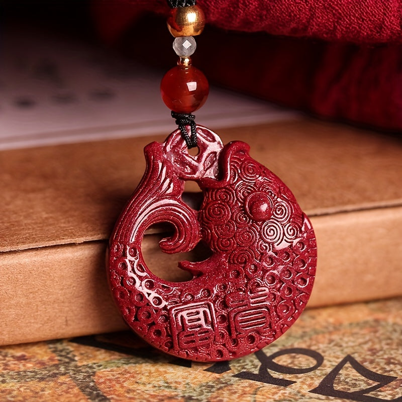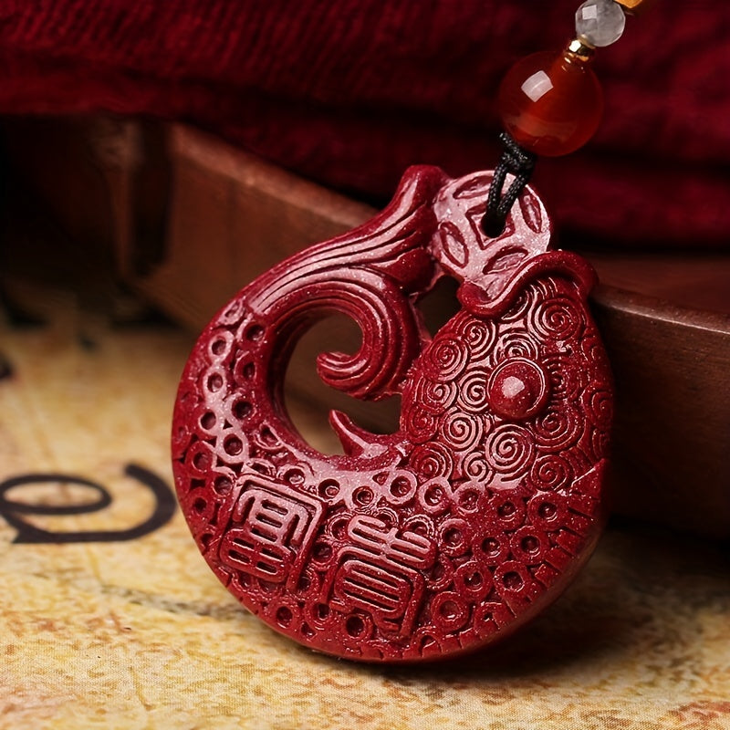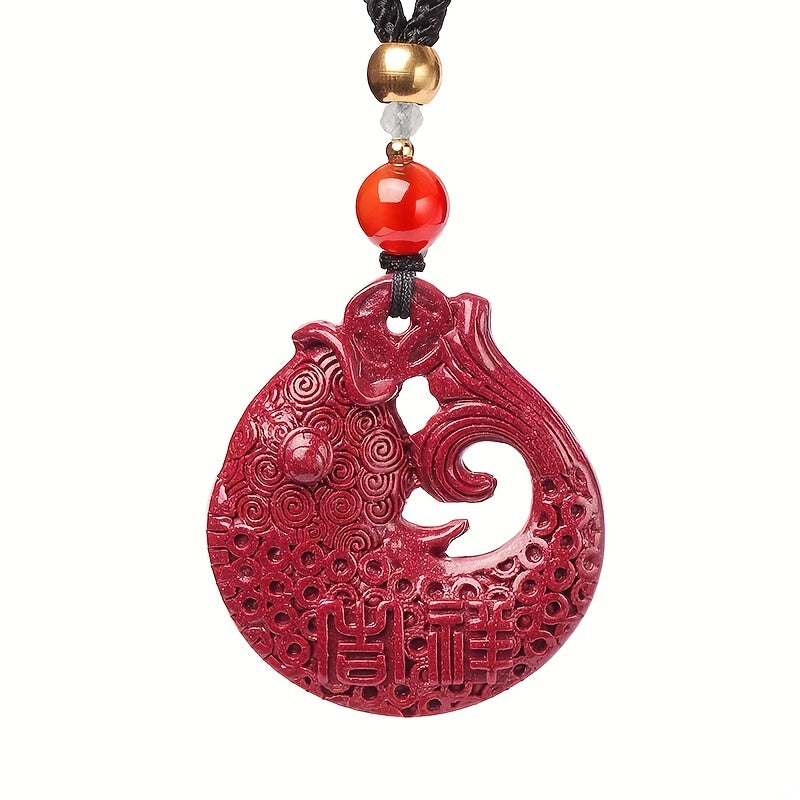 This beautiful fish-shaped pendant necklace is made of Chinese red cinnabar, symbolizing good fortune and luck. Add a touch of traditional Chinese charm to your outfit with this unique piece.