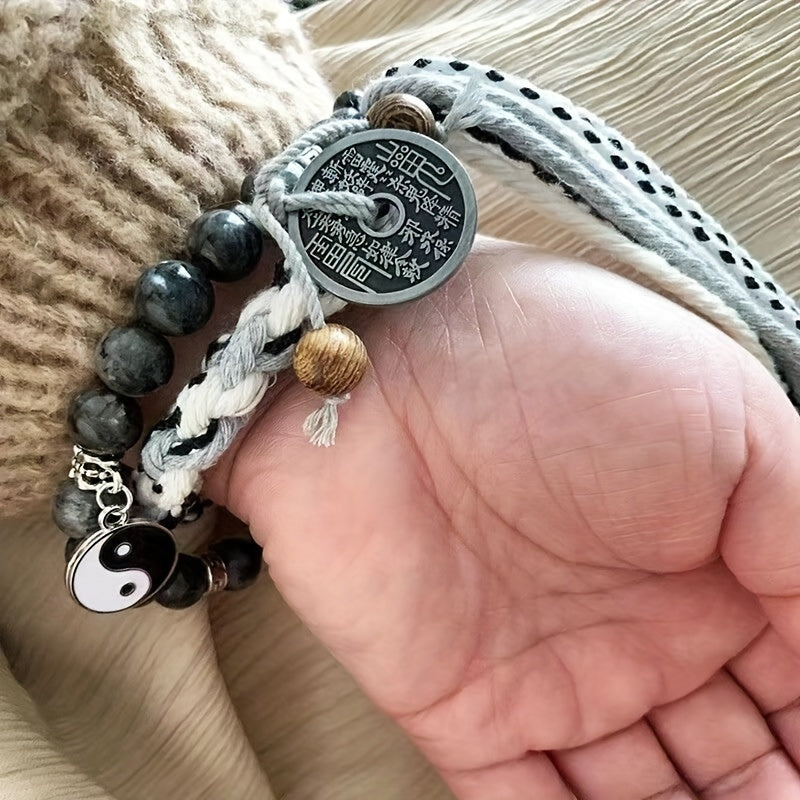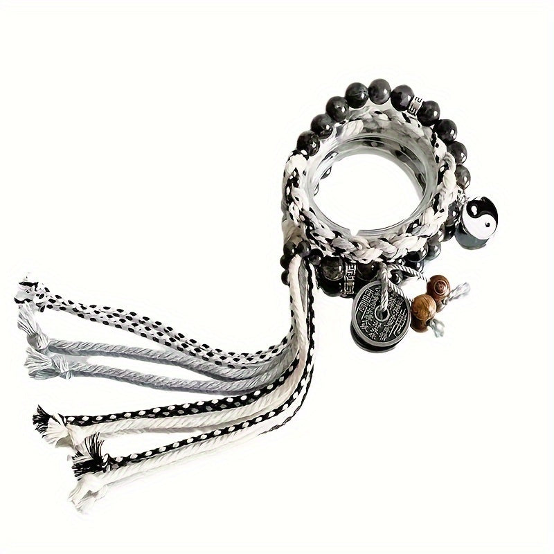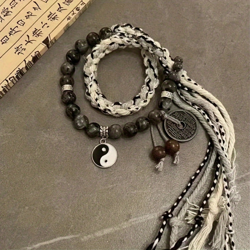 Embrace the harmony of Yin and Yang with this beautifully crafted Chinese style bracelet. Made of brass beads and tassels, this accessory symbolizes balance and tranquility.