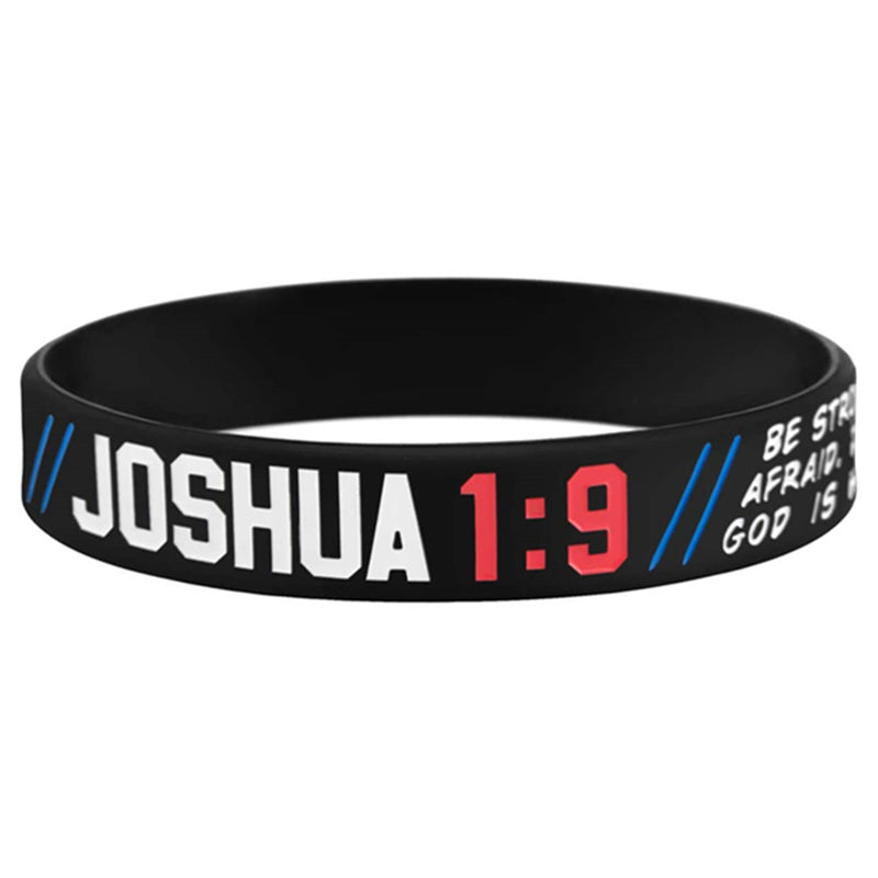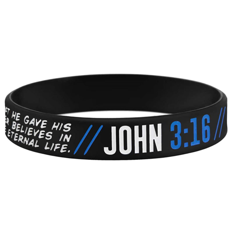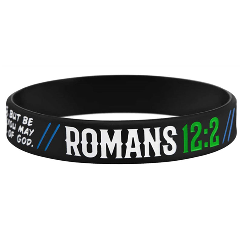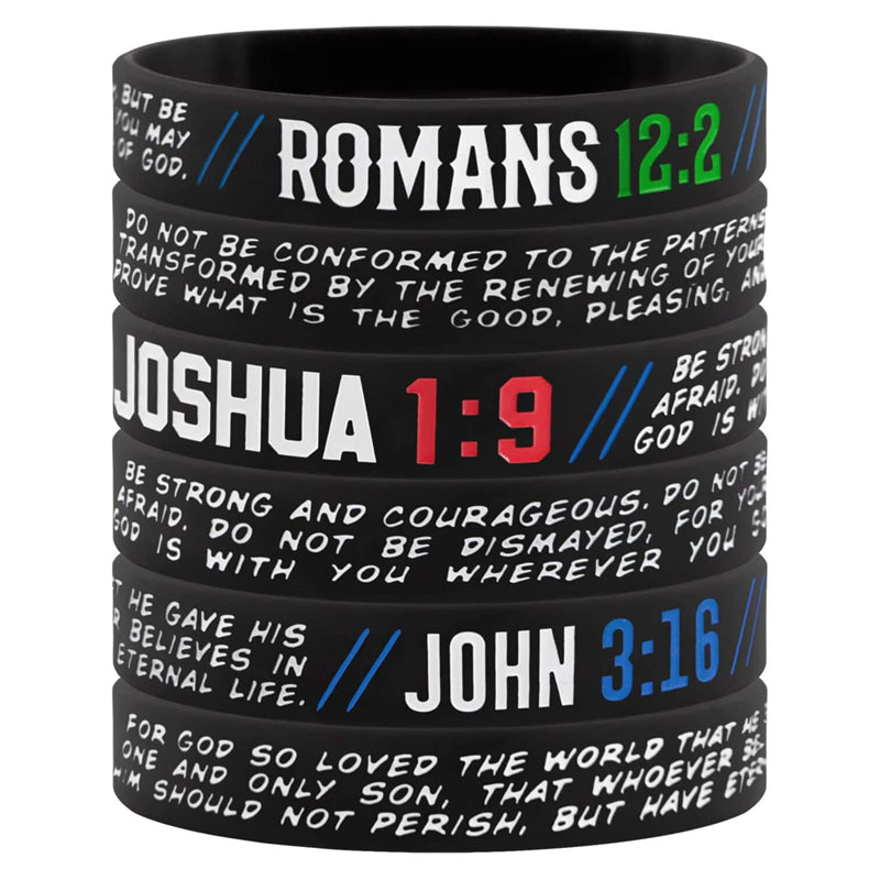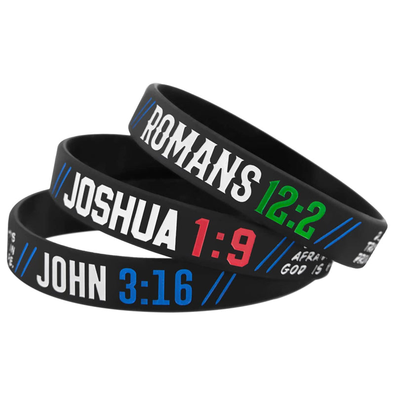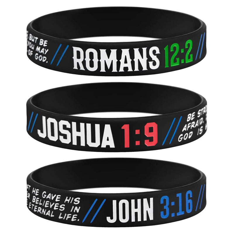 Wear your faith with these silicone wristbands featuring inspiring Bible verses John 3:16, Joshua 1:9, and Romans 12:2.